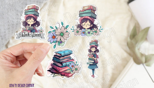 Bundle of Book Lovers Sticker Set BOPP, Books Sticker, Lady with books Stickers, Books and flowers stickers, book set of stickers