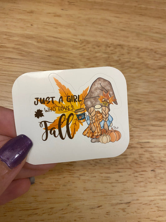 Just a Girl who loves Fall Gnome STICKER, Autumn Sticker, Holographic option, Cute Fall Gnome Design Sticker, Gnomie Love Fall design