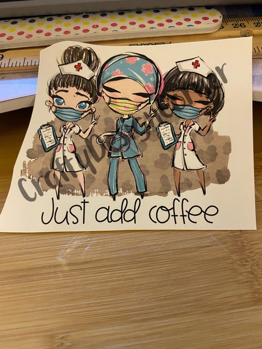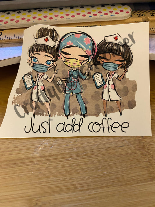 Just add Coffee Clear WATER SLIDE, Unique Tumbler Transfer, Iced Coffee WaterSlide, Nurses need coffee design