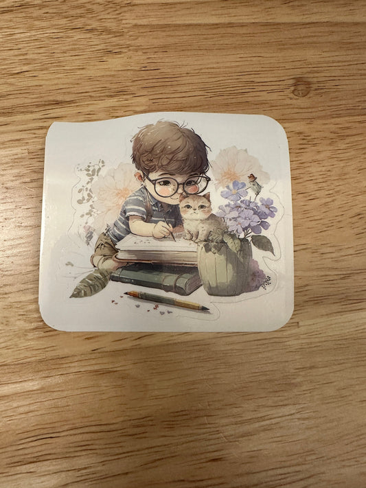 Little Boy studying with Cat Sticker, Cute Cat with Boy sticker, Holographic option, boy with books and cat, boy and cat