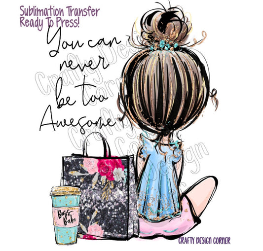 RTP You Can Never be Too Awesome Sublimation Transfer, Coffee Shopping Transfer, Ready to Transfer Sublimation, Add a name for free