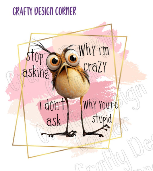 Stop Asking Why I'm Crazy I don't Ask Why You're Stupid JPeg/PNG Digital Download, Cute Chicken digital download, clipart