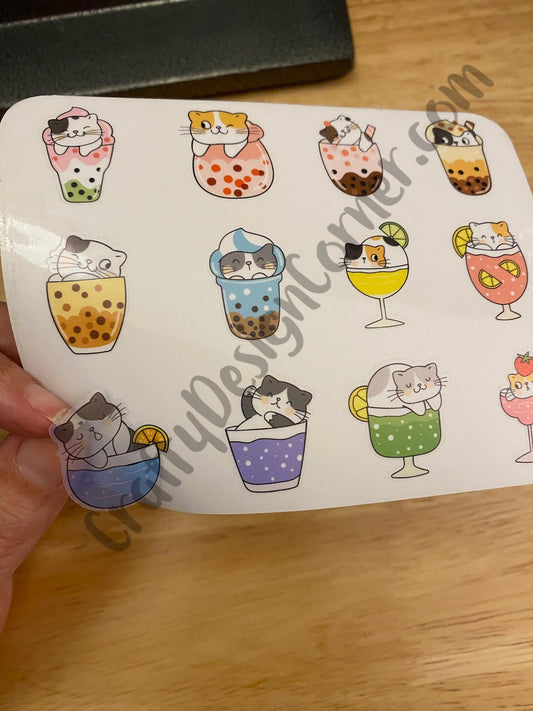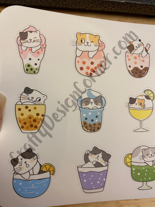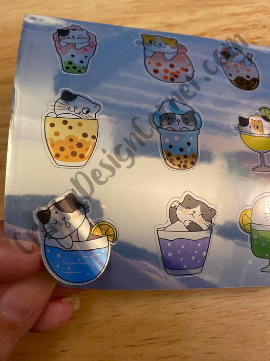 Silver Holographic Cat Boba Tea Stickers Sheet
