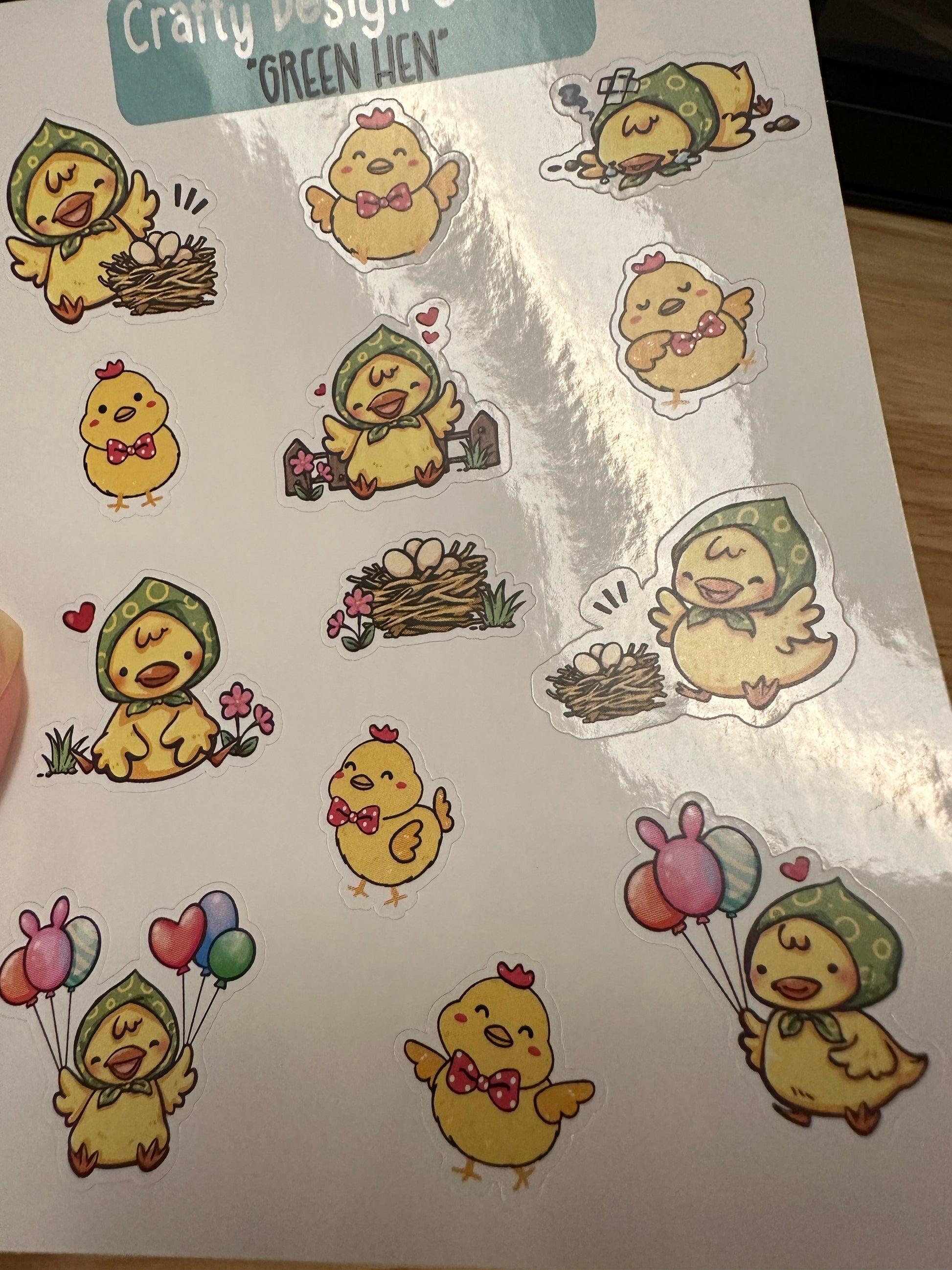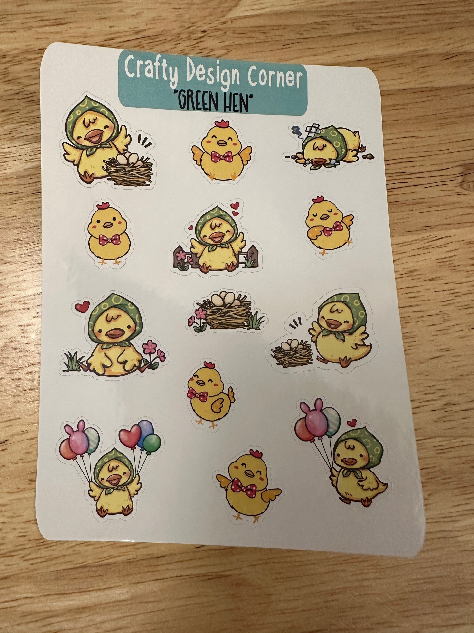 Green Hen Sticker sheet, this is printed on White sticker Paper and then cut around each sticker leaving a small white outline. Can add to any hard surface, idea for planners.