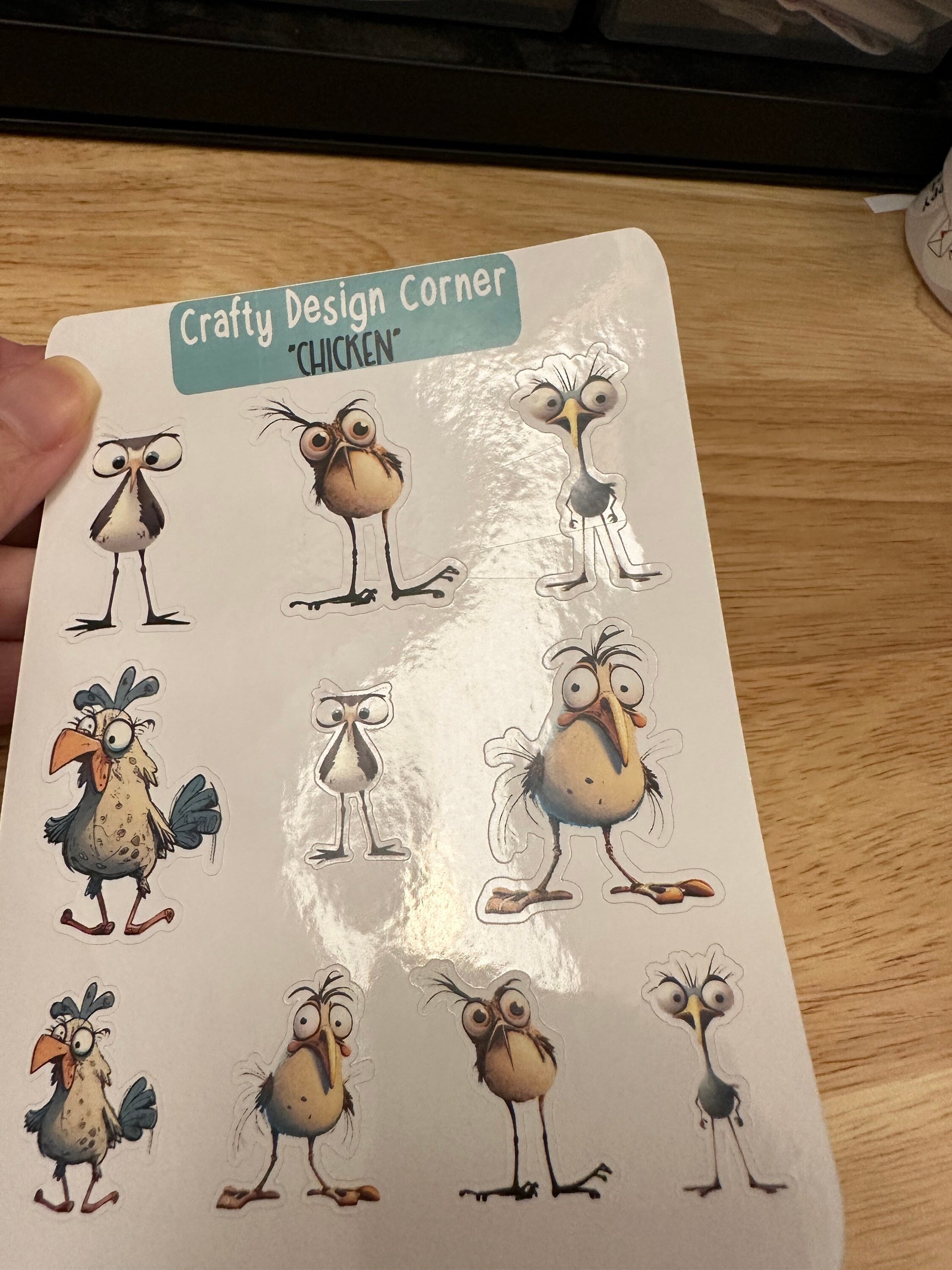 Crazy Chicken Sticker sheet, this is printed on White sticker Paper and then cut around each sticker leaving a small white outline. Can add to any hard surface, idea for planners.