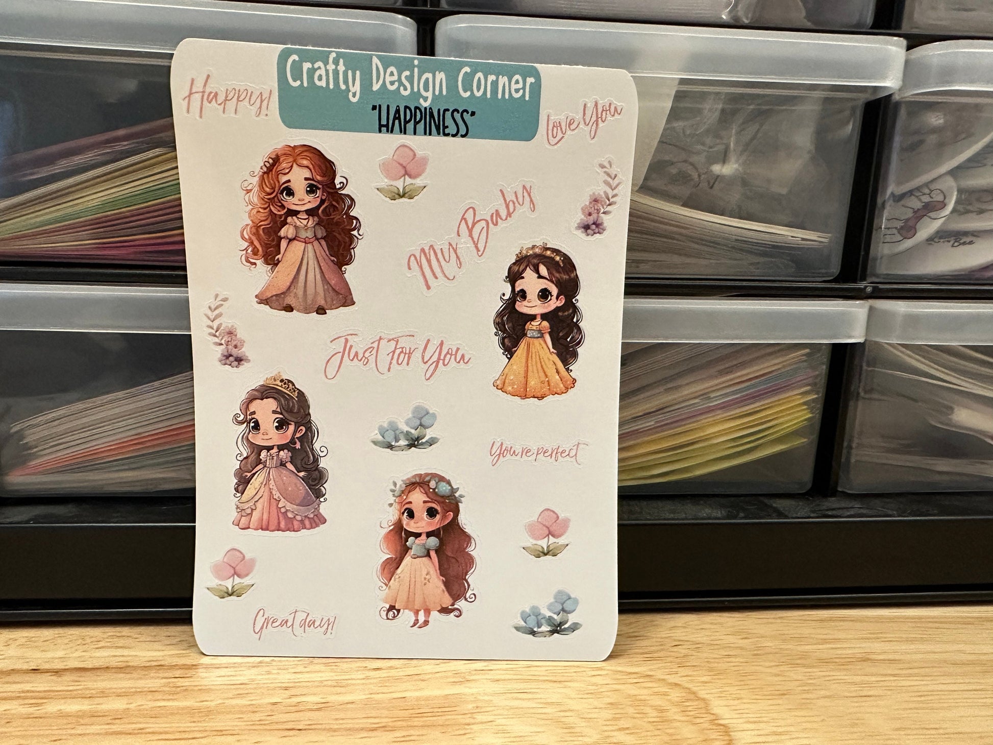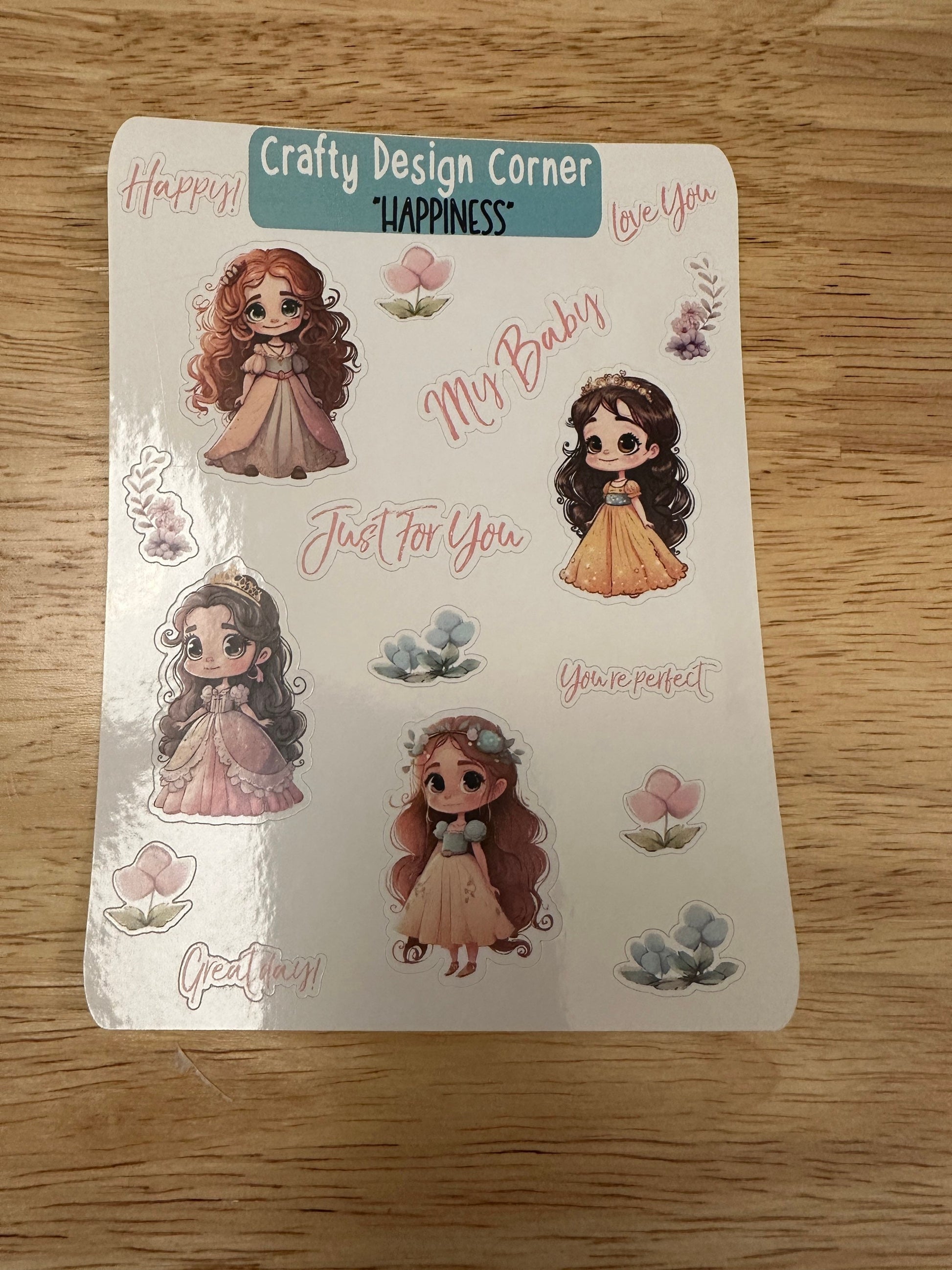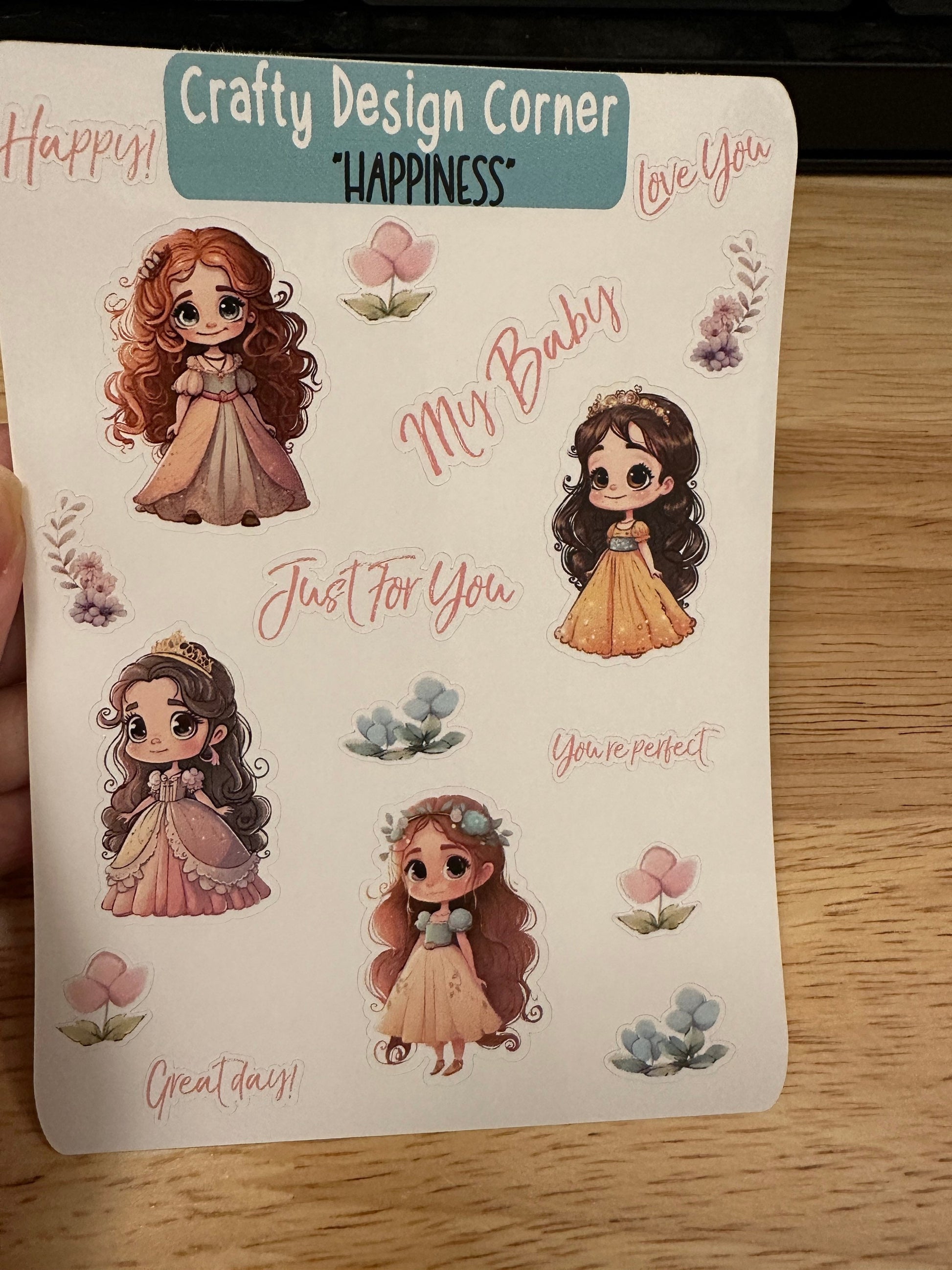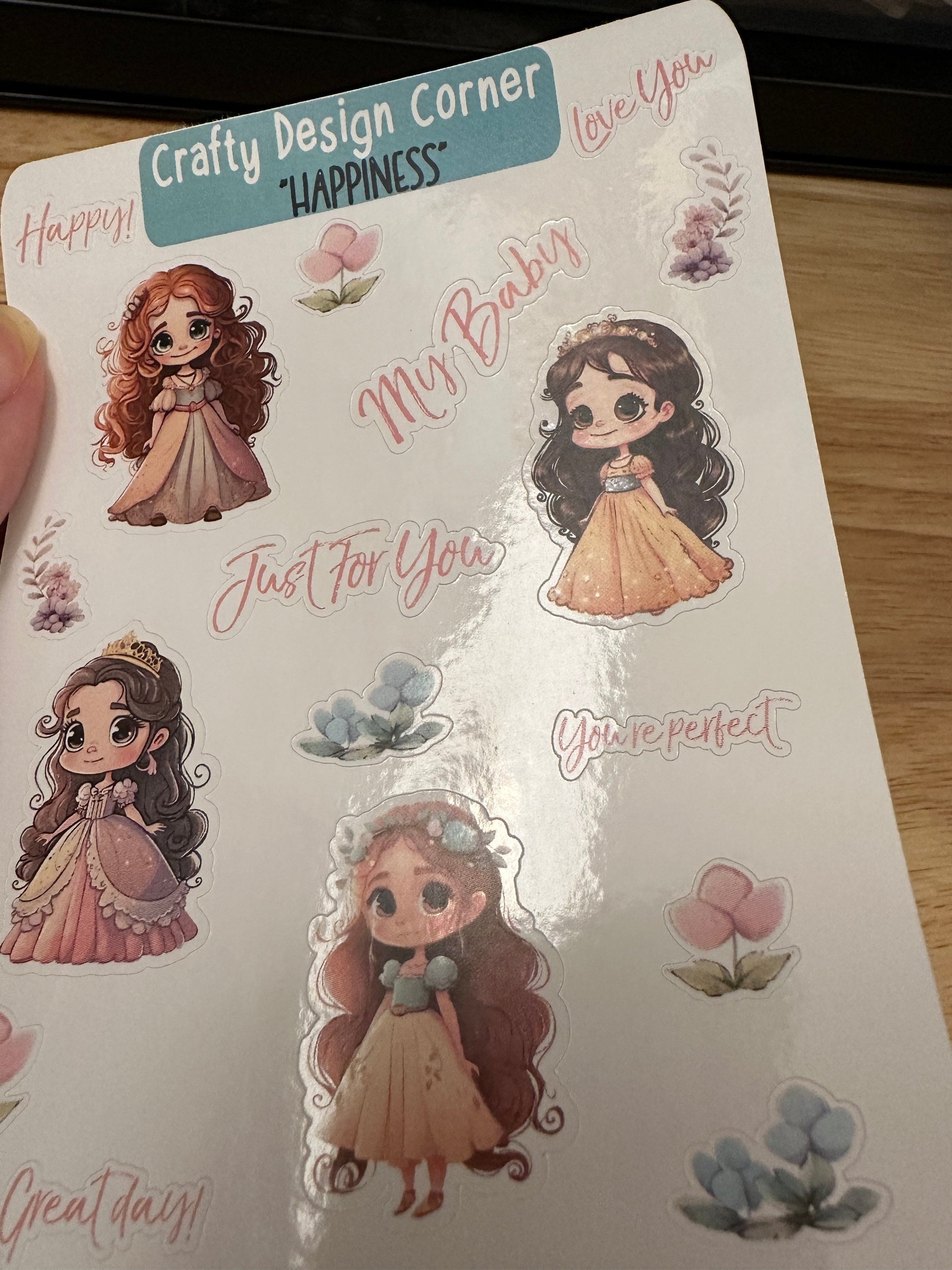 Girl with long hair sheet, this is printed on White sticker Paper and then cut around each sticker leaving a small white outline. Can add to any hard surface, idea for planners.
