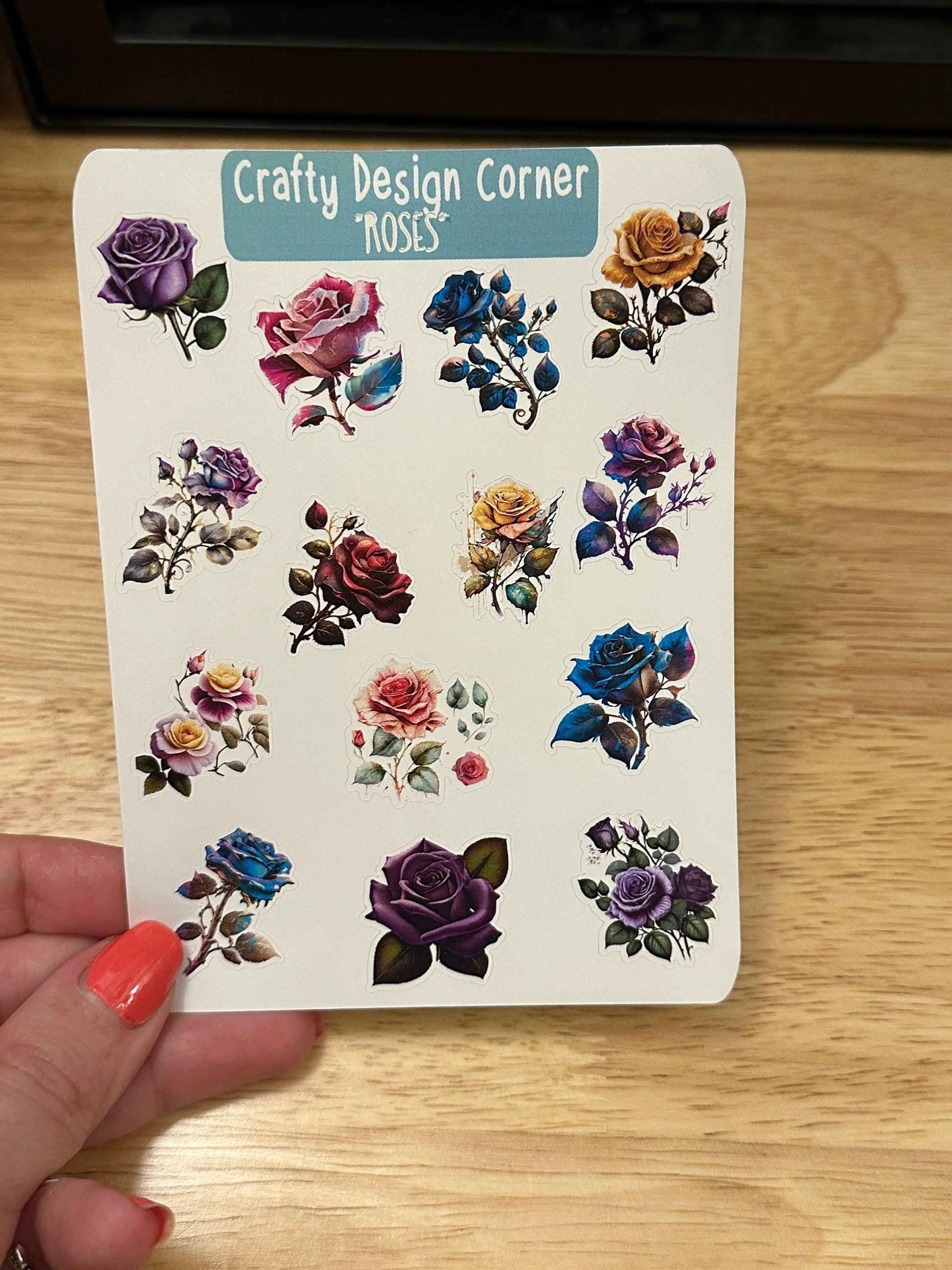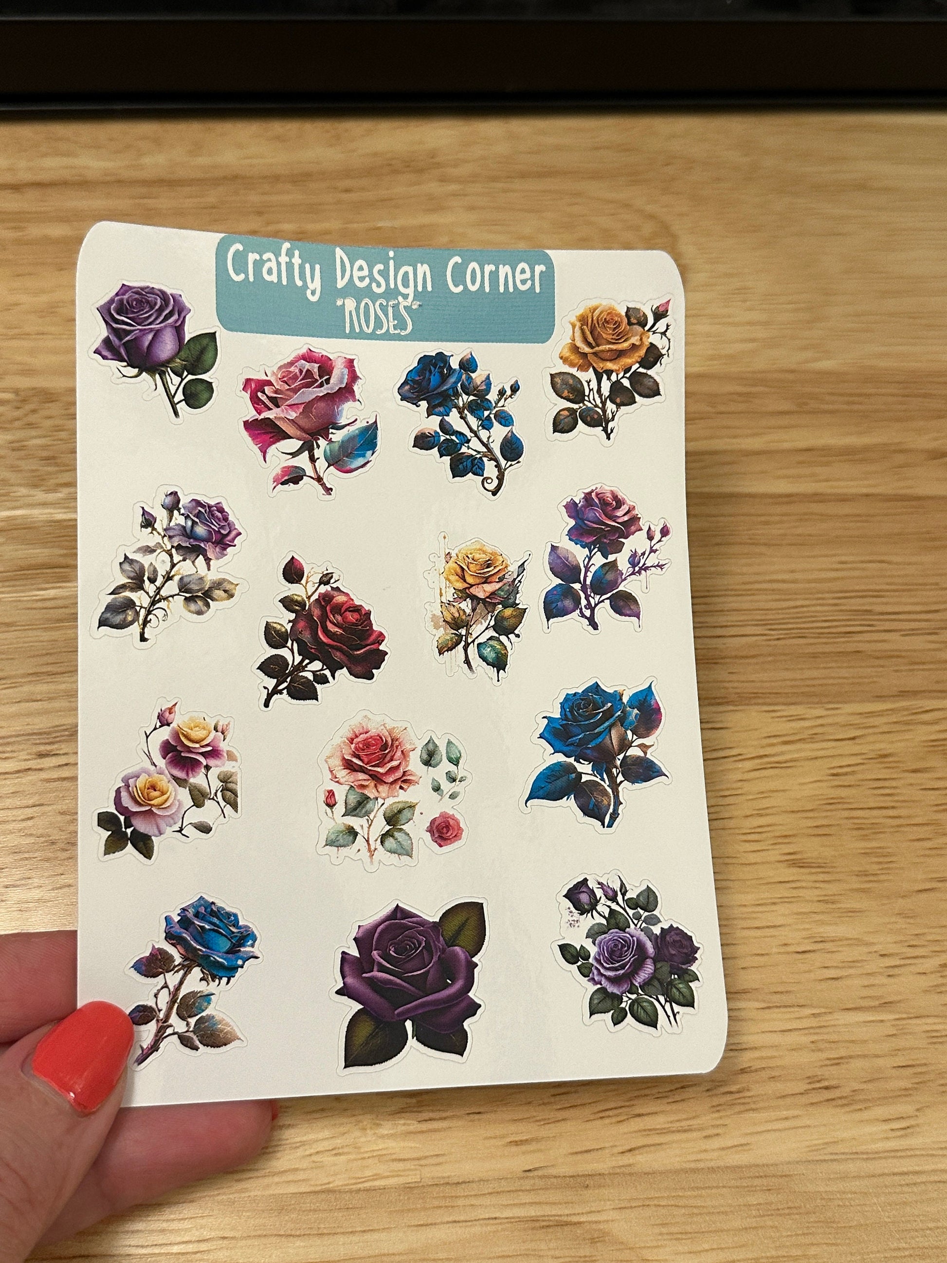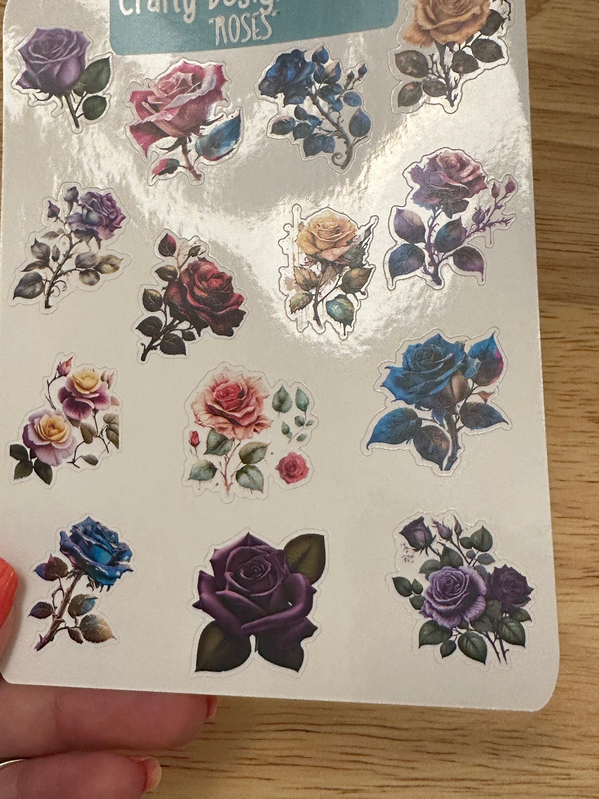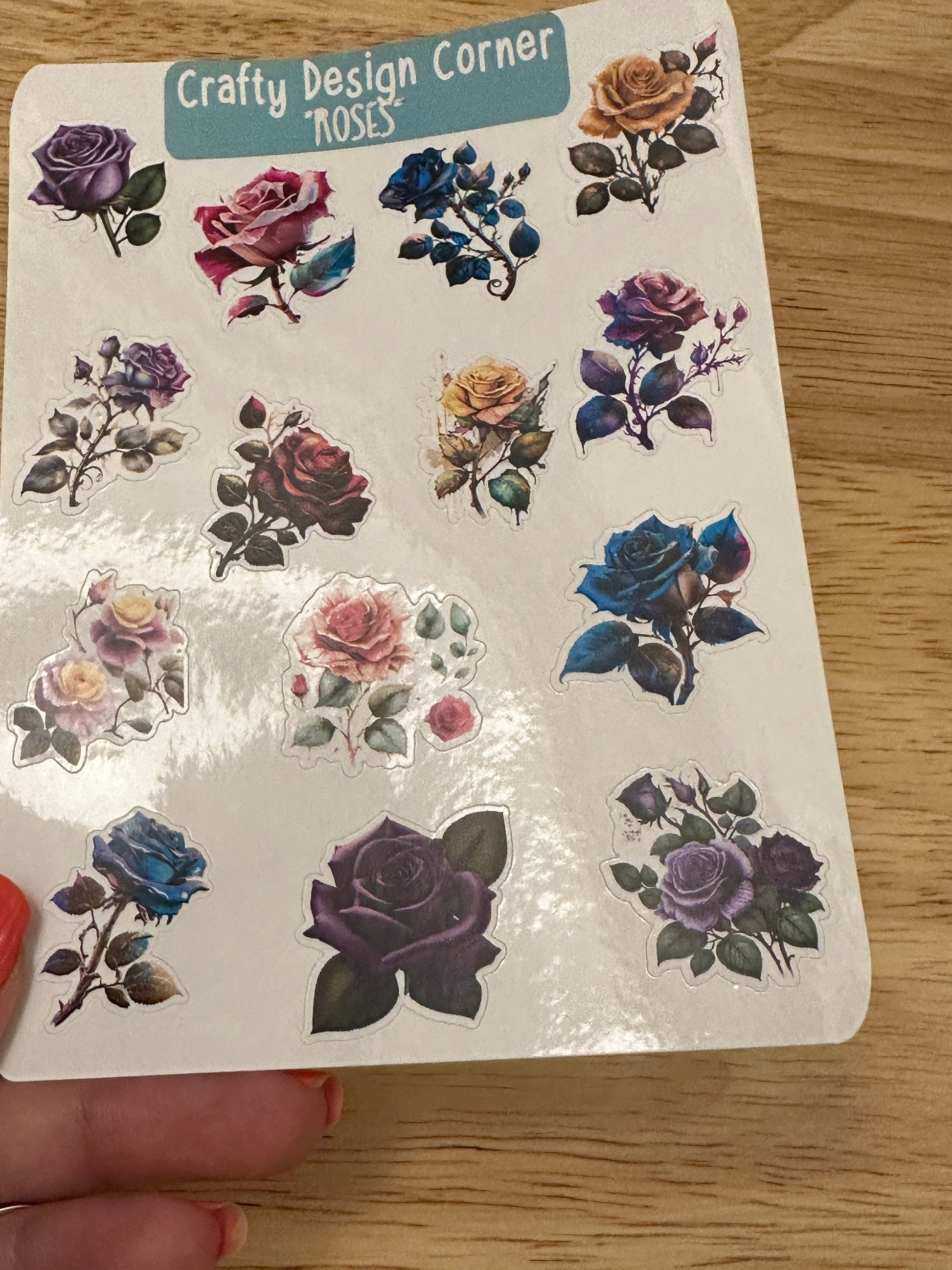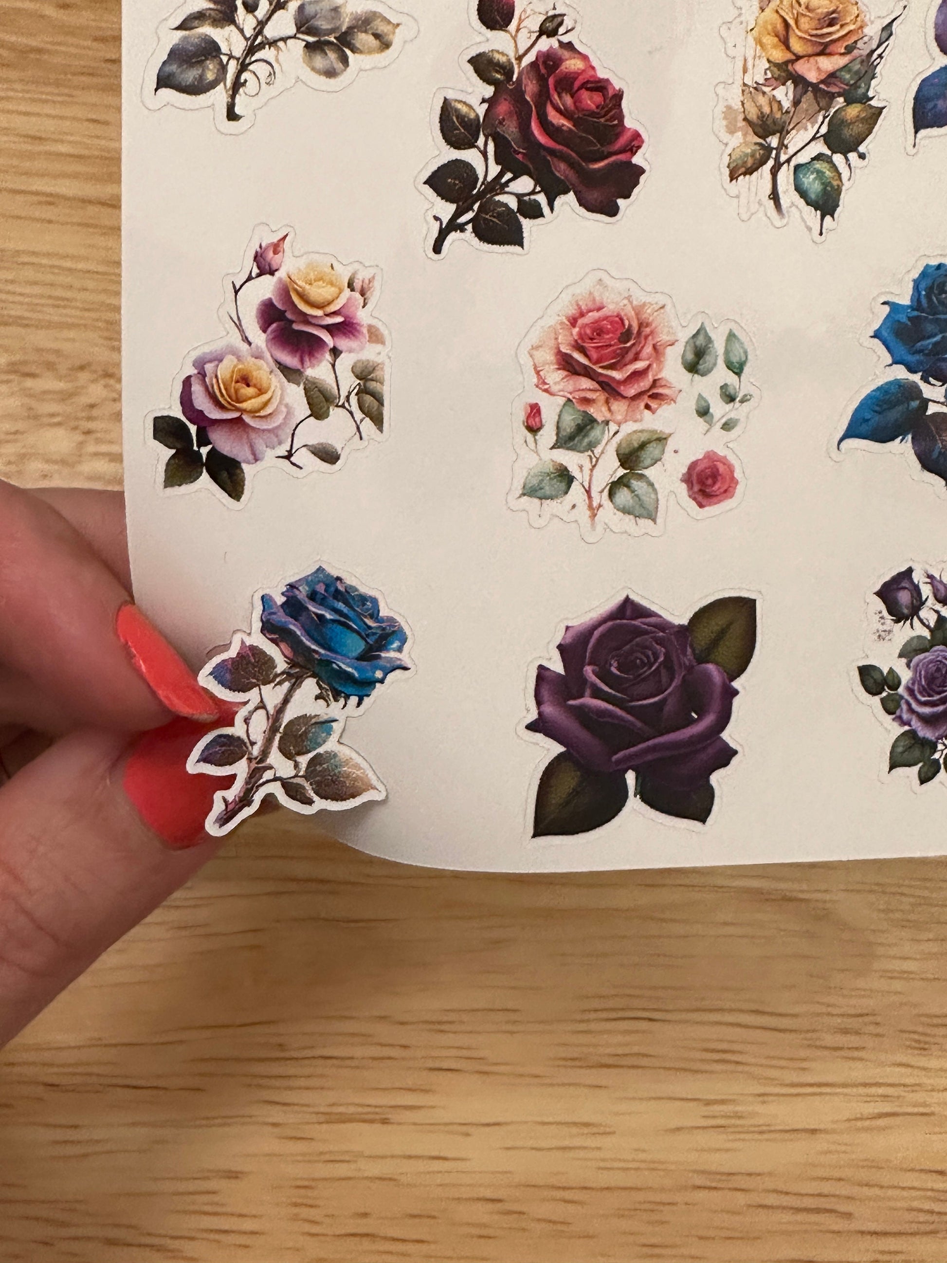 Rose Sticker sheet, this is printed on White sticker Paper and then cut around each sticker leaving a small white outline. Can add to any hard surface, idea for planners.