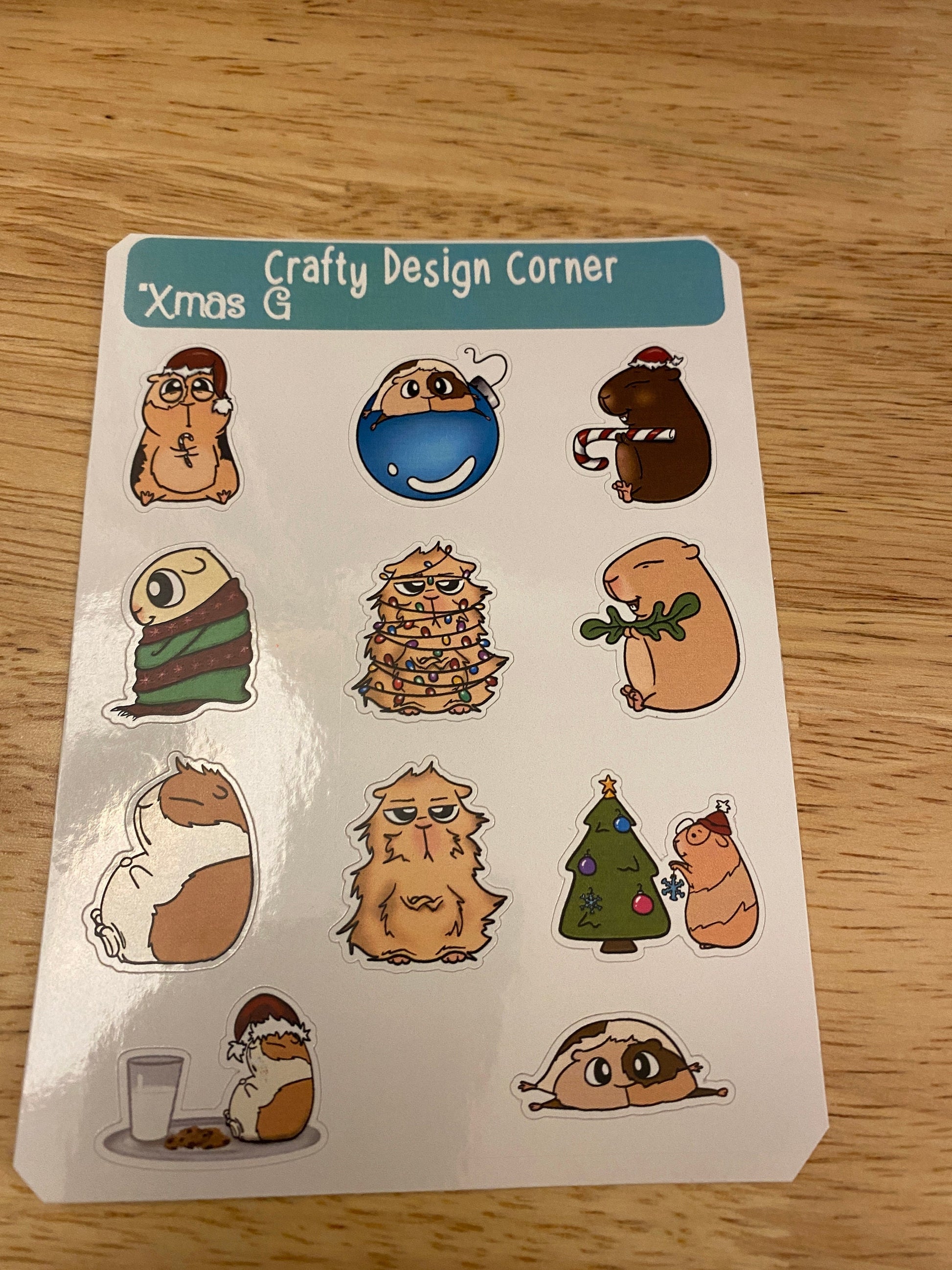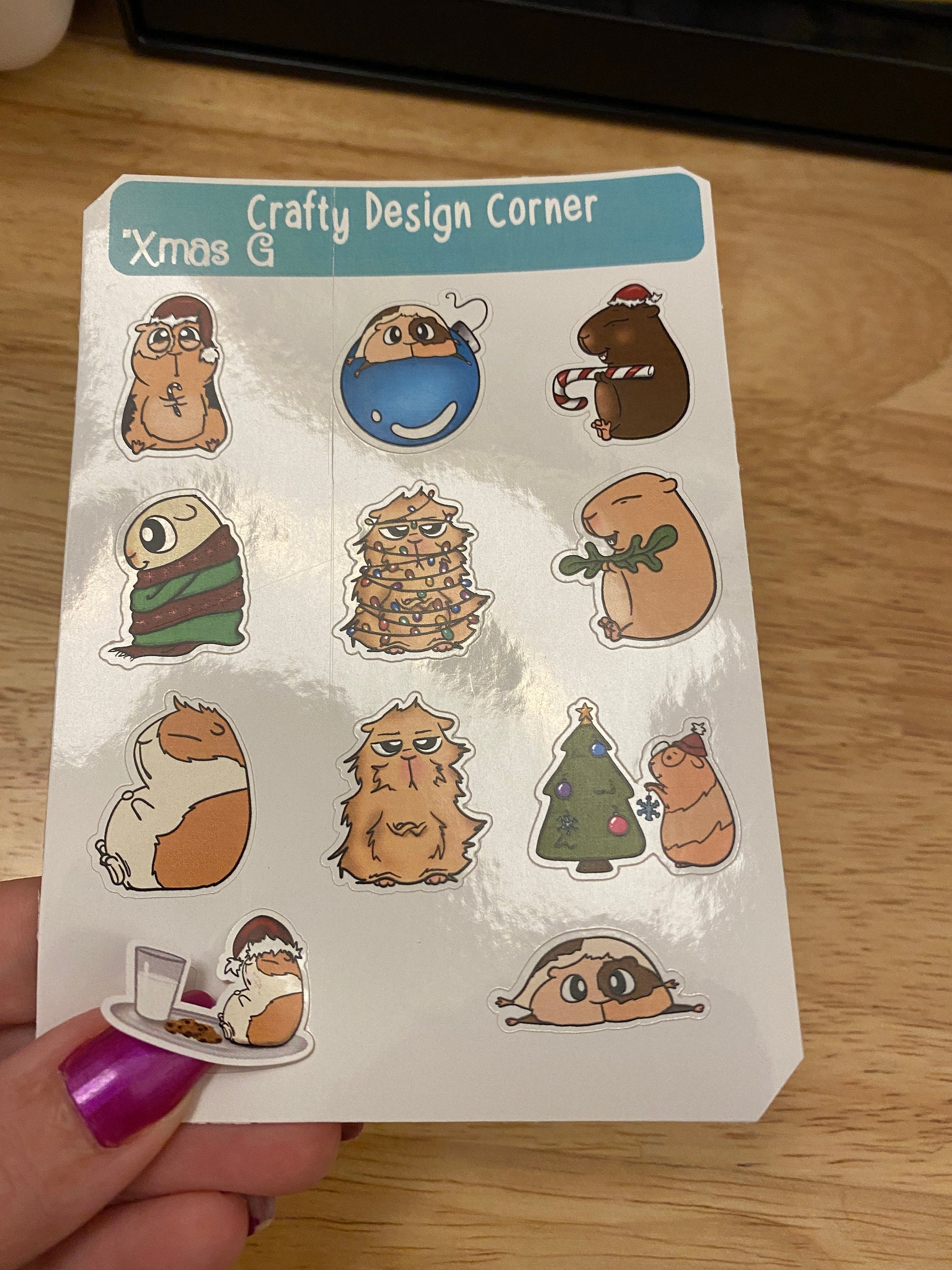 1" Xmas Guinea Pig STICKERS SHEET, this is printed on White Matte Sticker Paper or White Glossy Paper and then cut around each sticker leaving a small white outline. Can add to any hard surface, idea for planners.