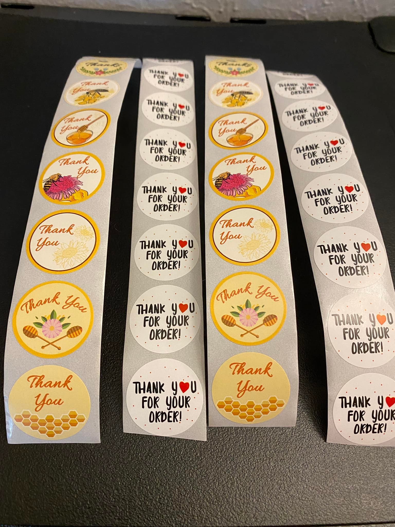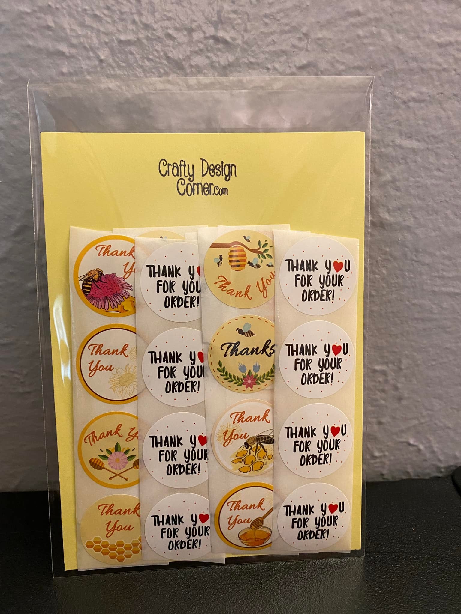 32 Bee Thank you Stickers, cute 1 inch round stickers, as seen in photos, there is 32 Stickers of the design of the 1 inch round stickers shown above.