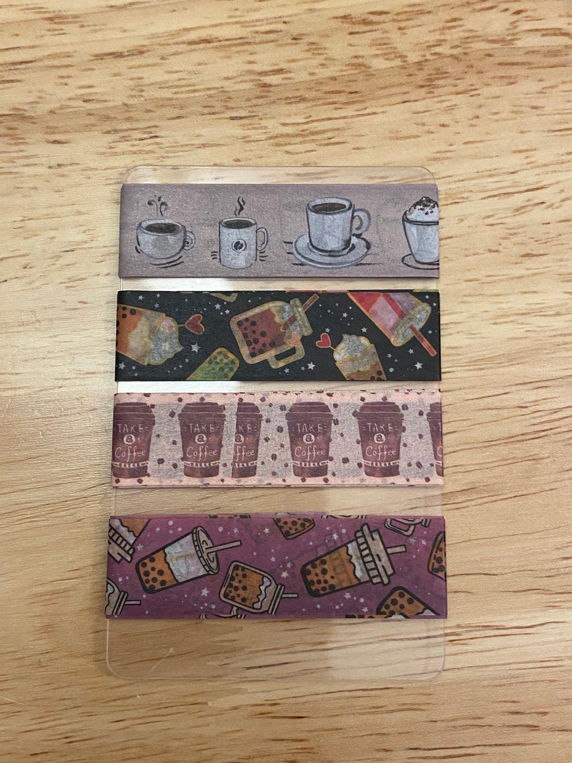 Medium Sample Card of (4) Washi Tapes with Coffee and Iced Coffee and Boba Tea Designs Washi Tape, that fits in the Washi Tape Storage Box, Additional Blank cards can also be ordered.