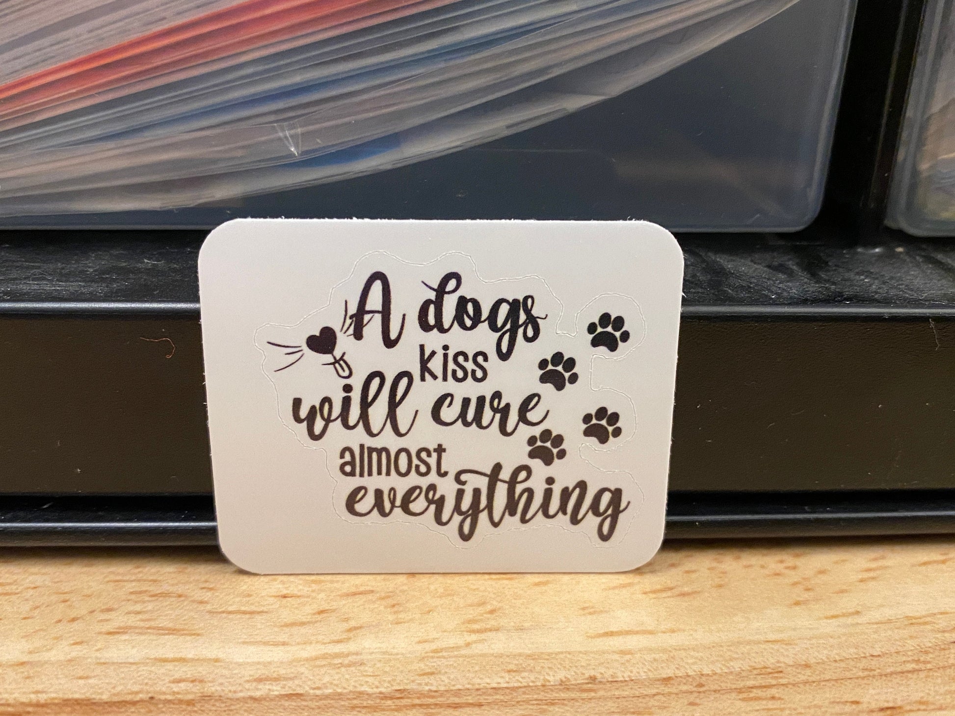 A Dog Kiss will cure almost everything Sticker. Stickers are printed on very strong White Vinyl type of Paper and then cut around each sticker leaving a small white out-lining. They can be added to almost any hard non-textured surface. Great to decorate your laptop.