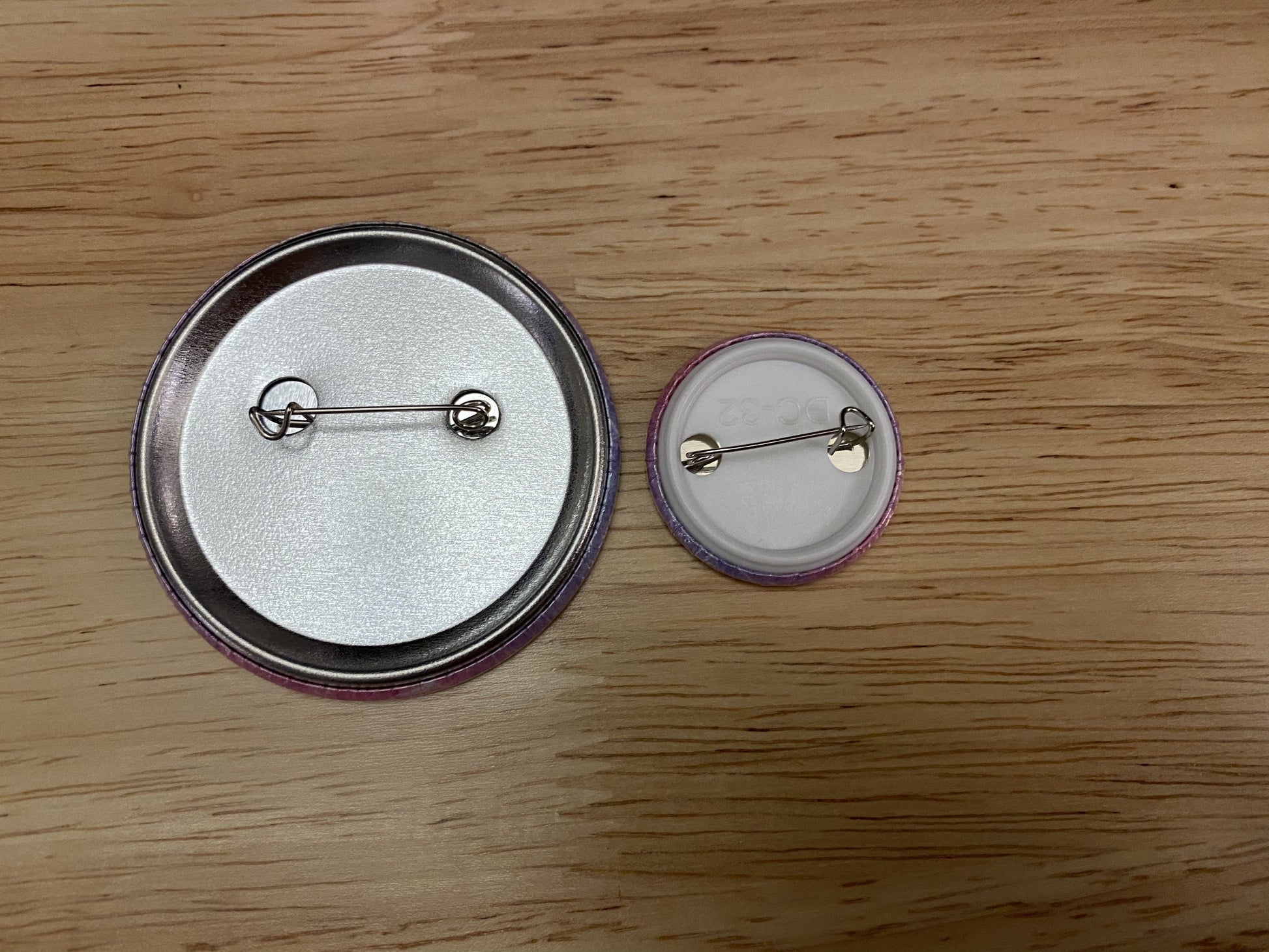 Each button measure 1.25 inches in diameter and is hand-pressed with care, backing may be off center. For 1.25" buttons may have plastic or aluminum backing.