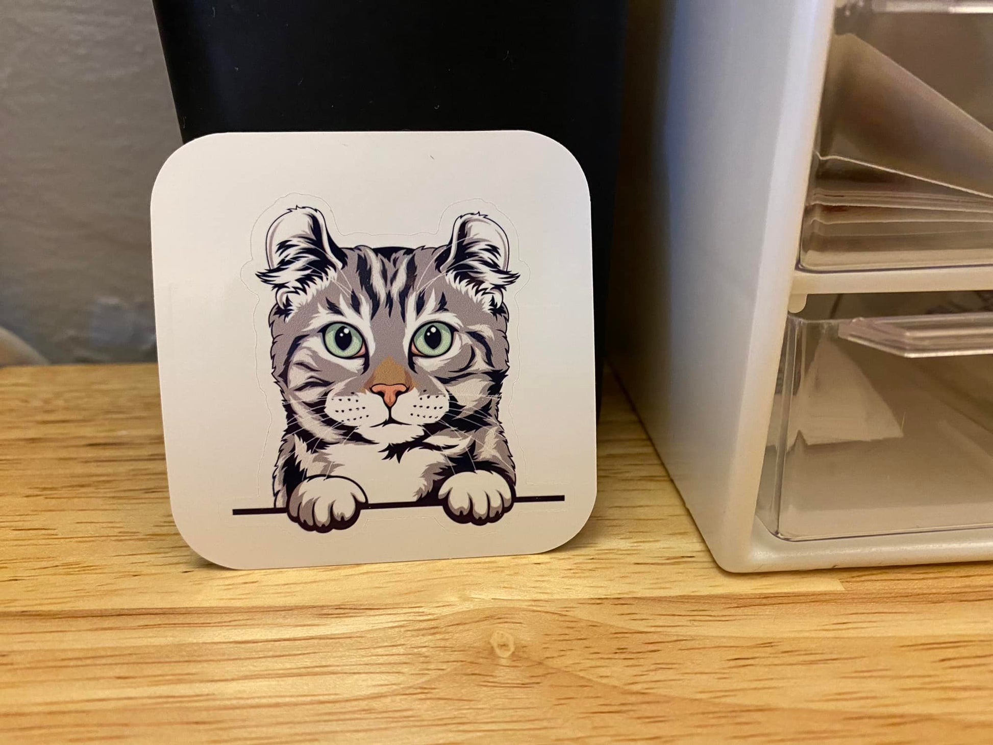 American Curl cat STICKER. Stickers are printed on very strong White Vinyl type of Paper and then cut around each sticker leaving a small white out-lining. They can be added to almost any hard non-textured surface. Great to decorate your laptop.