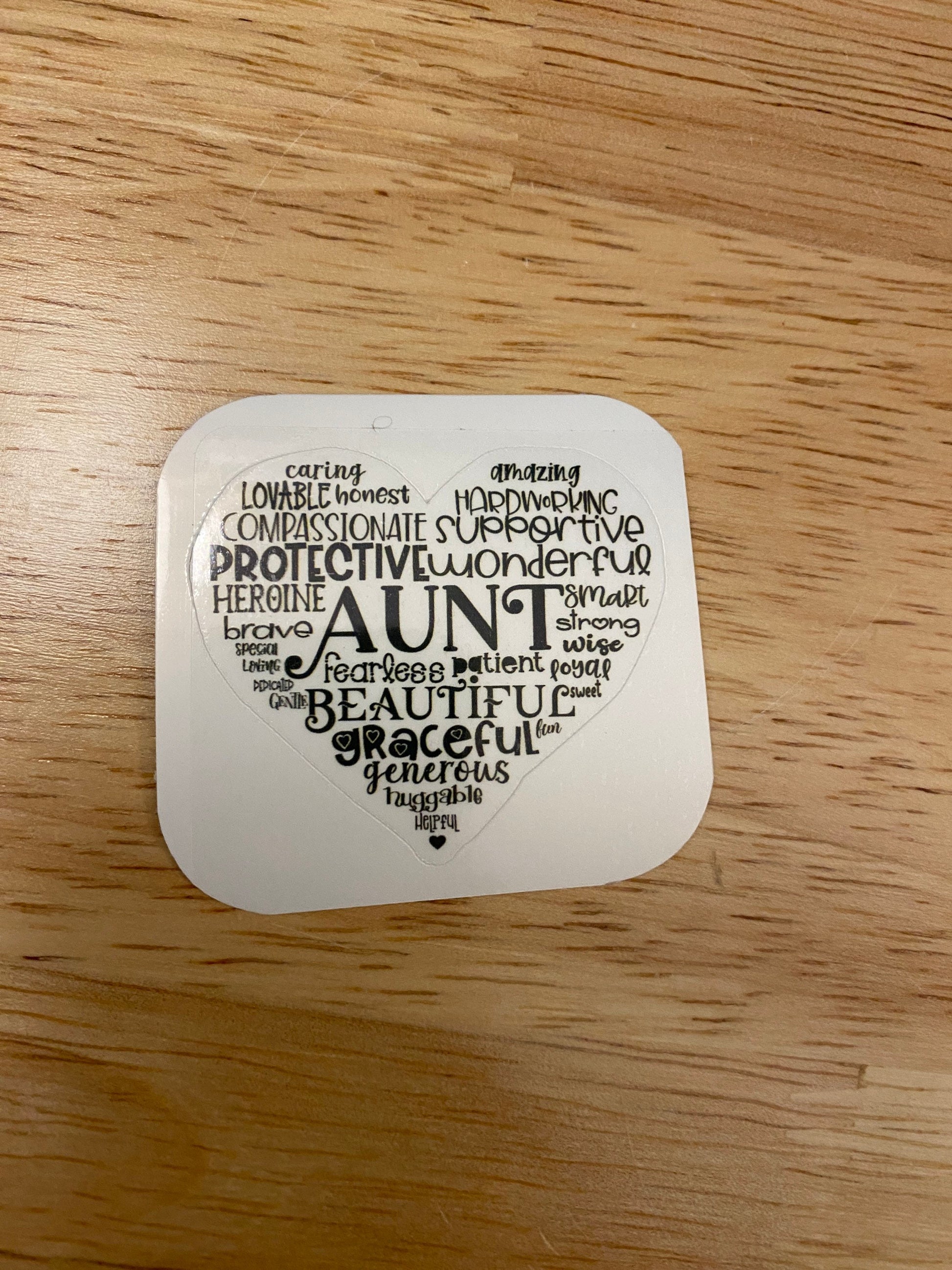 Heart Aunt Sticker. This is printed on very strong White Vinyl type of BOPP Paper and then cut around each sticker leaving a small white outline.They can be added to almost any hard non-textured surface. Great to decorate your laptop.