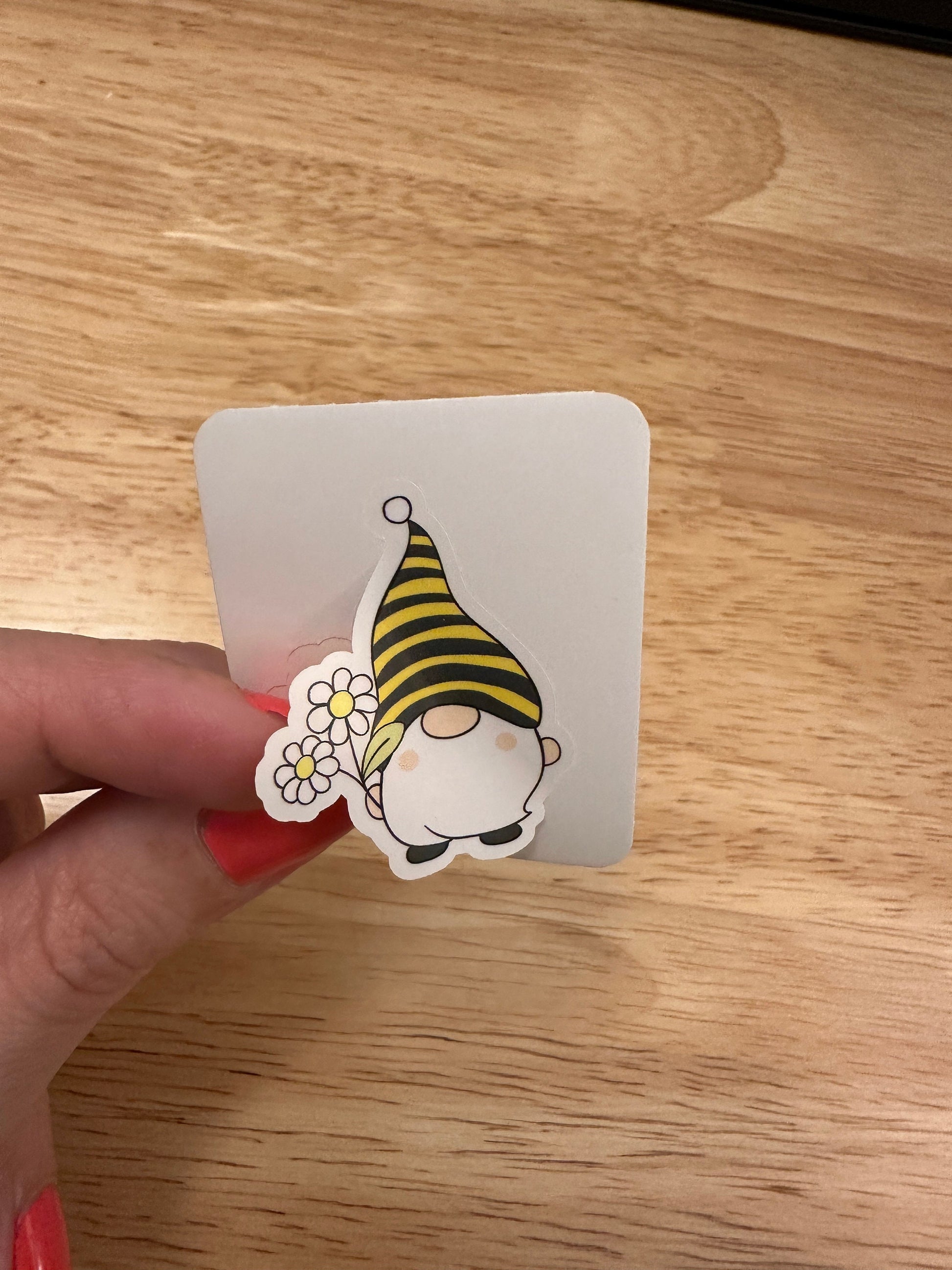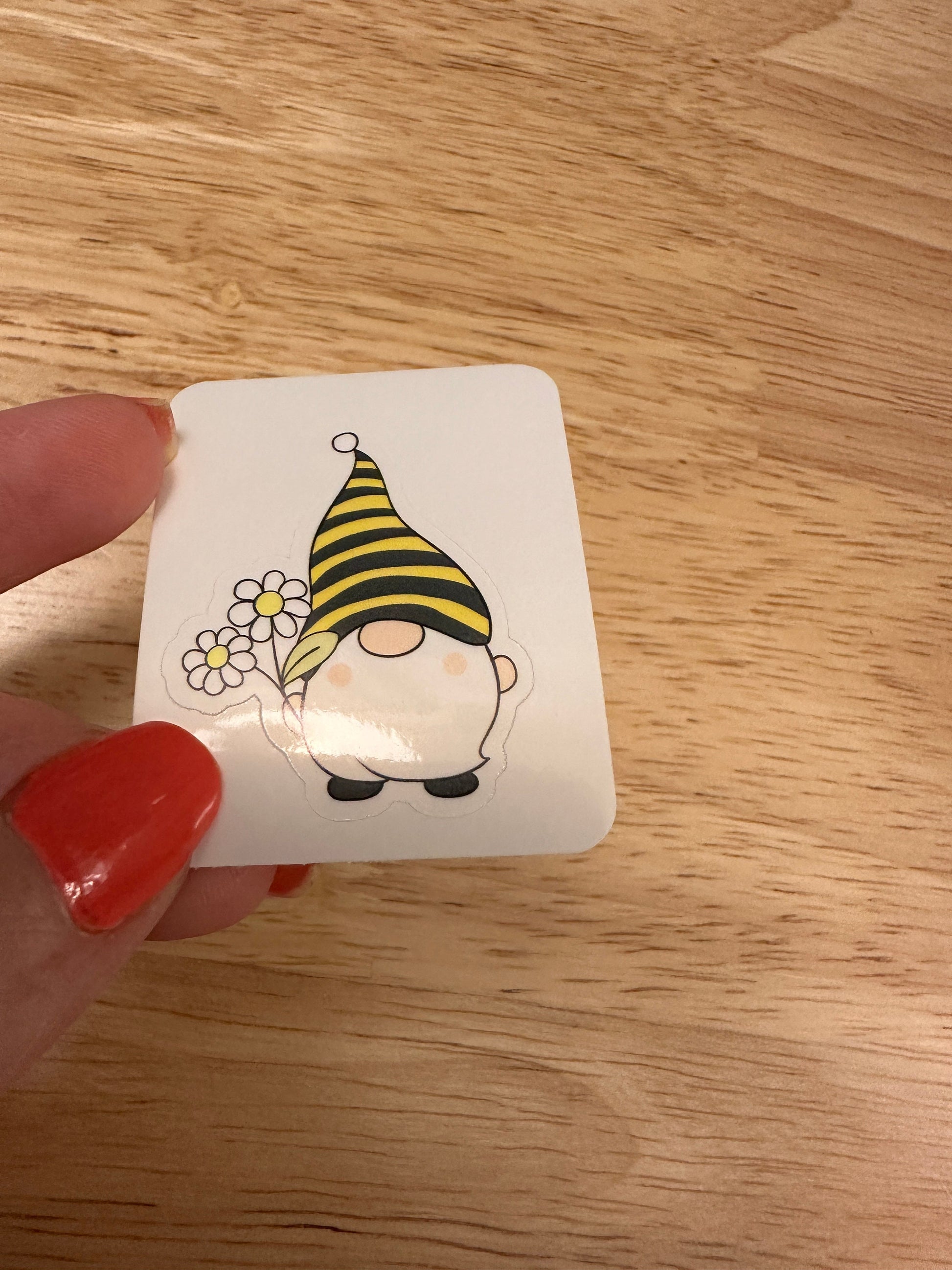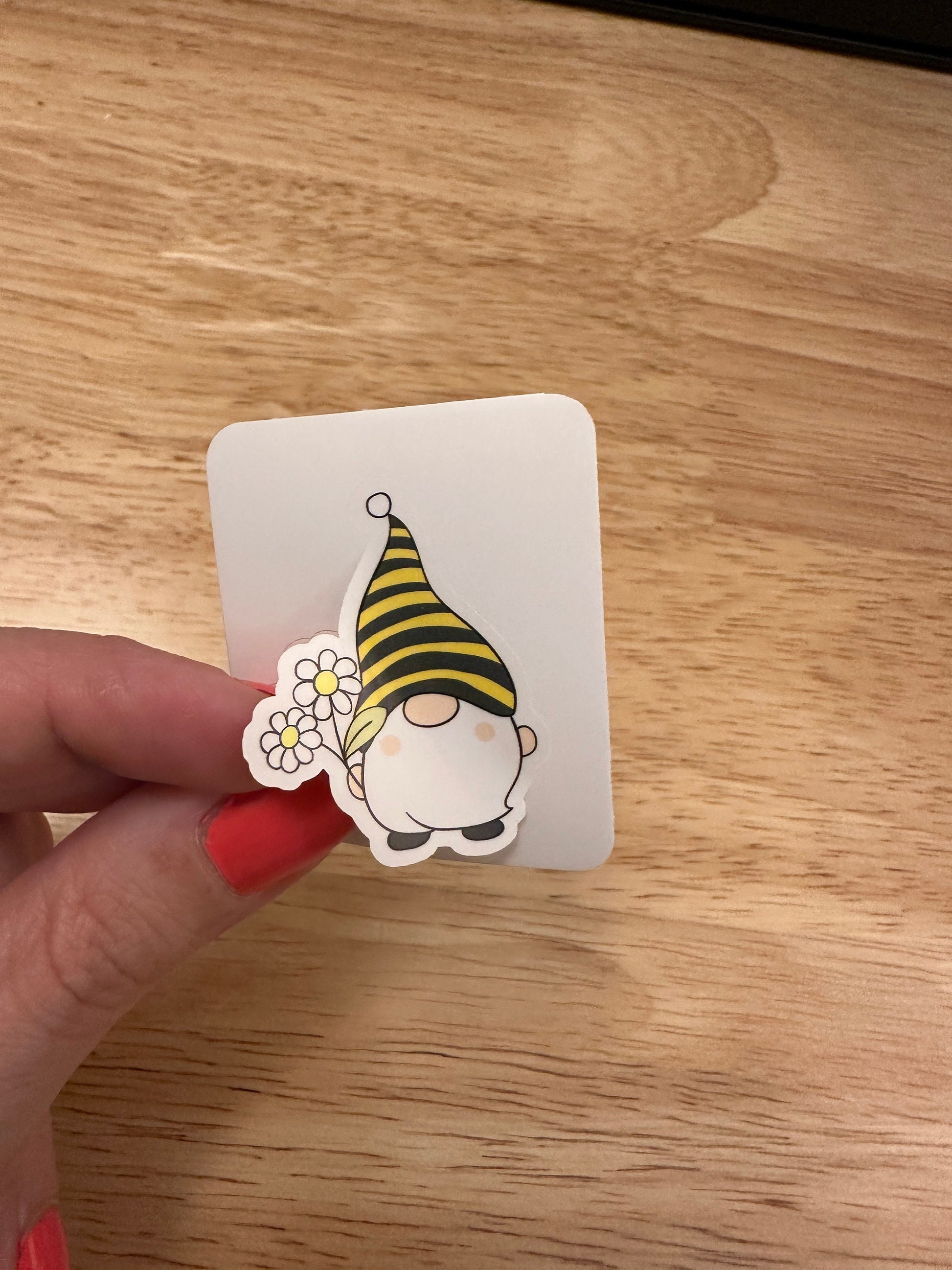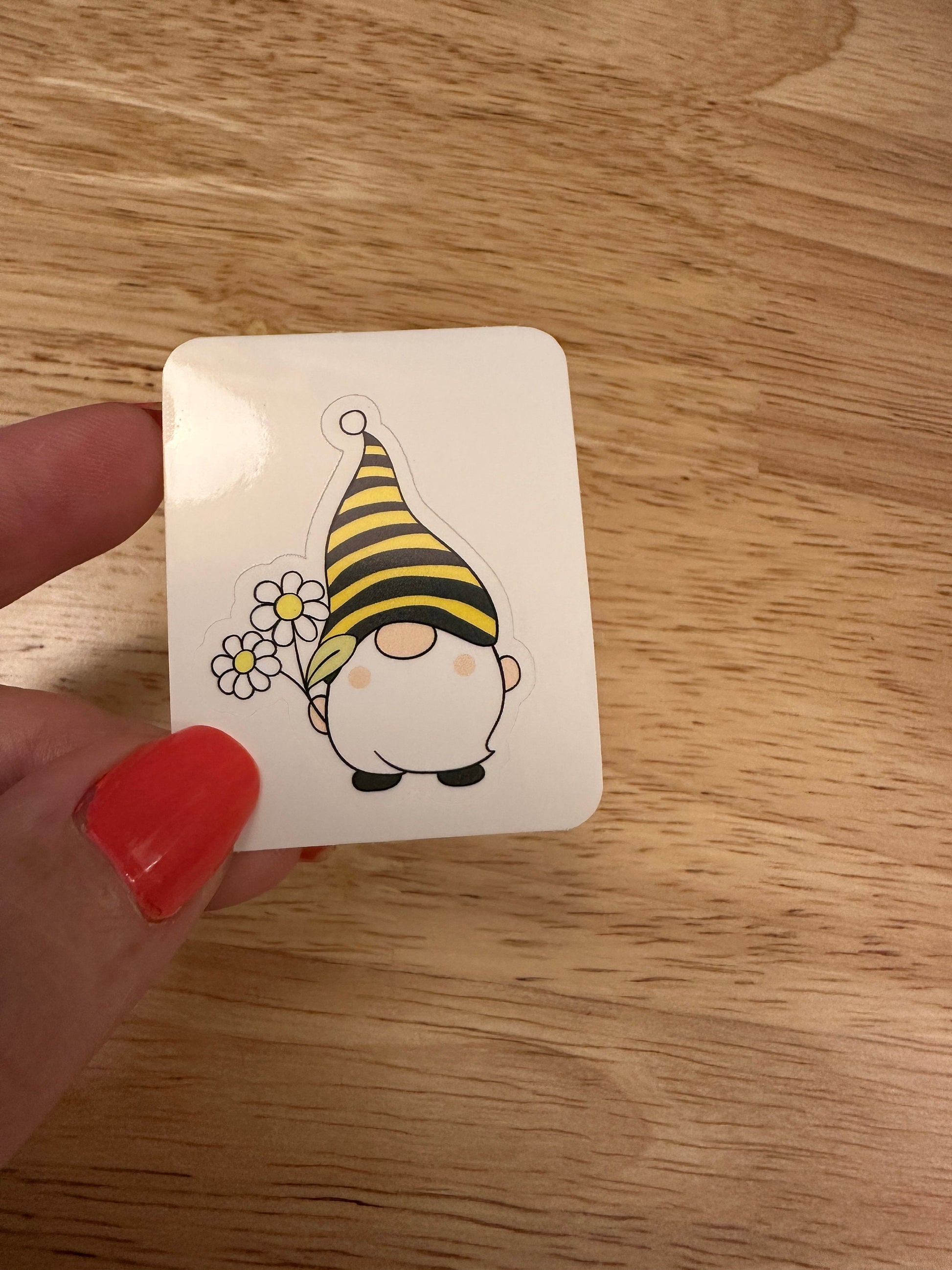 Bee Gnome with Daisy Sticker. Stickers are printed on very strong White Vinyl type of Paper and then cut around each sticker leaving a small white out-lining. They can be added to almost any hard non-textured surface. Great to decorate your laptop.