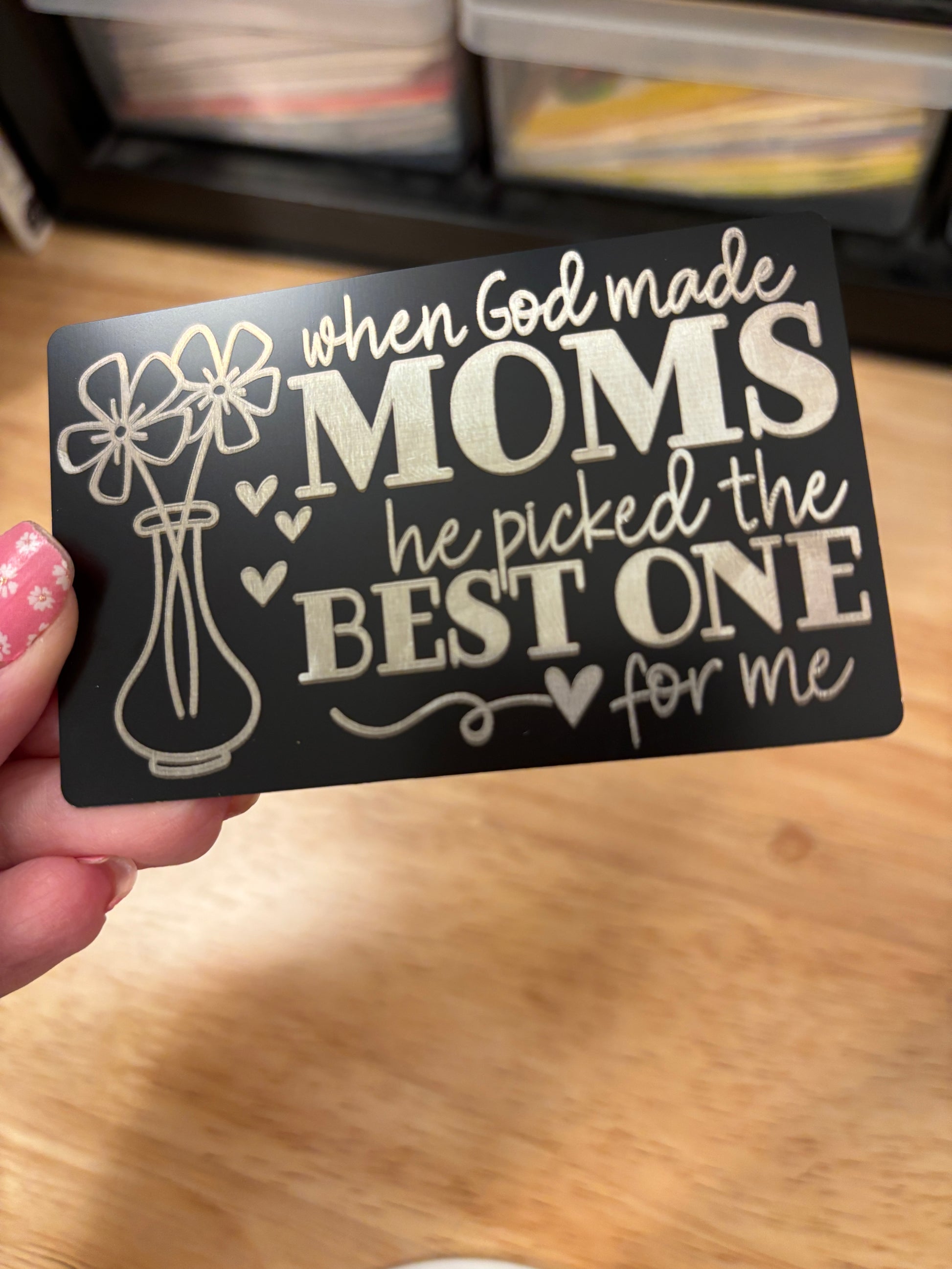 When God Made Moms he picked the Best one for me, colorful aluminum card, great for mom to stick in her wallet and look at when needing a god pick me up, or put up at work or dresser.
