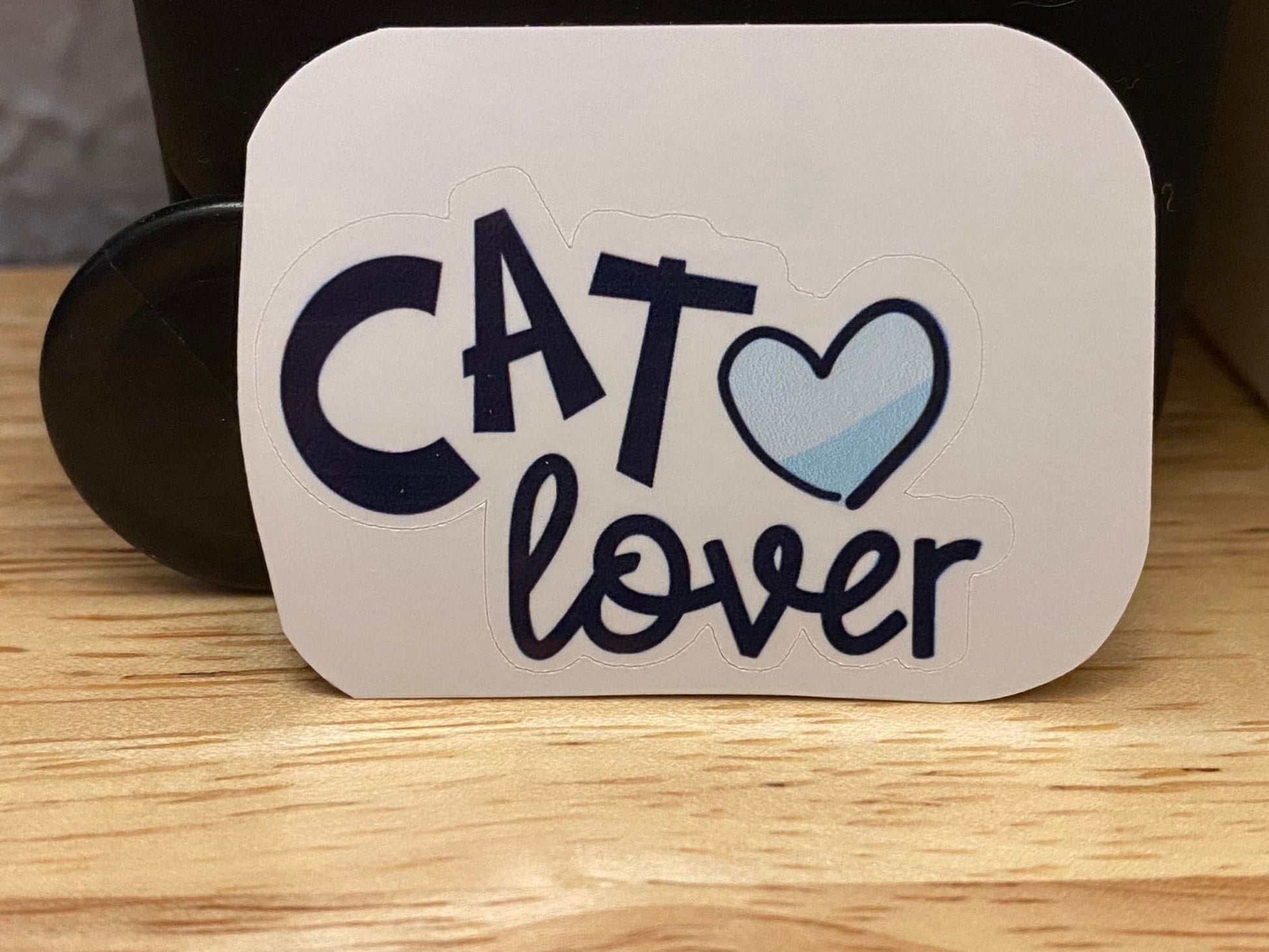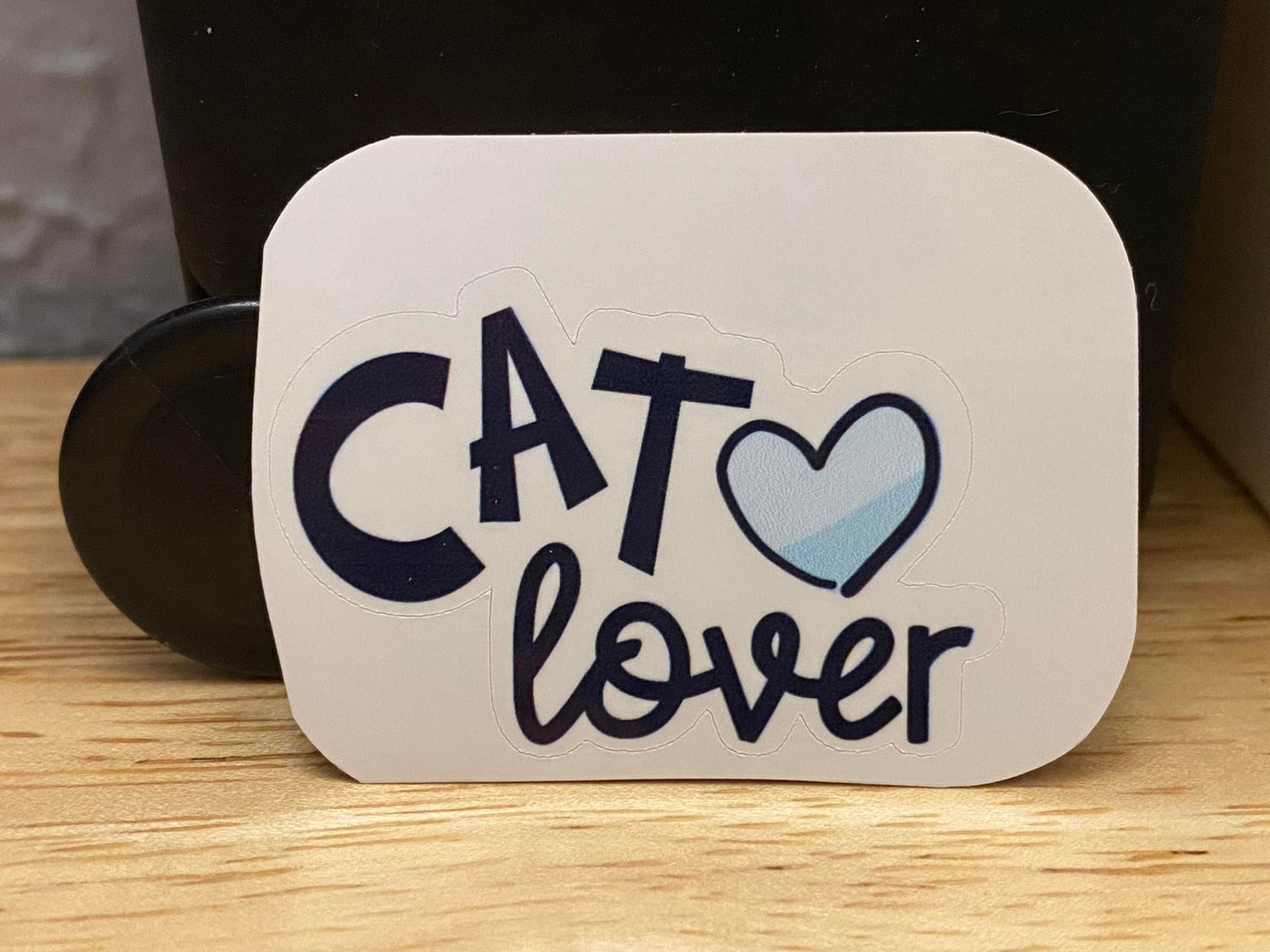 Blue Heart with Cat Lover STICKER. Stickers are printed on very strong White Vinyl type of Paper and then cut around each sticker leaving a small white out-lining. They can be added to almost any hard non-textured surface. Great to decorate your laptop.