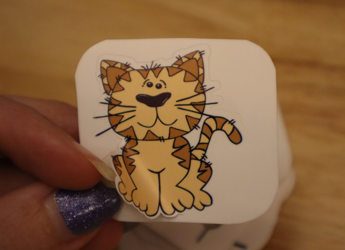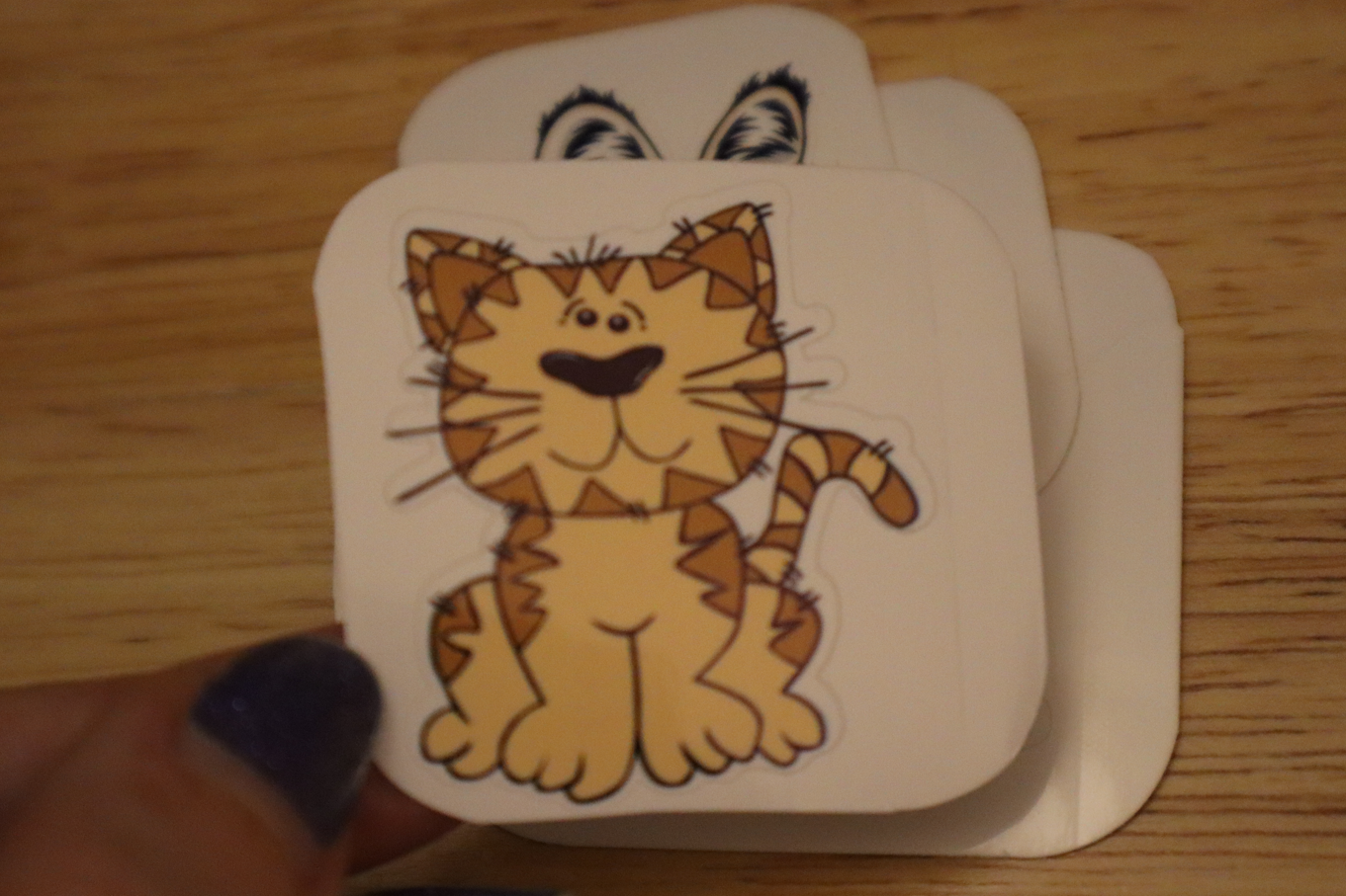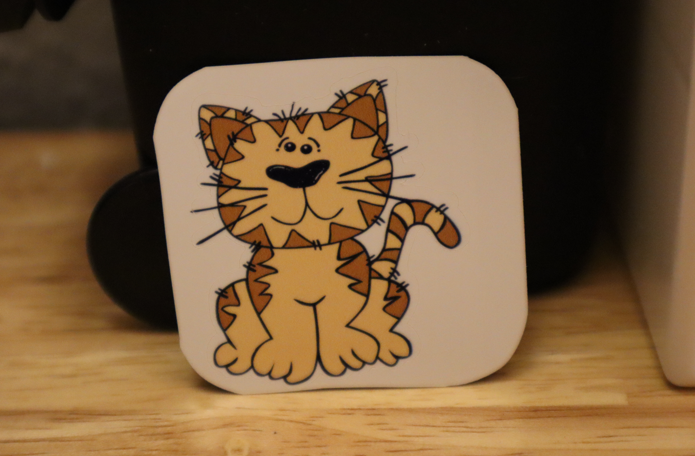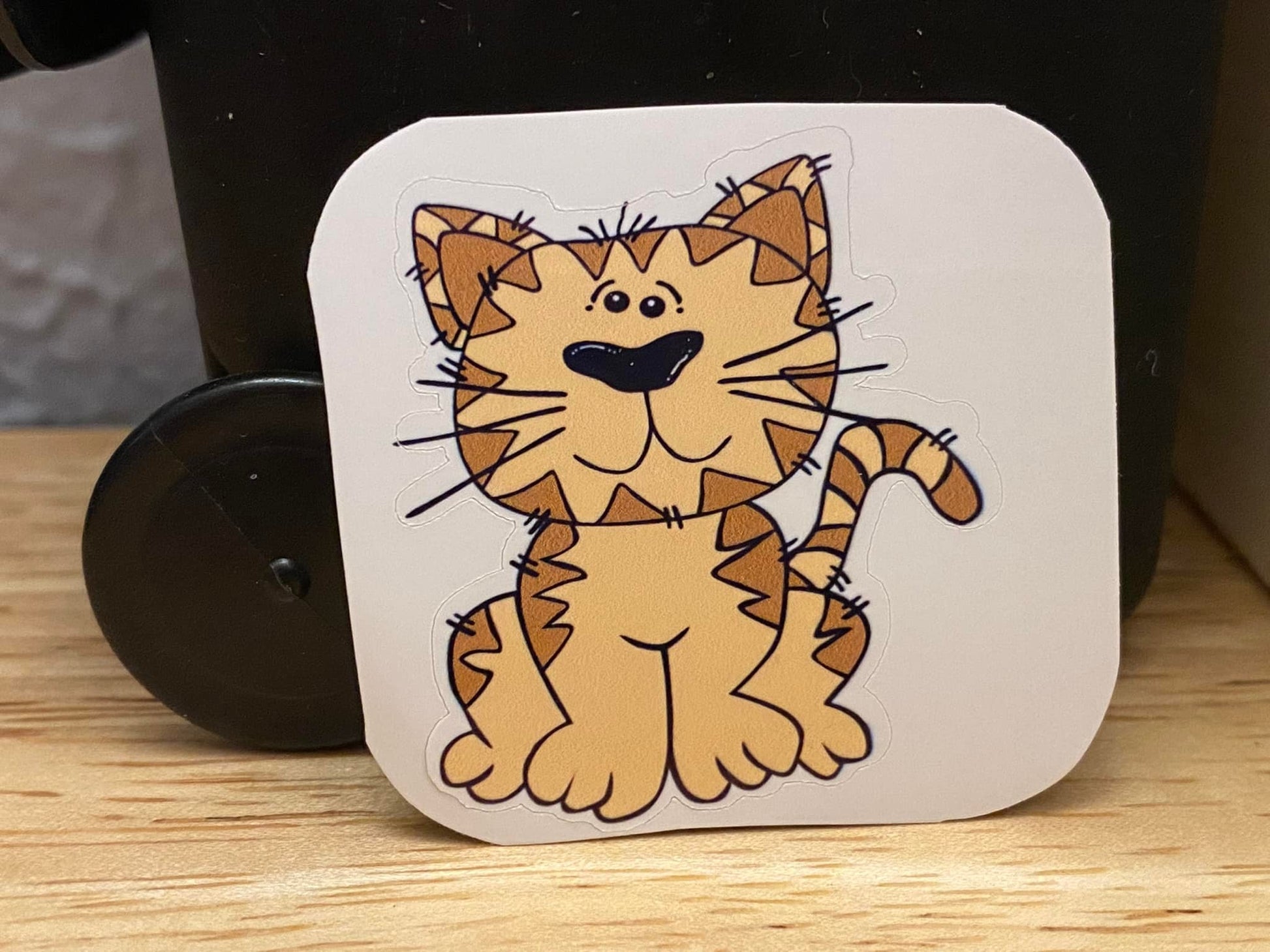Brown Tabby Cat STICKER. Stickers are printed on very strong White Vinyl type of Paper and then cut around each sticker leaving a small white out-lining. They can be added to almost any hard non-textured surface. Great to decorate your laptop.