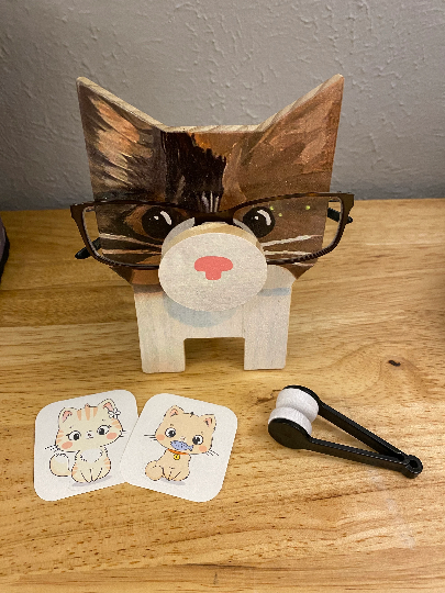 Cat Glasses Wooden Stand, with Sunglasses Cleaner, and Cute Stickers Bundle