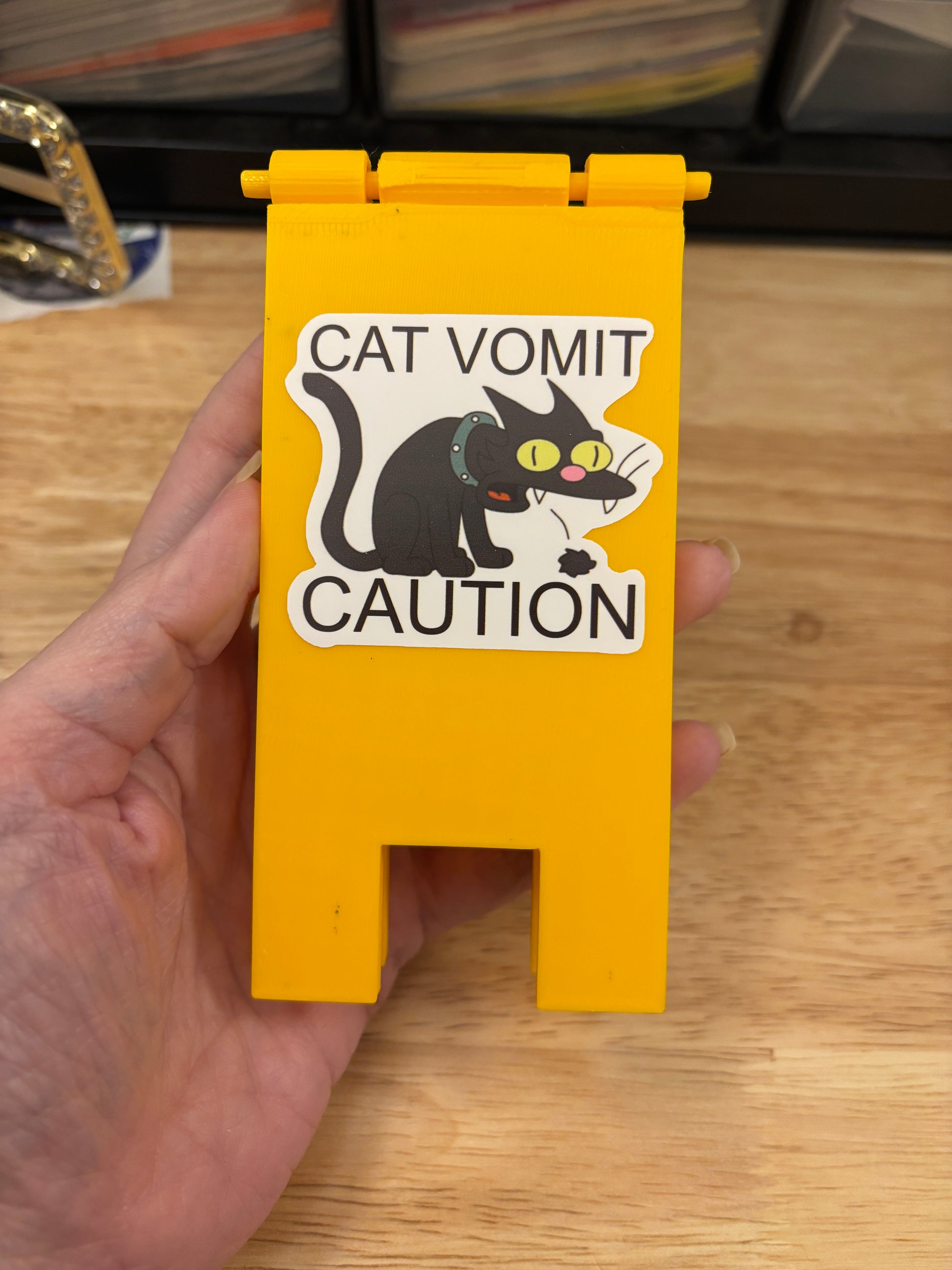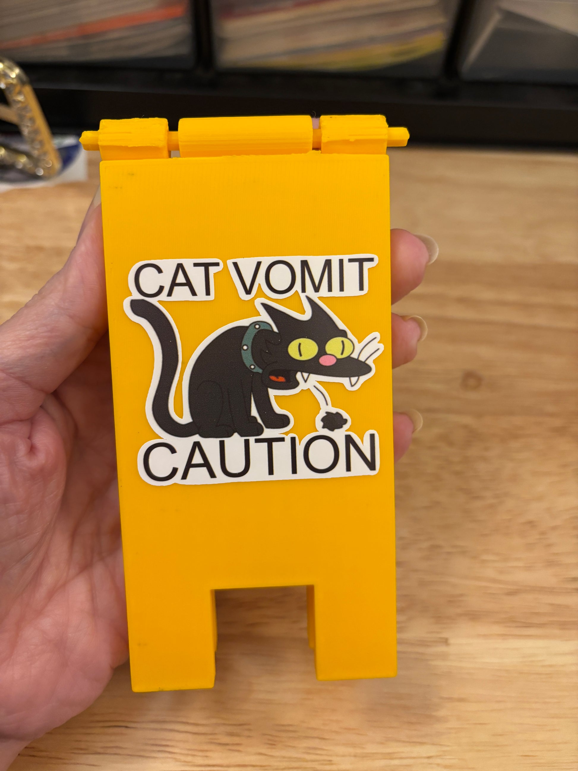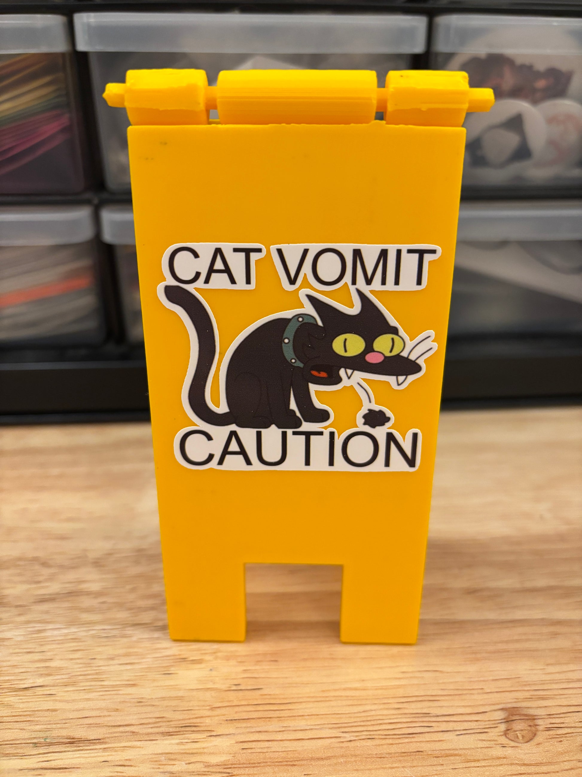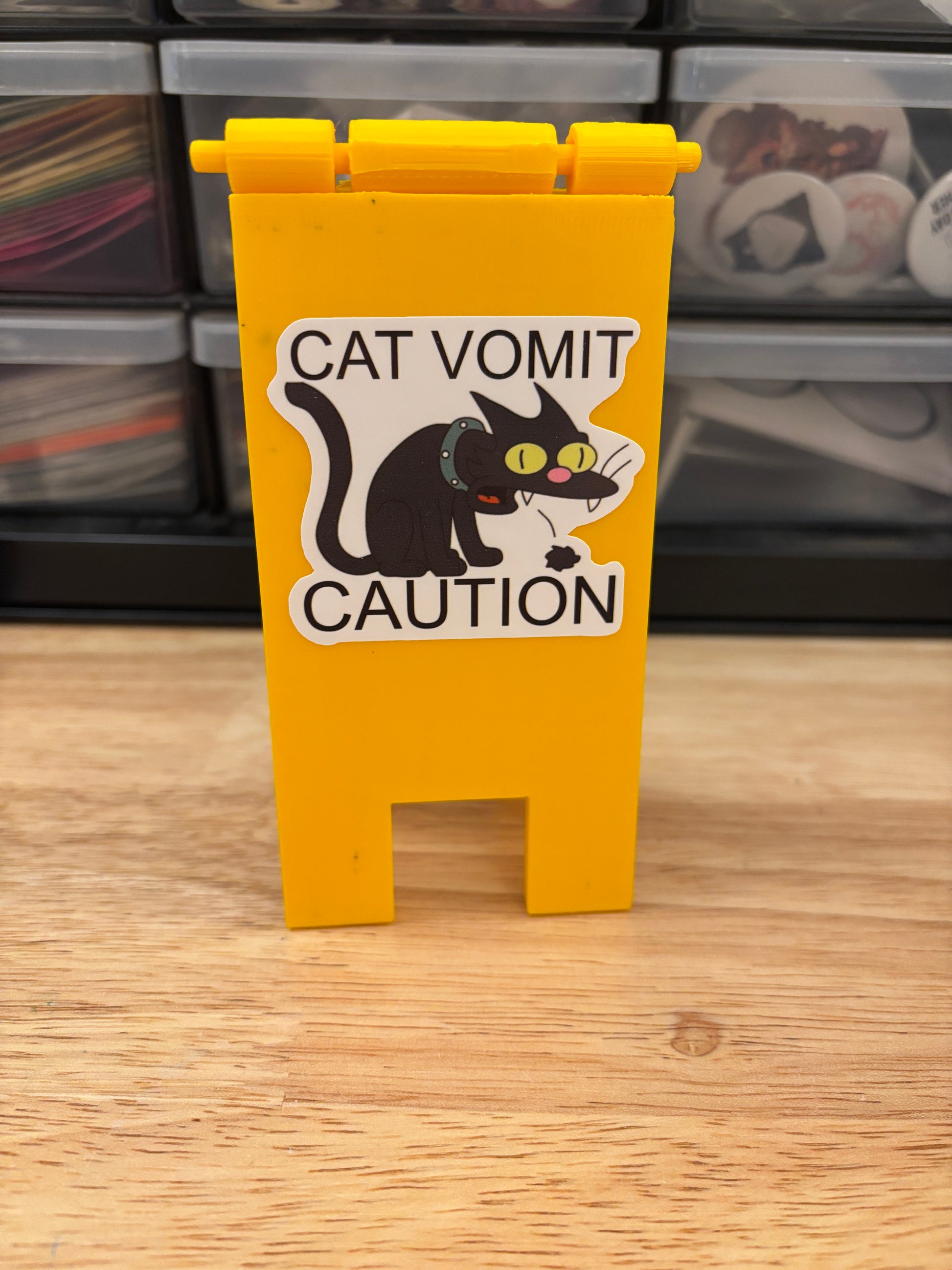 Cat Vomit Caution Stand, this is a 3D Printed Stand with two cute funny stickers I made on each side. The stickers are almost the exact same, one has the background of white taken out a bit and the other I left more of the white background.