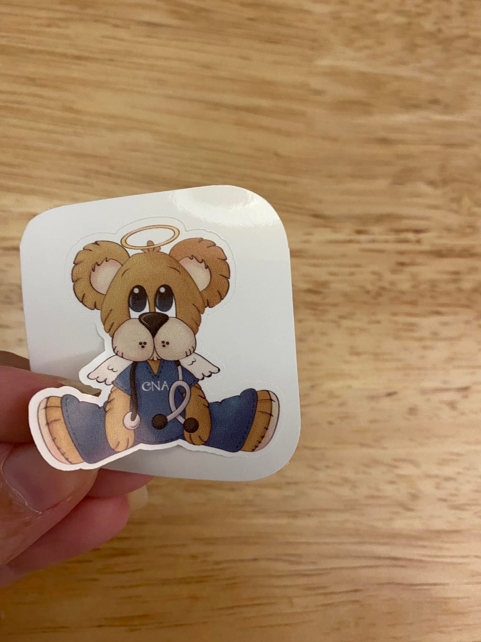 Cna Bear in Scrubs Sticker. Stickers are printed on very strong White Vinyl type of Paper and then cut around each sticker leaving a small white out-lining. They can be added to almost any hard non-textured surface. Great to decorate your laptop.