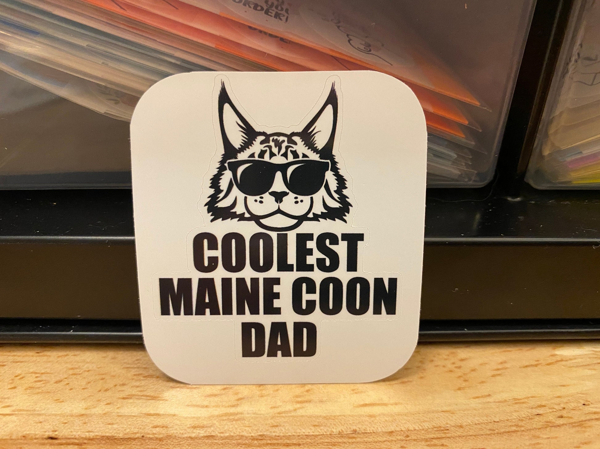 Coolest Maine Coon Dad Sticker. Stickers are printed on very strong White Vinyl type of Paper and then cut around each sticker leaving a small white out-lining. They can be added to almost any hard non-textured surface. Great to decorate your laptop.