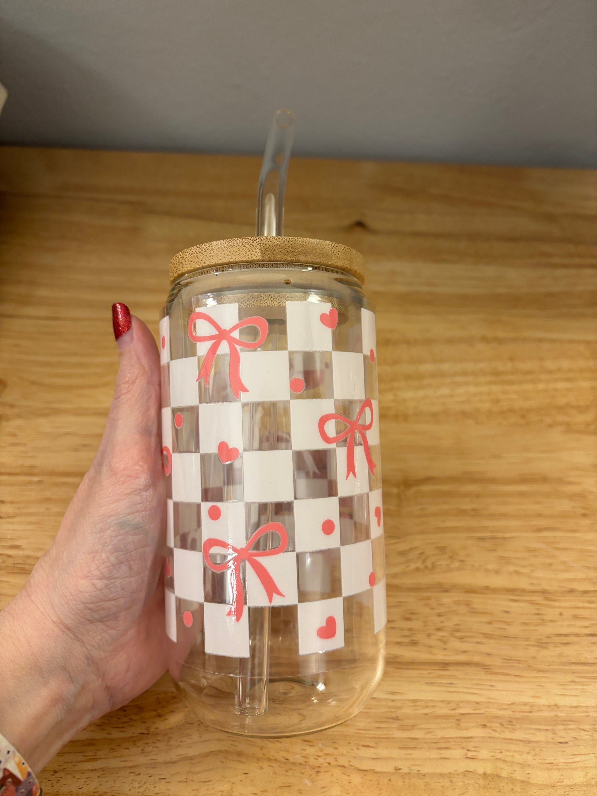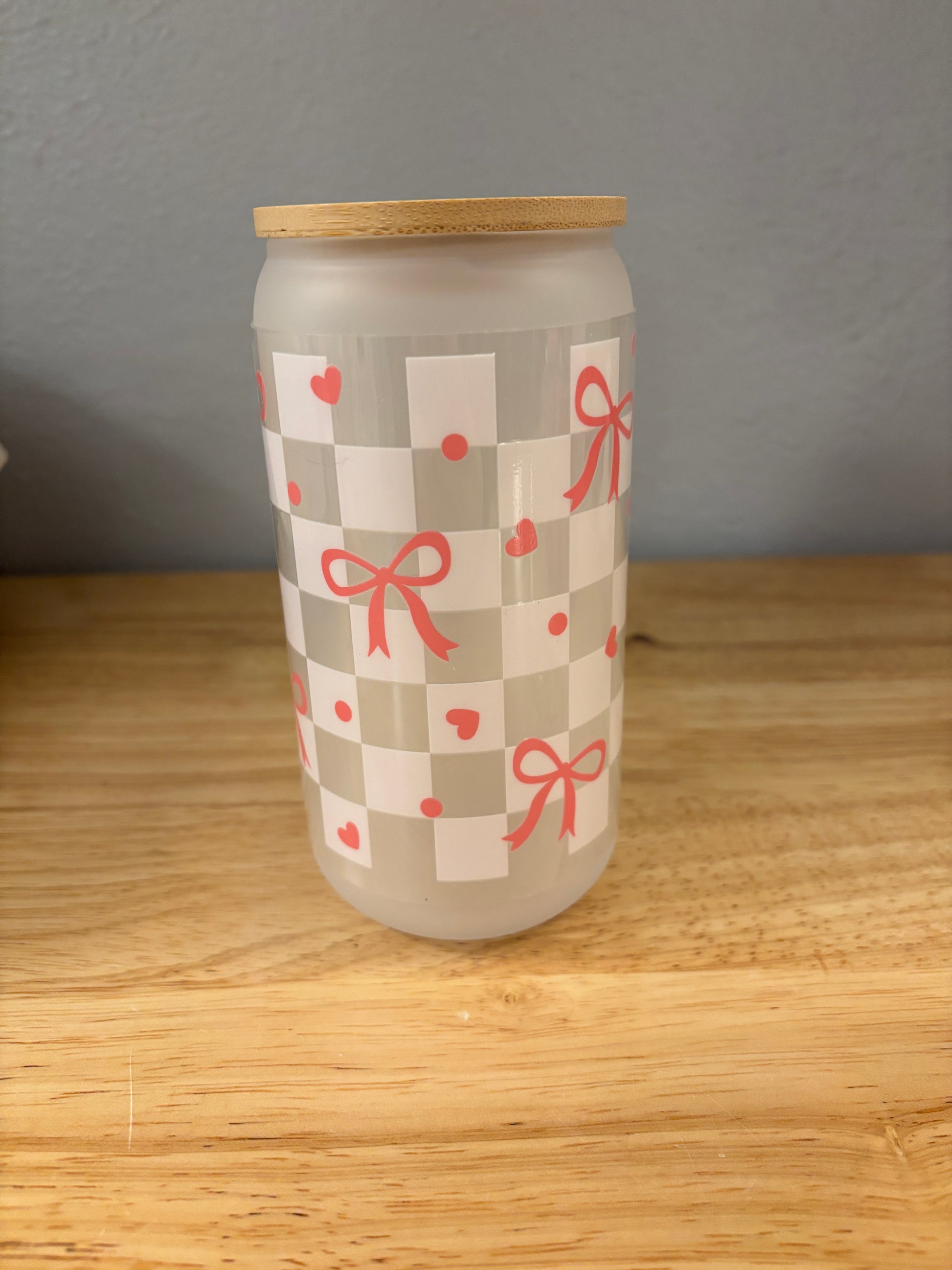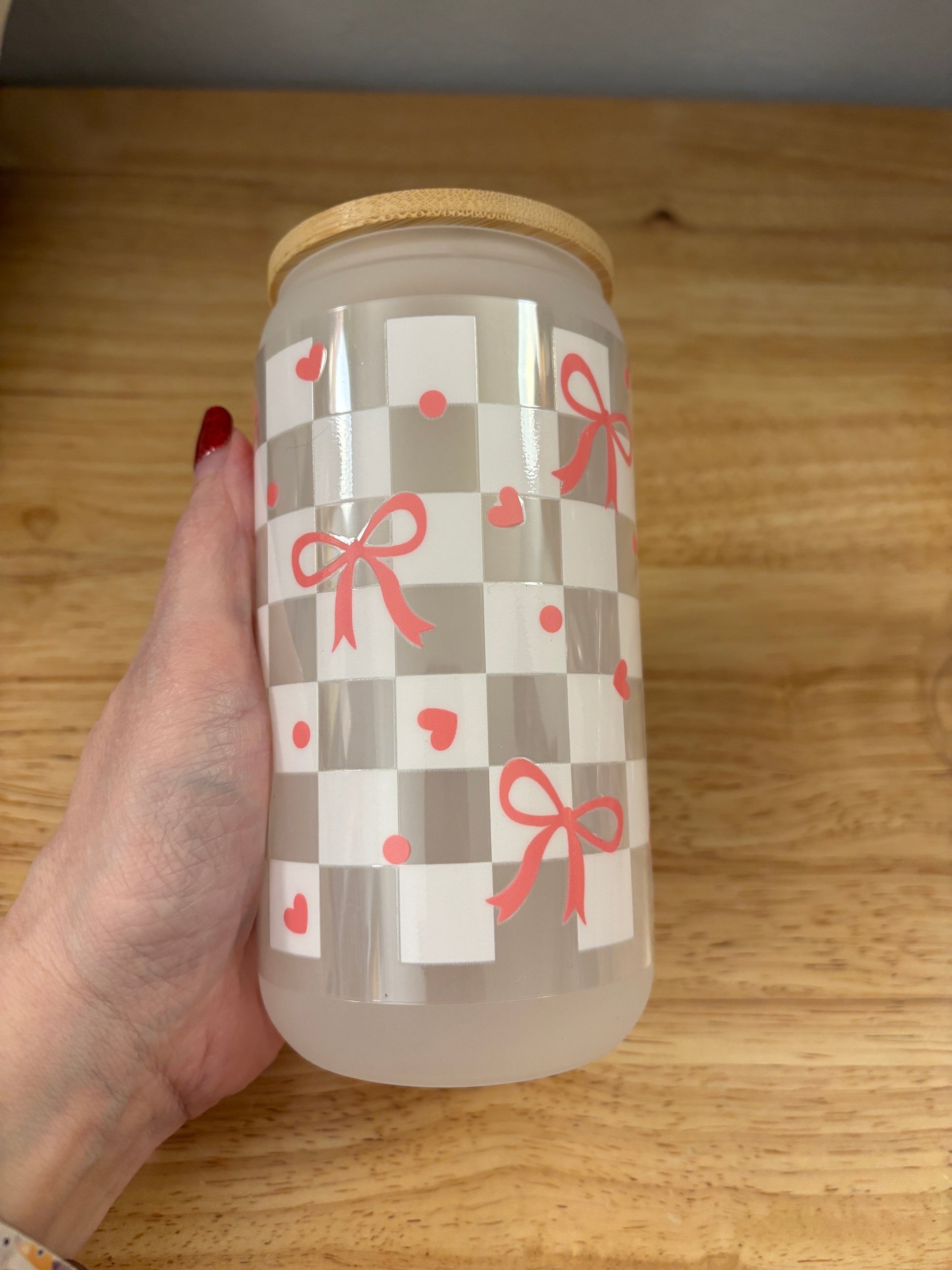 White Checkered Bows Glass Tumbler, Clear or Frosted Tumblers option