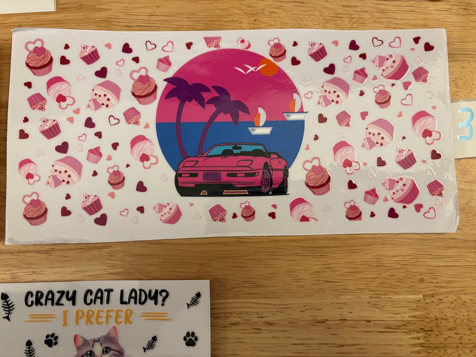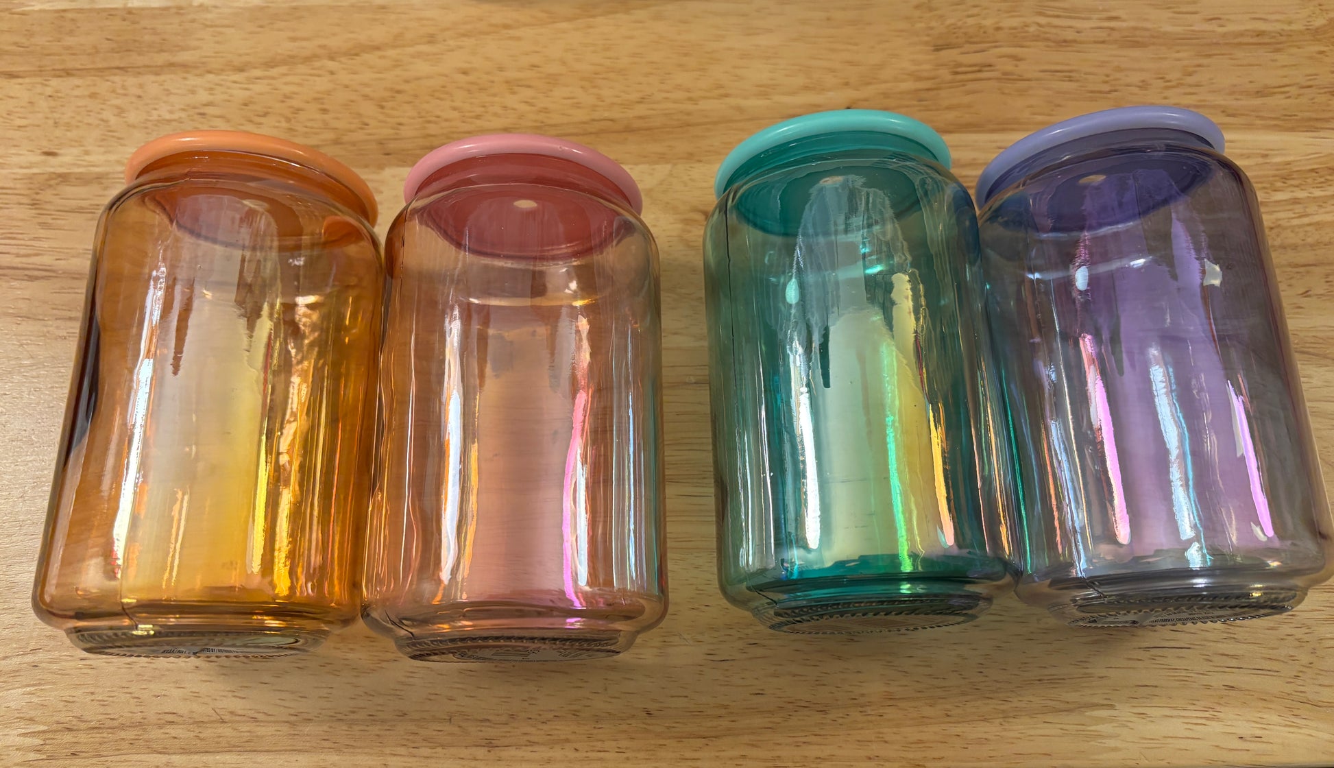 Your choice of the design you choose on either a Glass Tumbler, Clear, Frosted or any of the holographic colored Tumbler option. The Design has a clear backing, not solid white.
