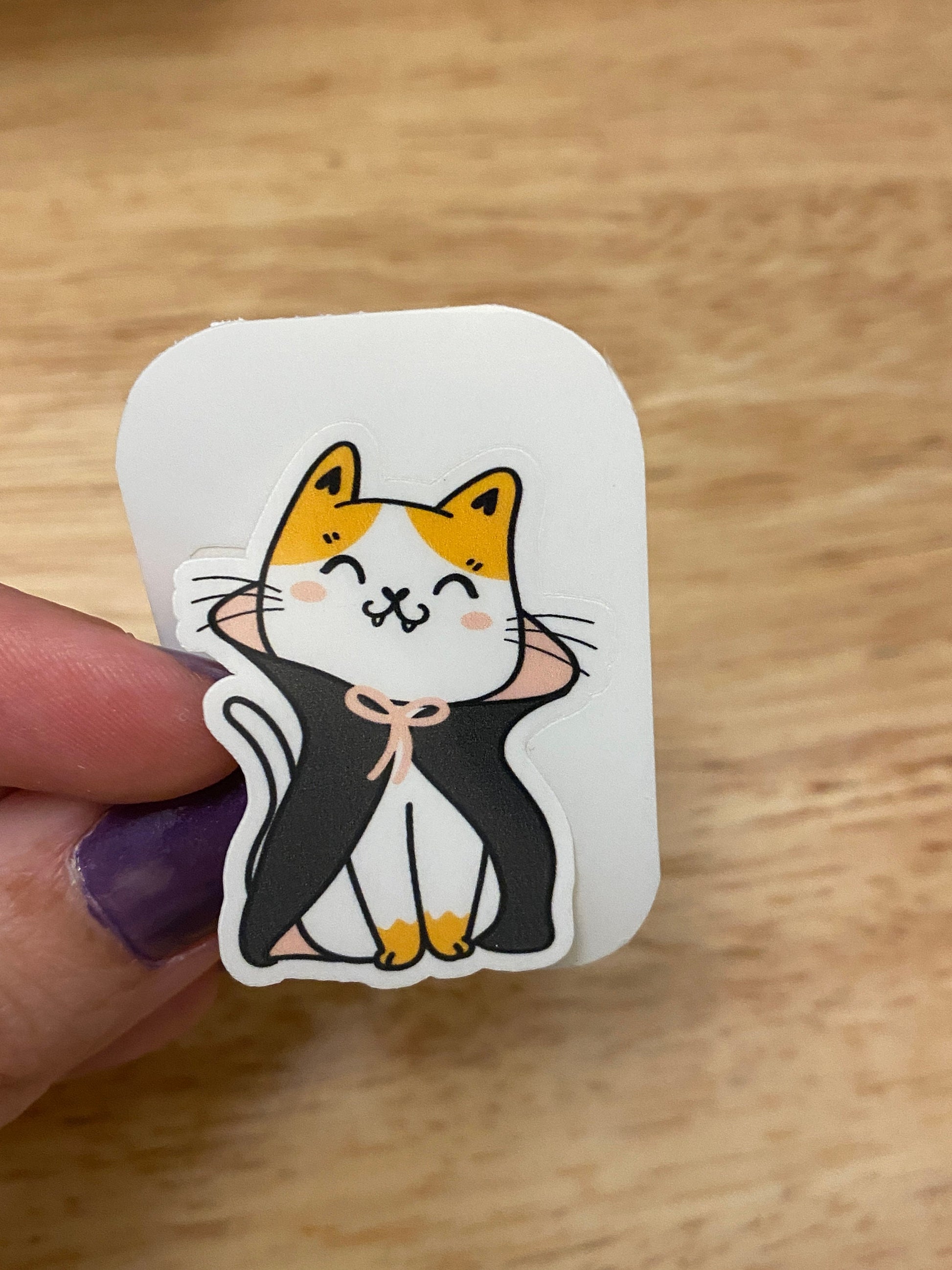 Count Dracula Cat Sticker. This is printed on very strong White Vinyl type of BOPP Paper and then cut around each sticker leaving a small white outline. They can be added to almost any hard smooth non-textured surface. Great to decorate your laptop.