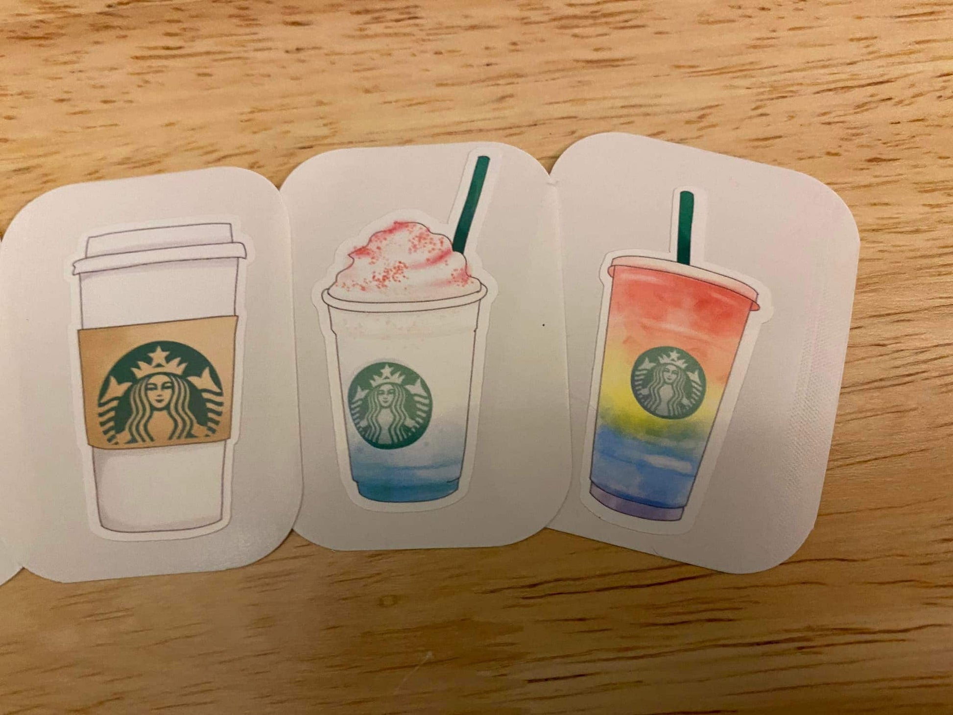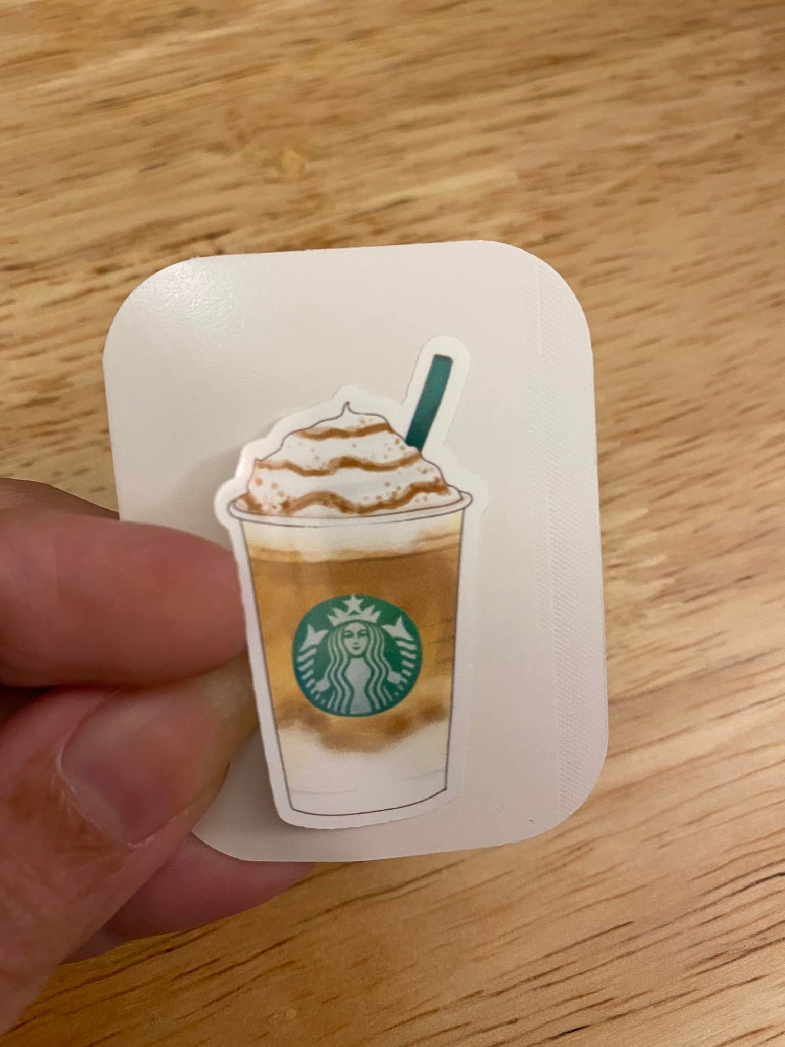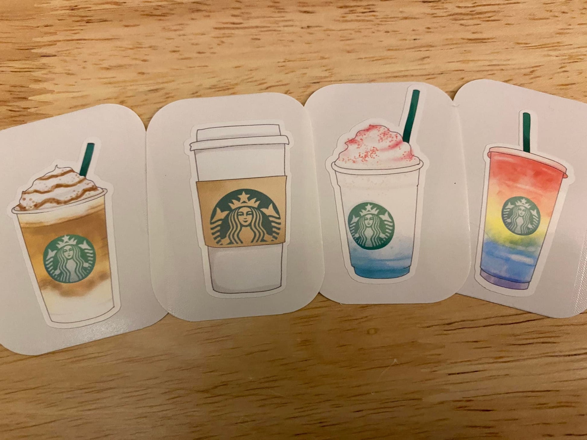 Cute Coffee Sticker Pack. Comes with 4 Stickers they are printed on very strong White Vinyl type of Paper and then cut around each sticker leaving a small white out-lining. They can be added to almost any hard non-textured surface. Great to decorate your laptop, planner, etc.