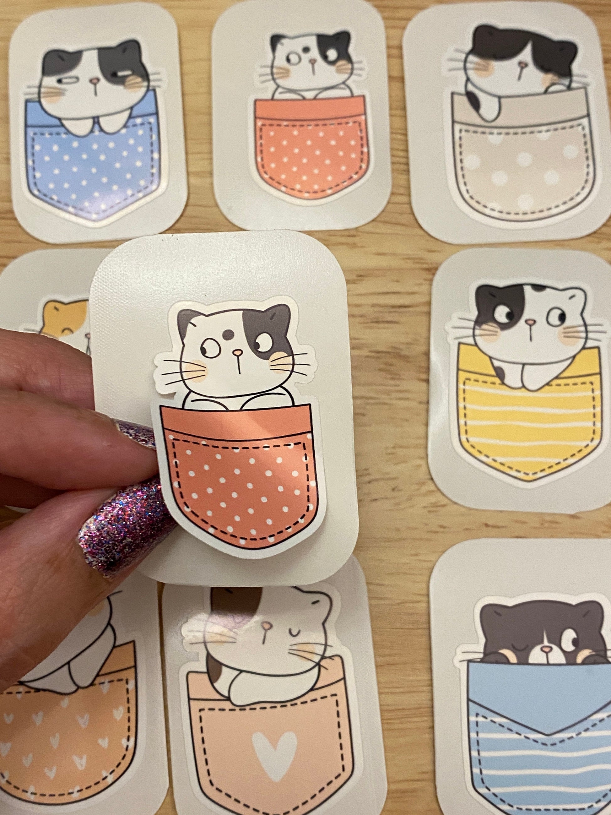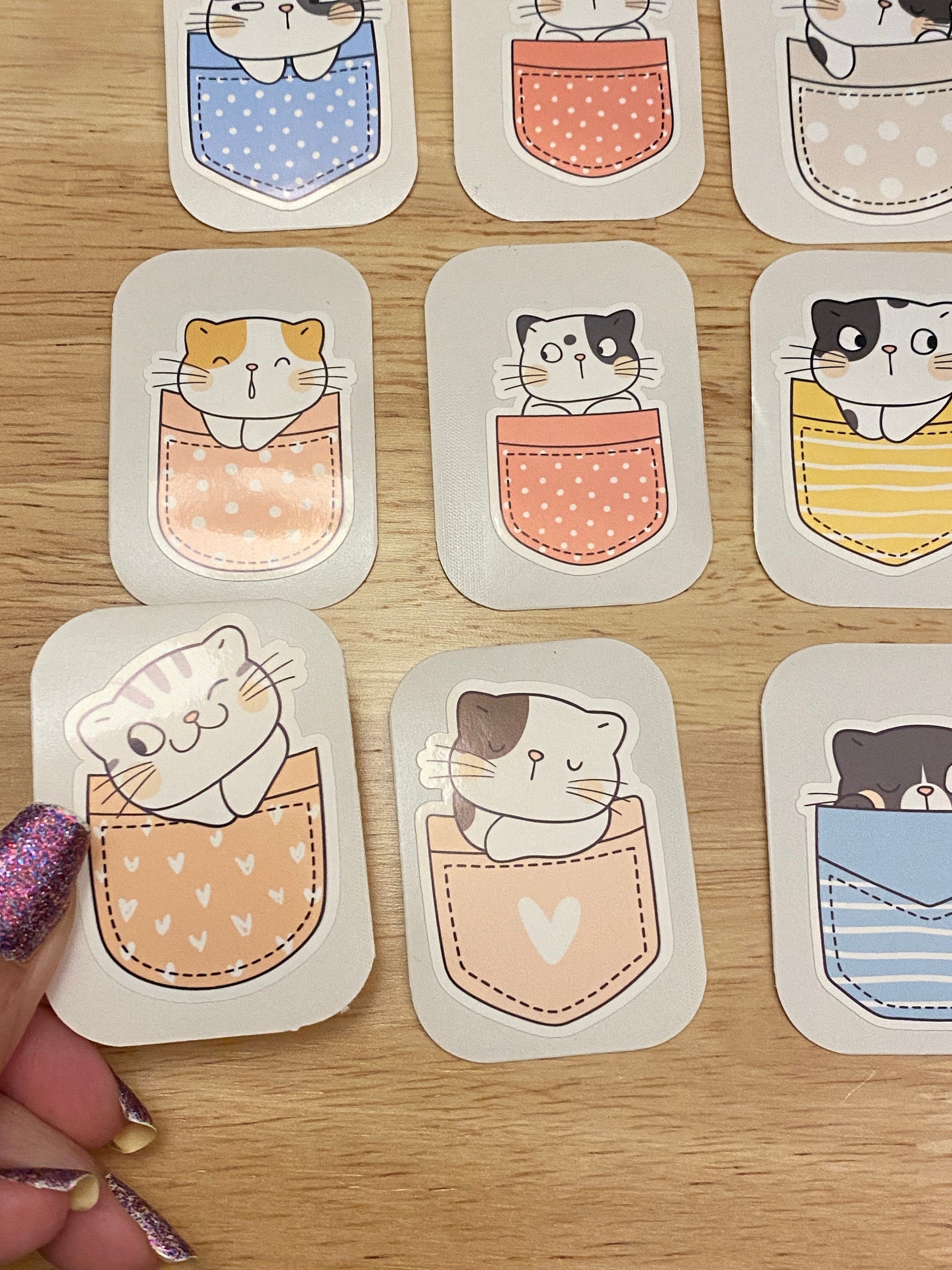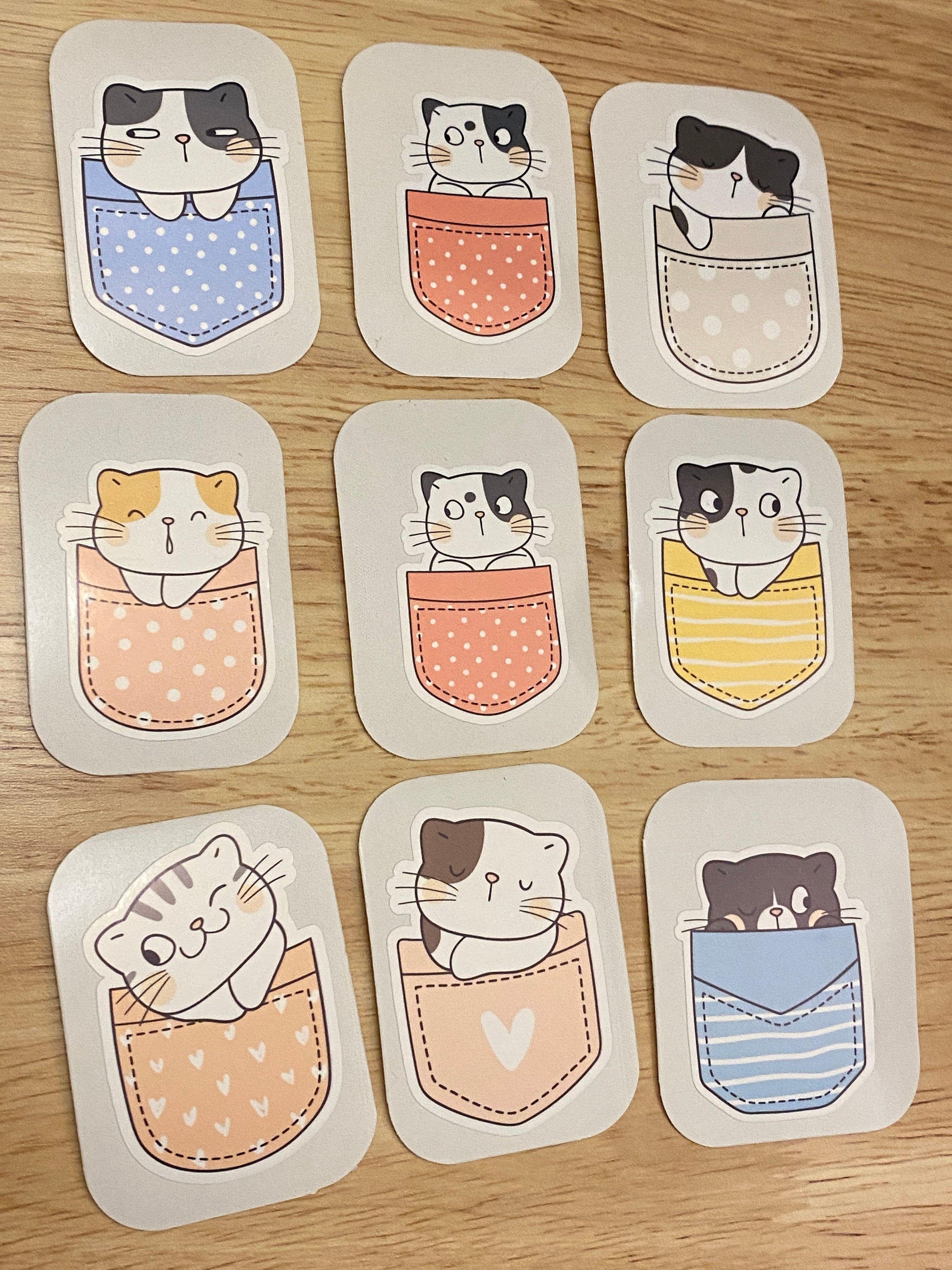 Cute Pocket Cat Sticker Set. Comes with 9 Stickers they are printed on very strong White Vinyl type of Paper and then cut around each sticker leaving a small white out-lining. They can be added to almost any hard non-textured surface. Great to decorate your laptop, planner, etc.