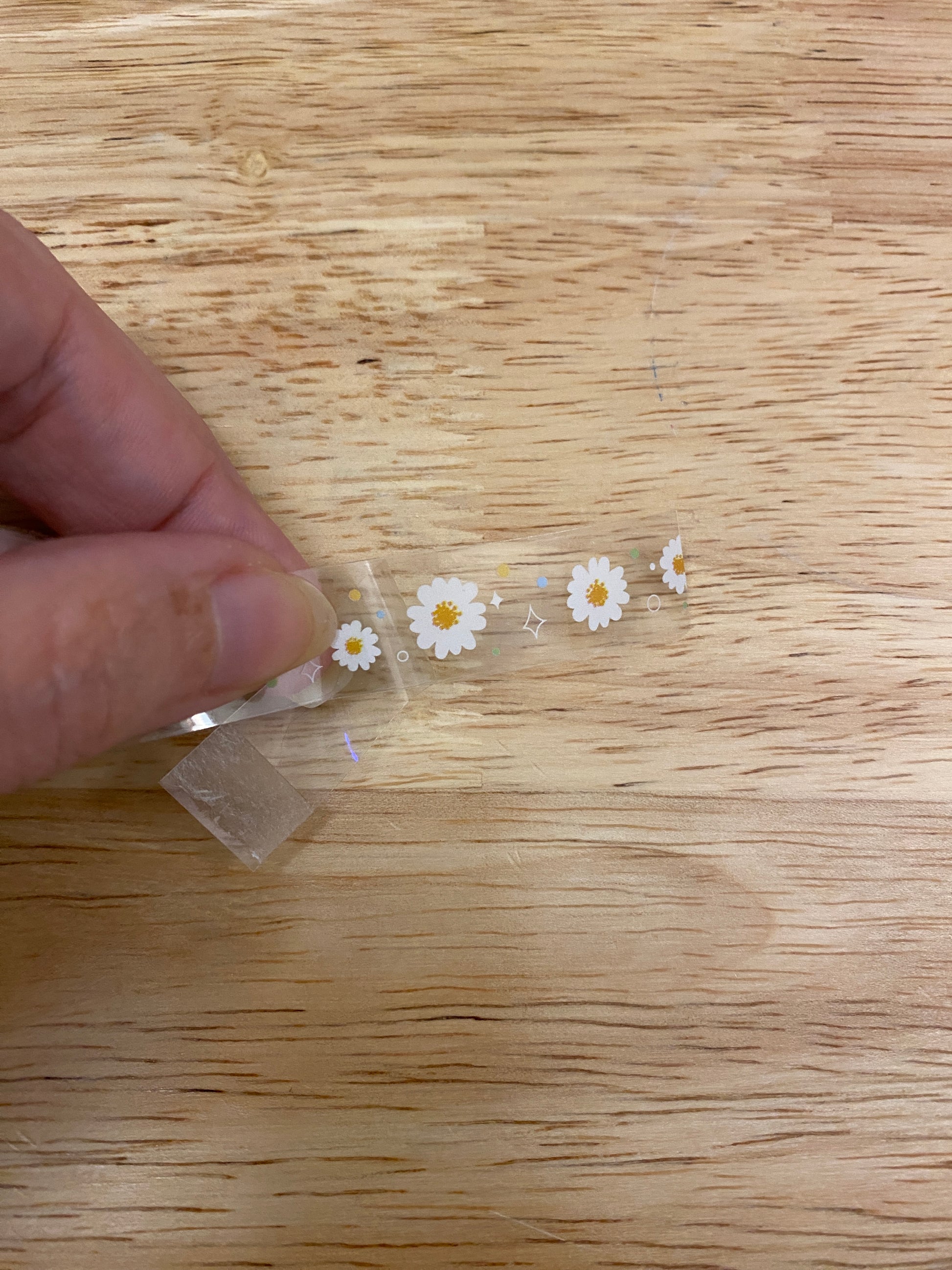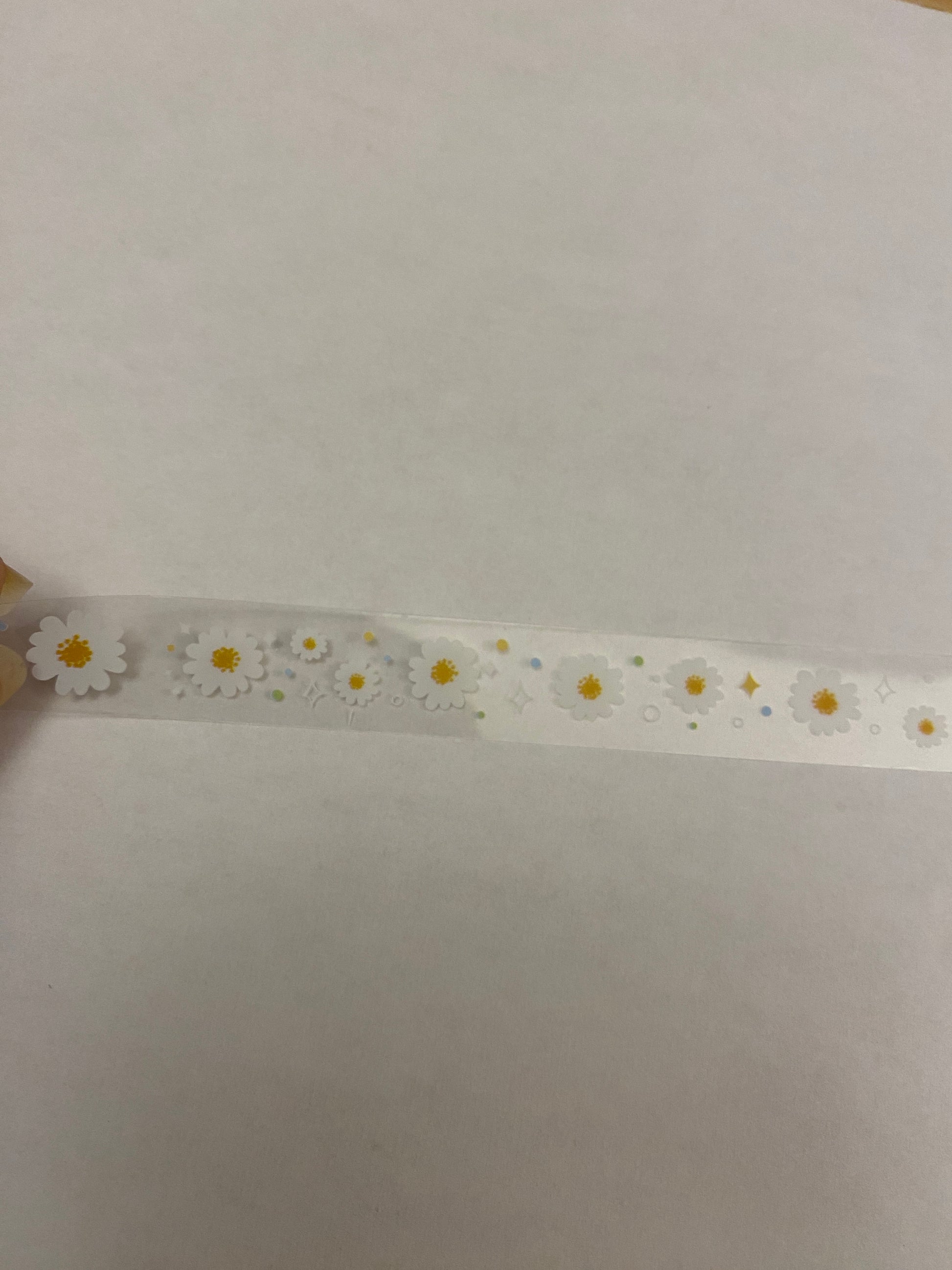PET Clear Tape with White Daisies. Decorative Sticker Tape For Scrap booking planner, this is not individual stickers, these are all on the washi tape, it has a very pretty Gold Foil raised up look. Tape is easy to cut with and you can cut out each Feather.