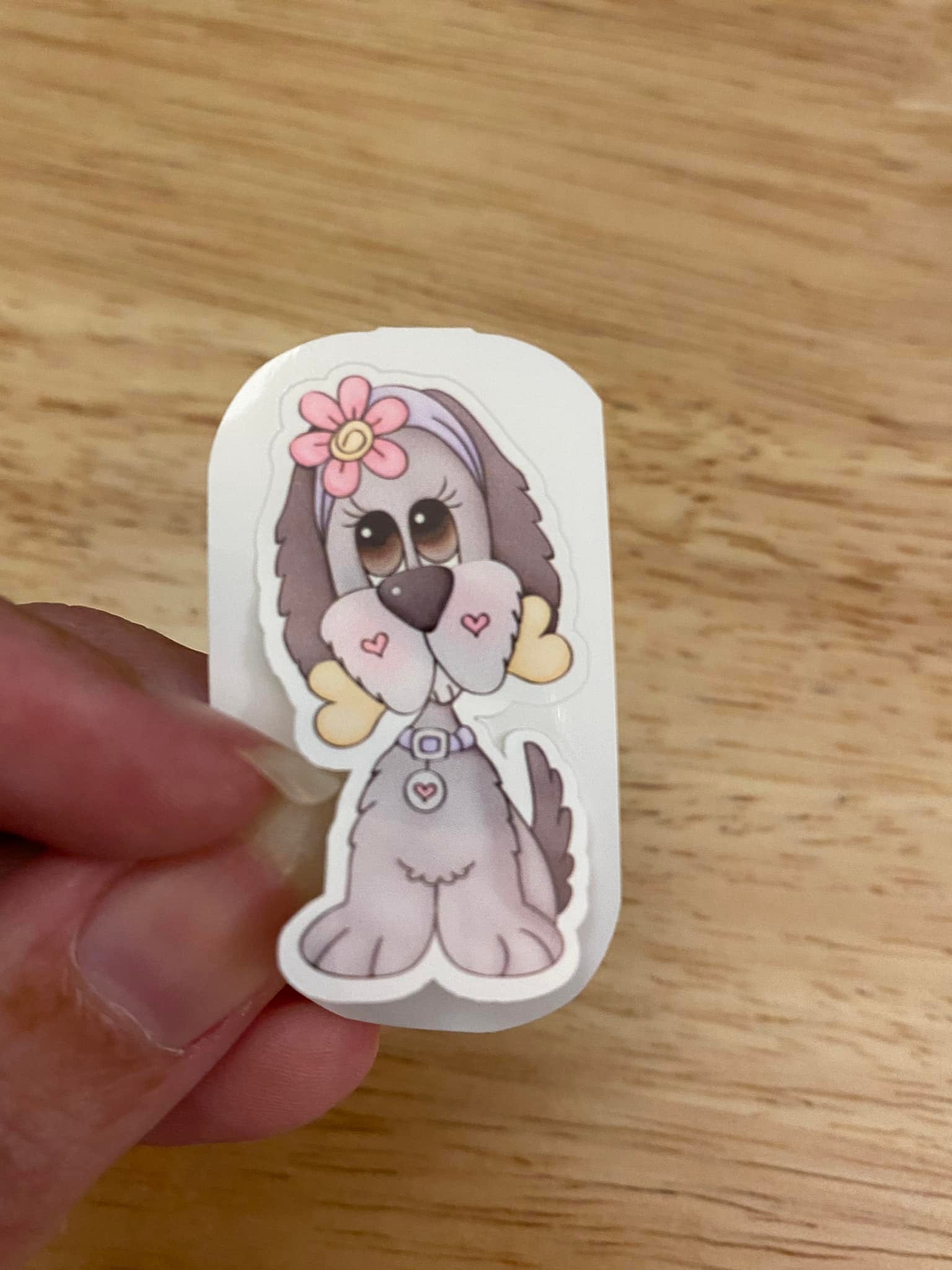 Dog with Bone STICKER. Stickers are printed on very strong White Vinyl type of Paper and then cut around each sticker leaving a small white out-lining. They can be added to almost any hard non-textured surface. Great to decorate your laptop.