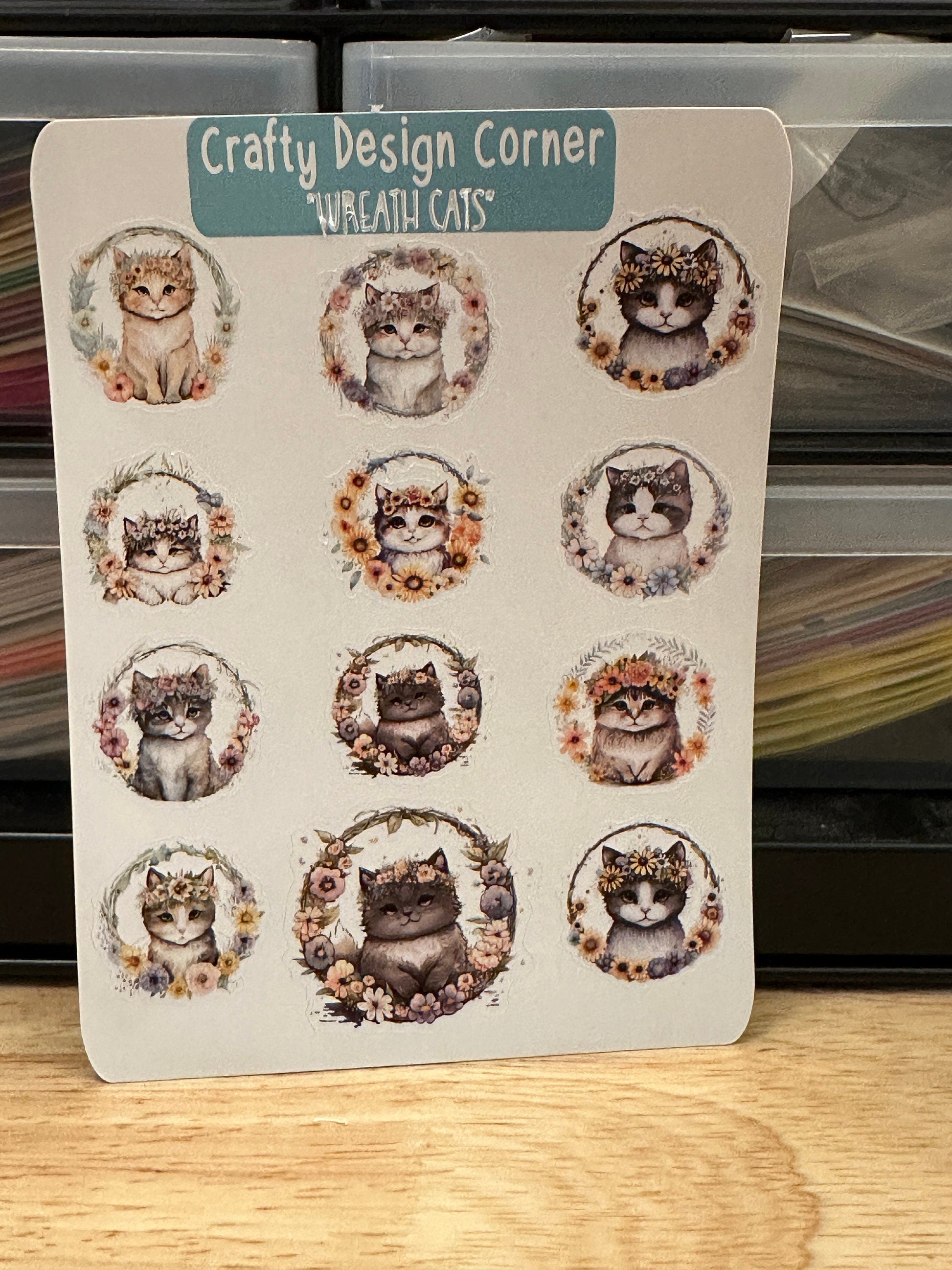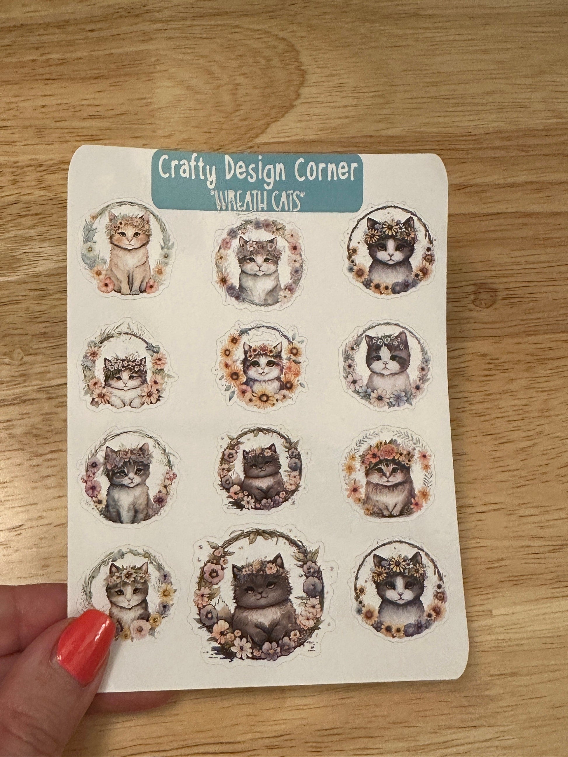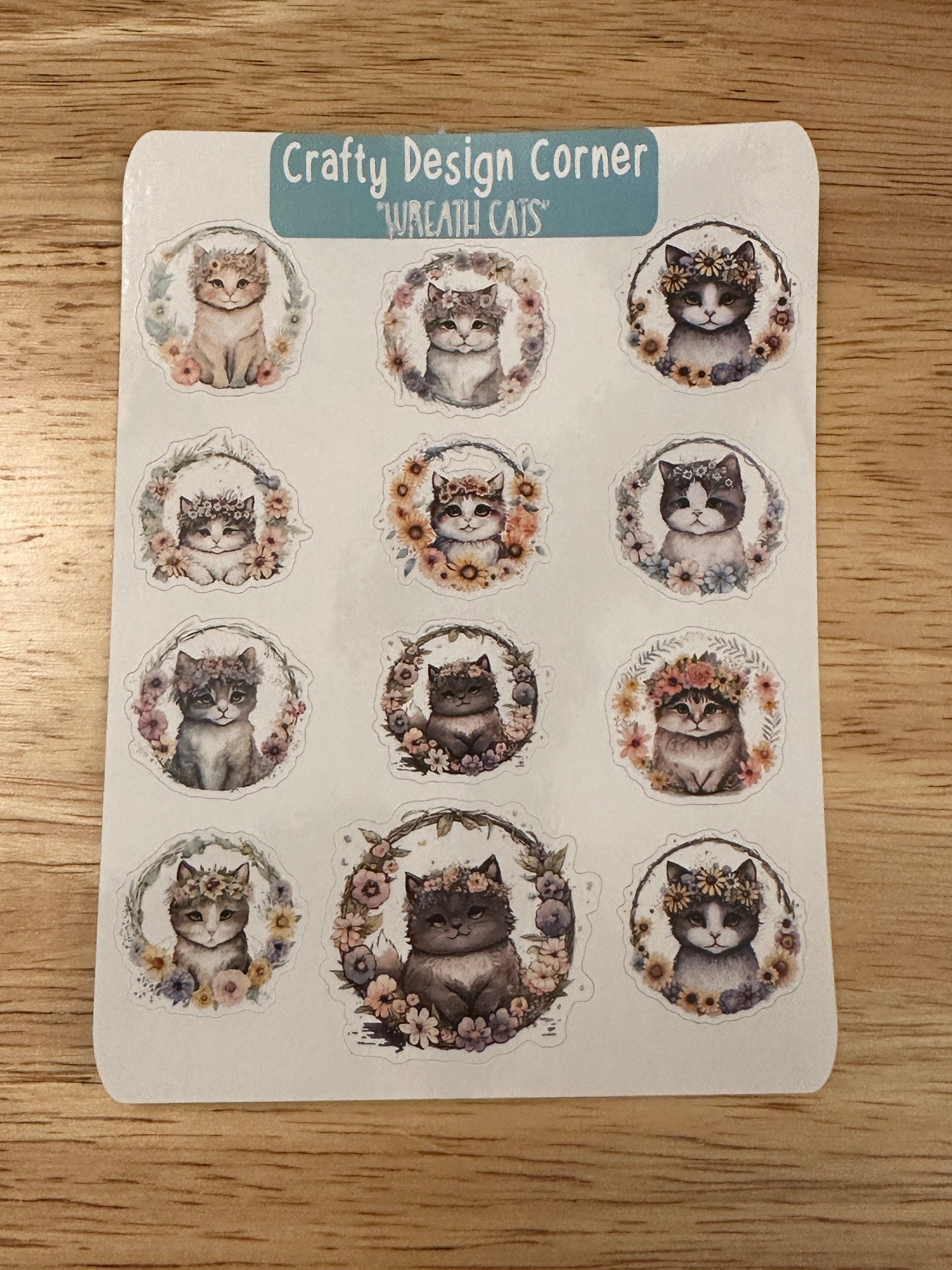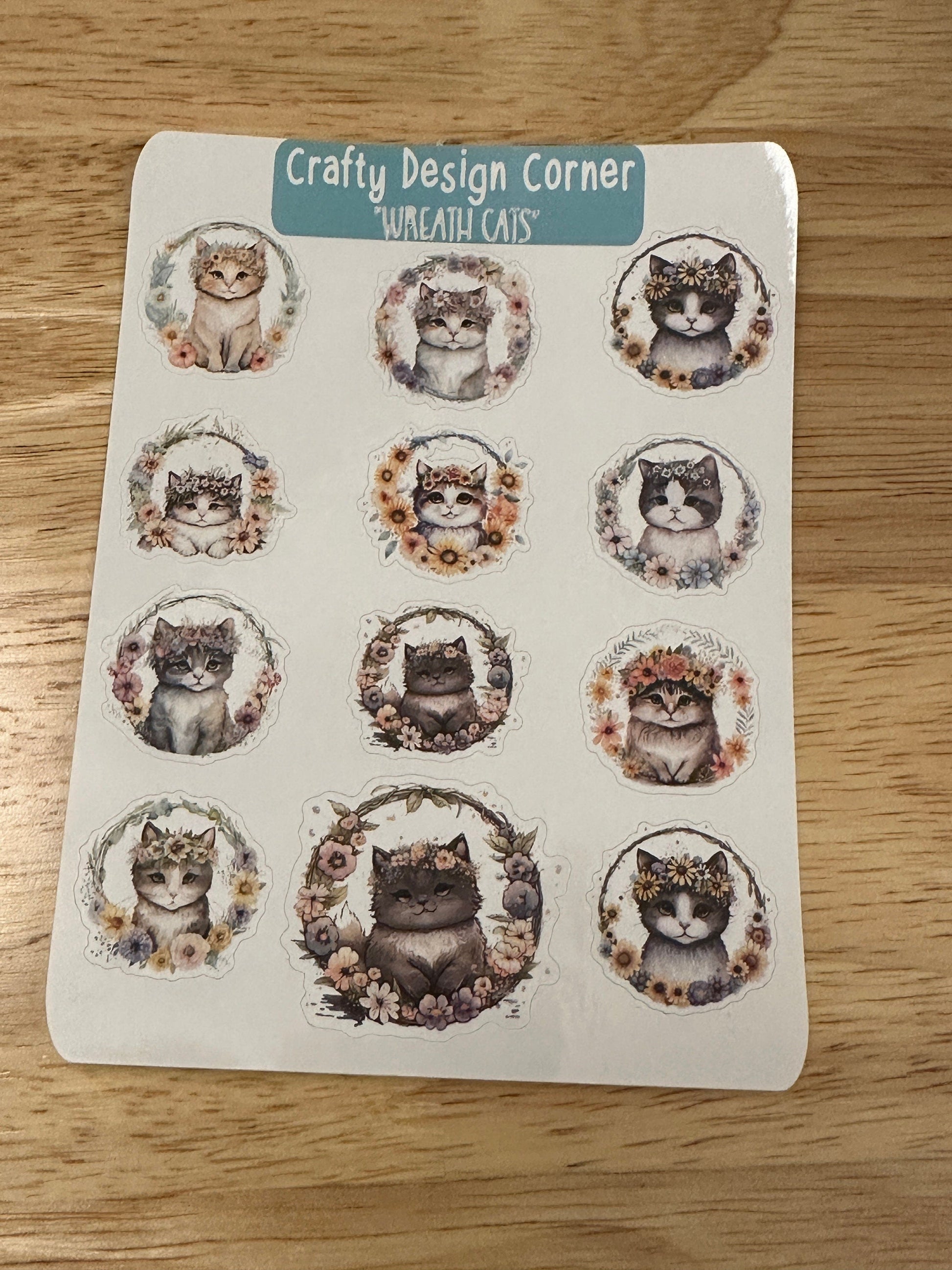 Wreath Kitties planner Sticker sheet, this is printed on White sticker Paper and then cut around each sticker leaving a small white outline. Can add to any hard surface, idea for planners.