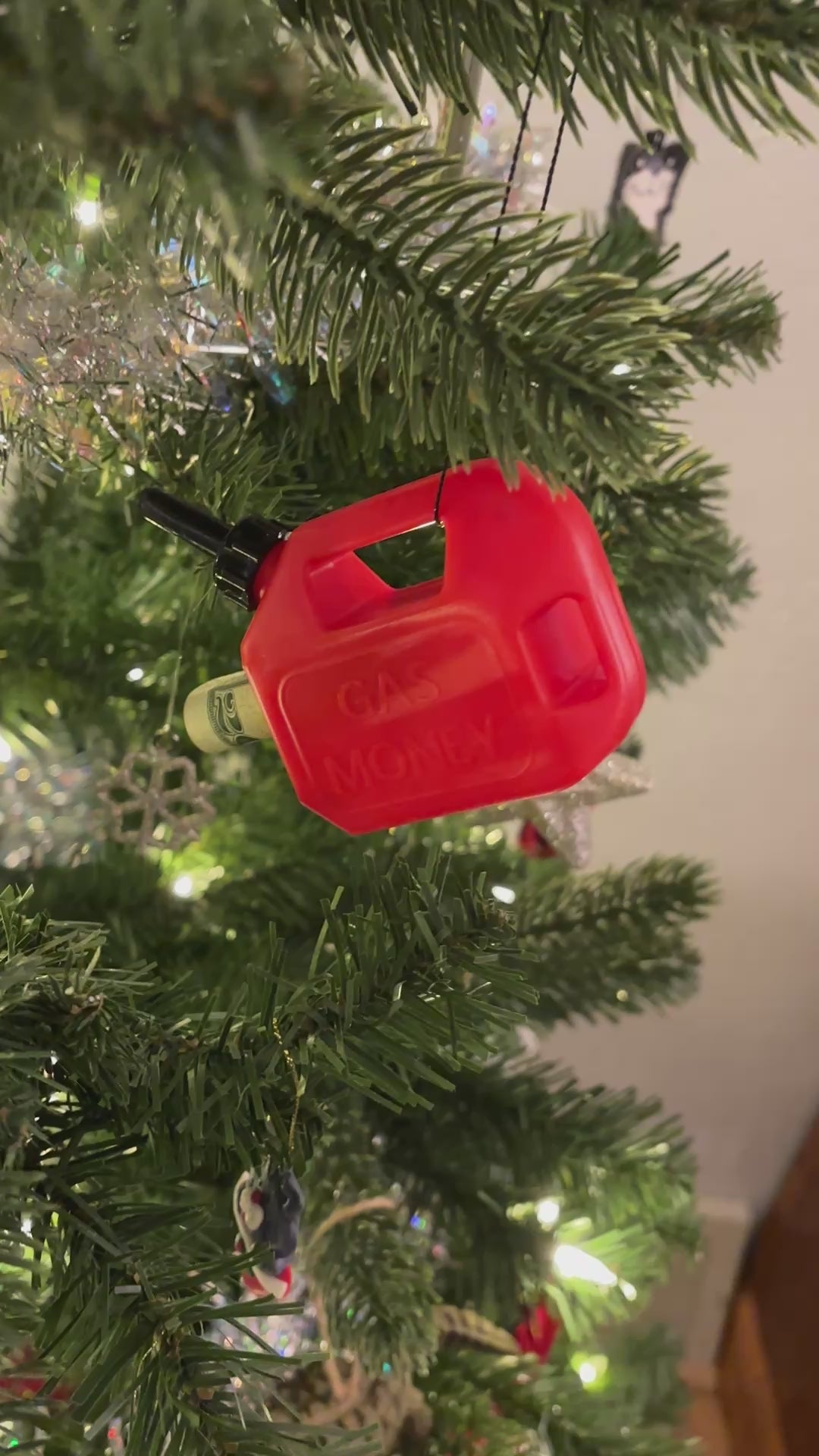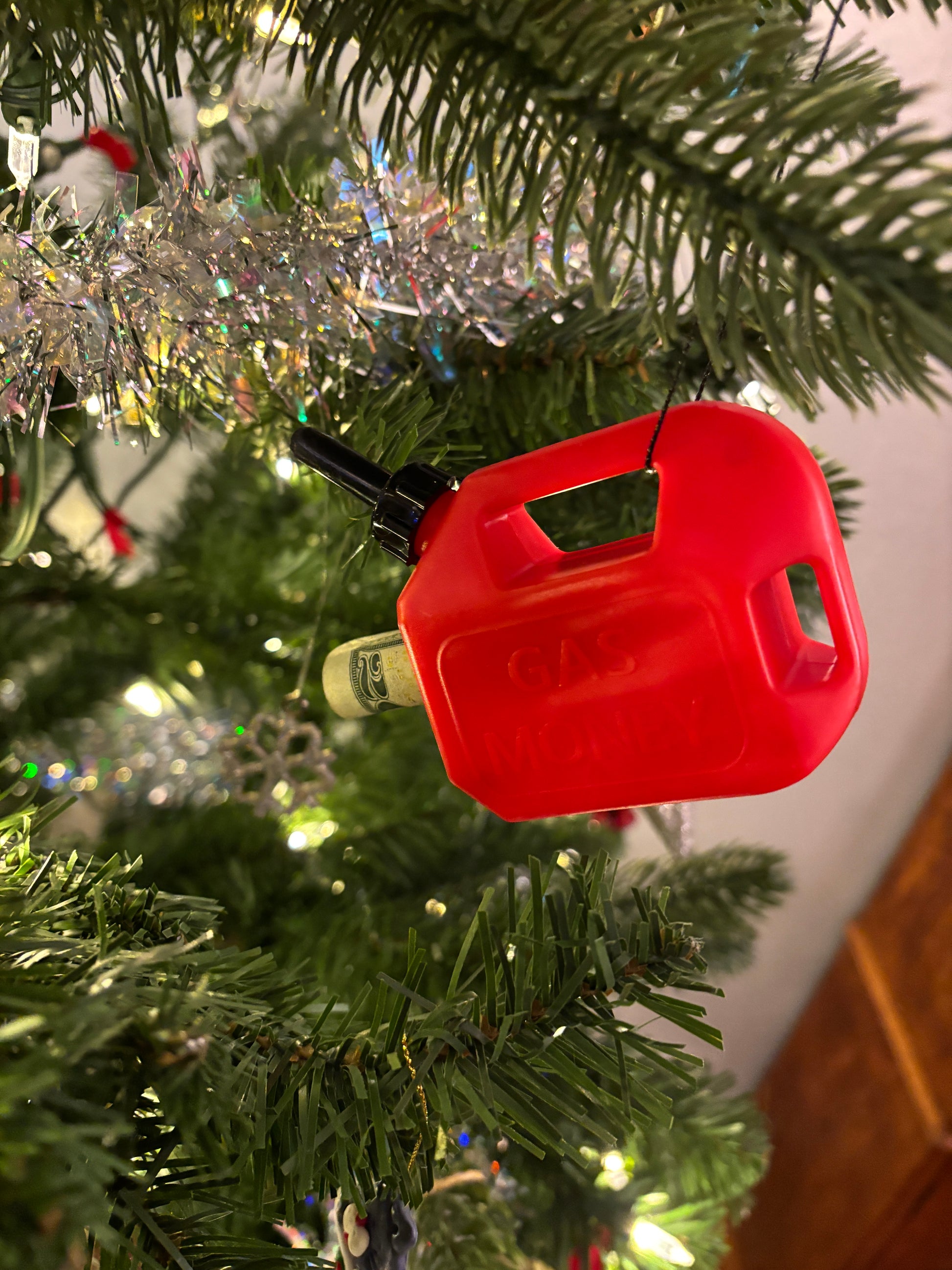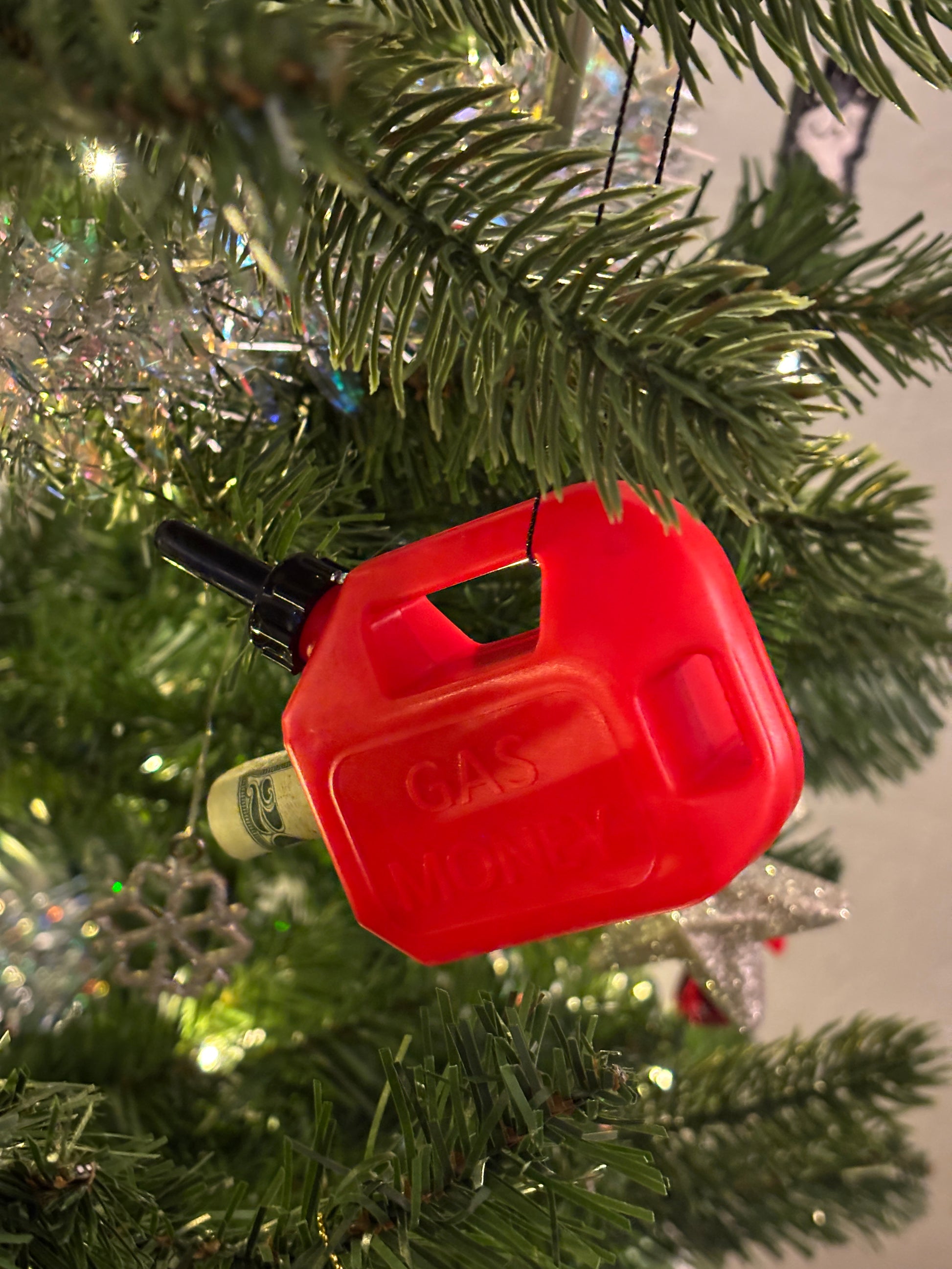 Cute Gas Money Ornament. The can has a hole in it, that 5 bills fit in fairly nicely, makes a great gift for a college student, co worker, or that hard to get a gift for person, that seems to have everything already.