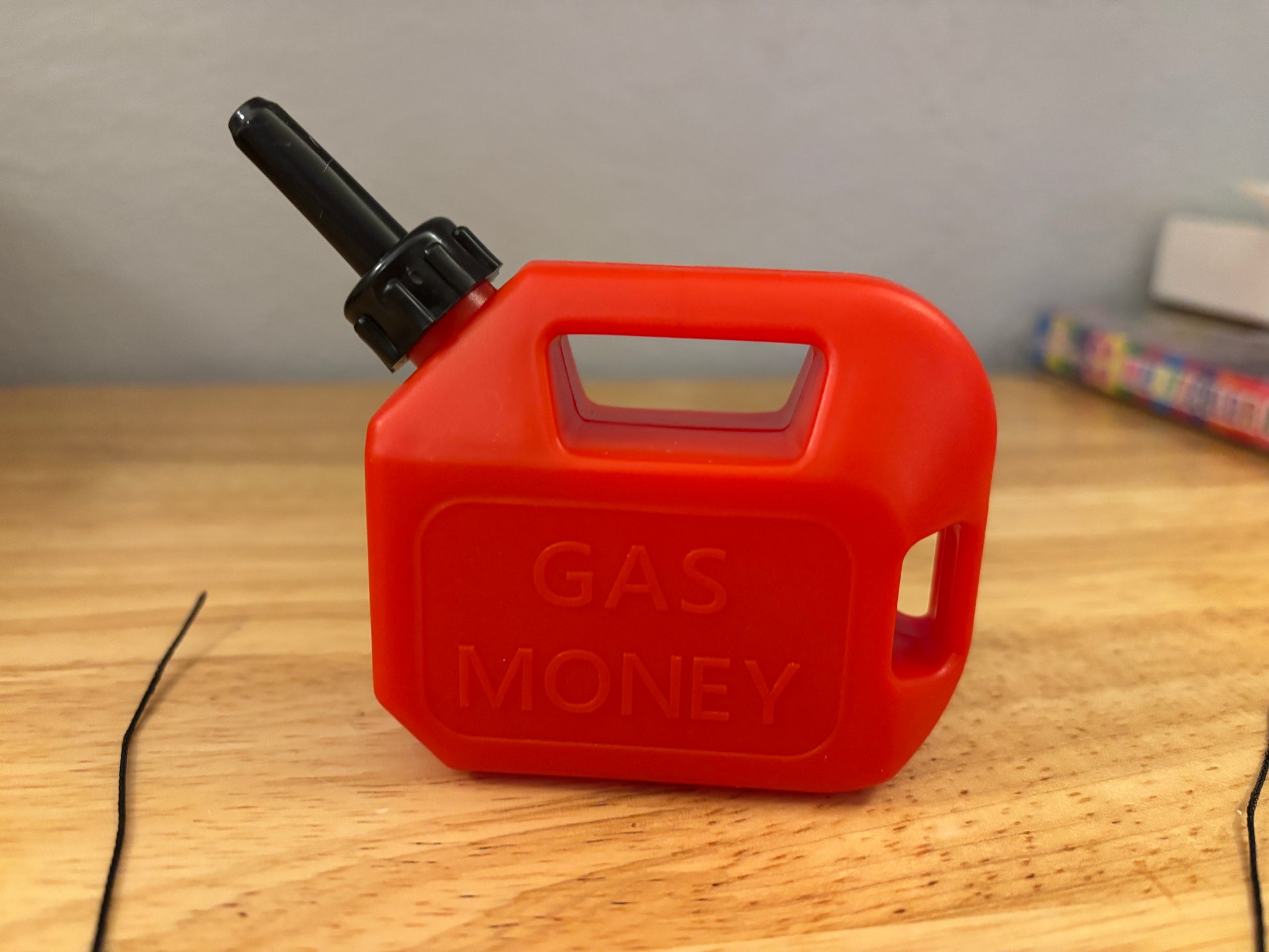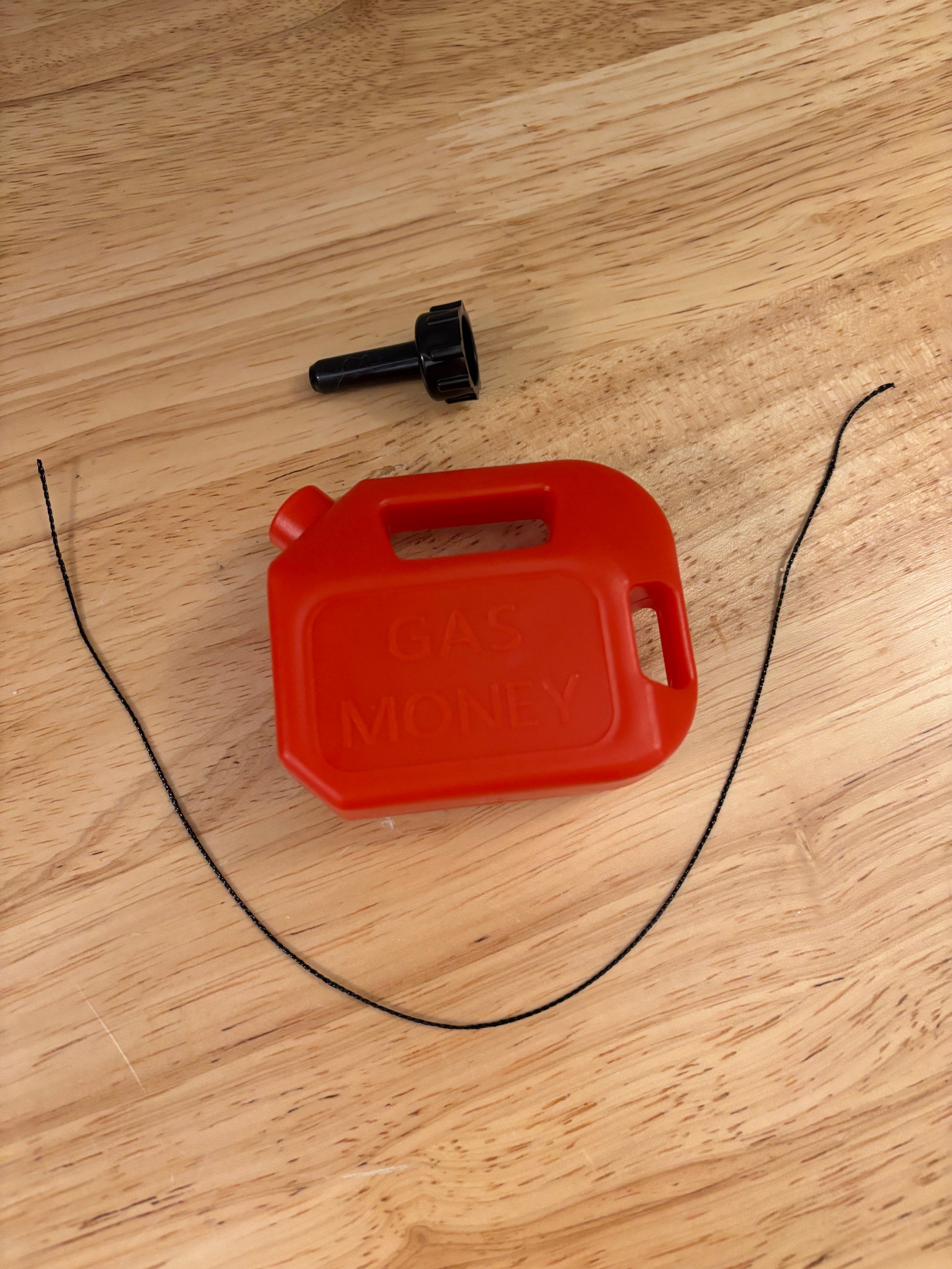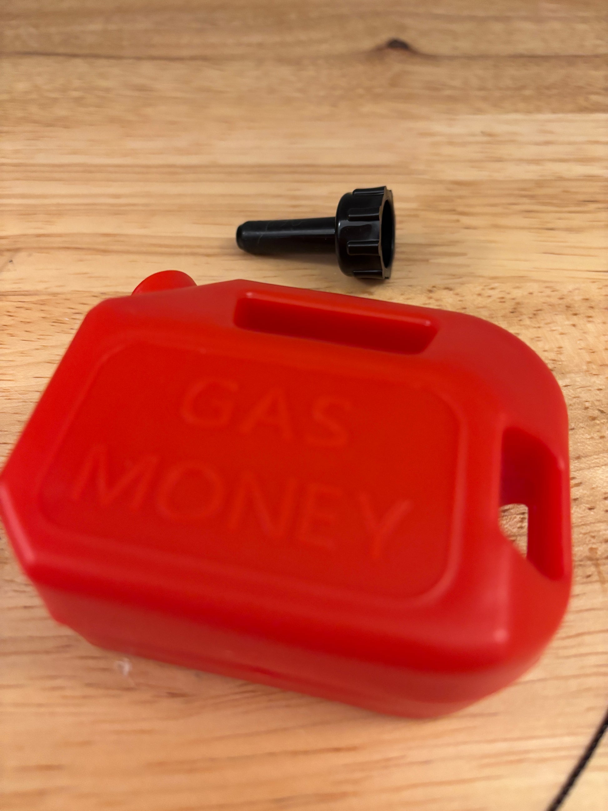 Plastic ornament with Gas Money raised letters on one side of it. You can put a bit of glue on the tip of the red nub for the black nozzle to stay permanently on the red part.