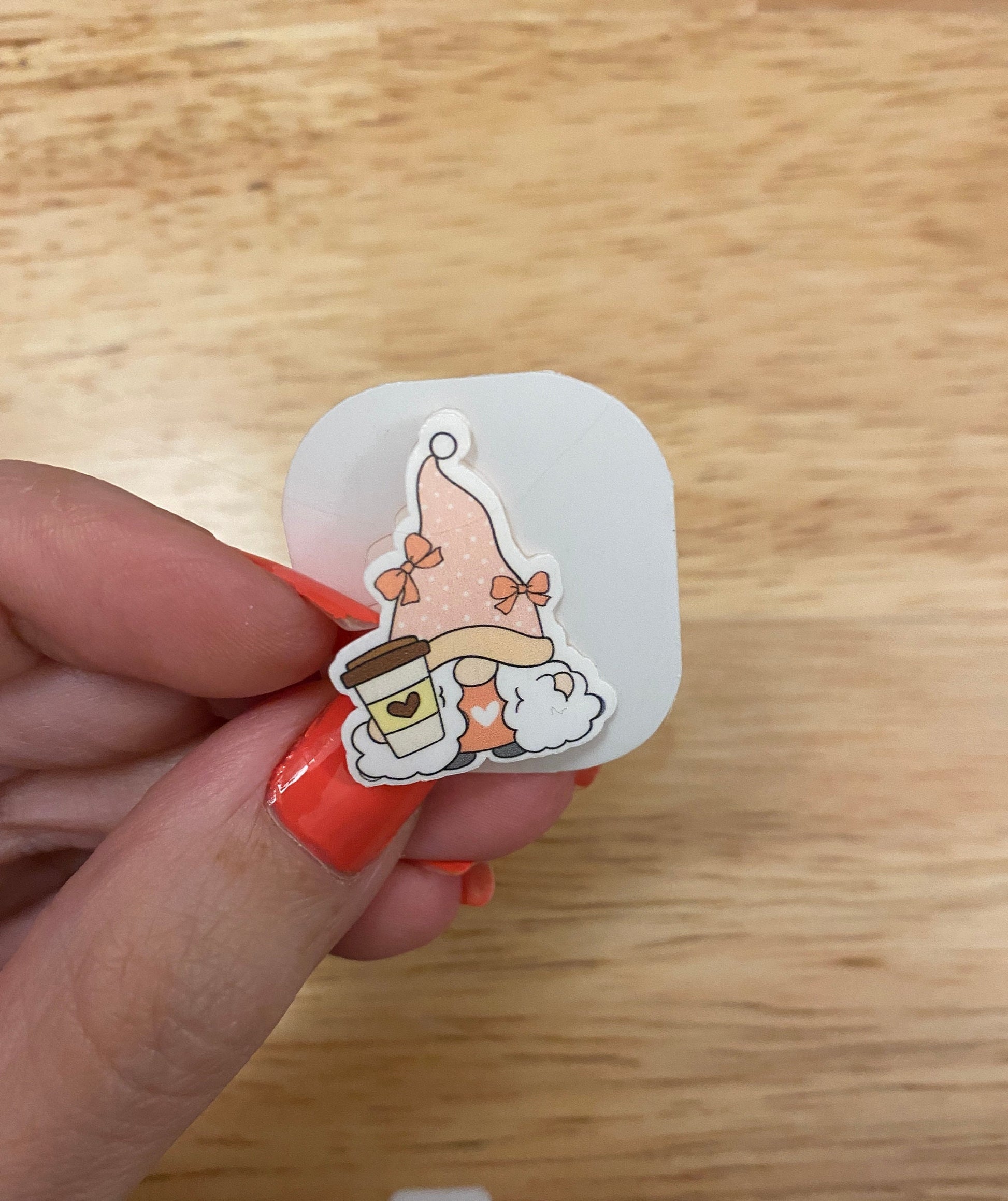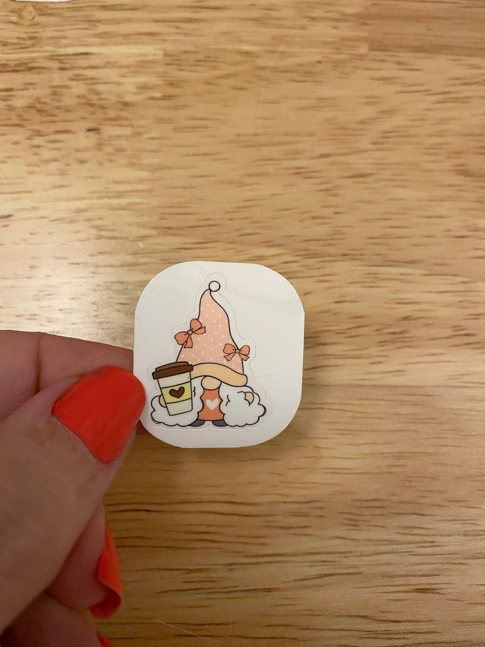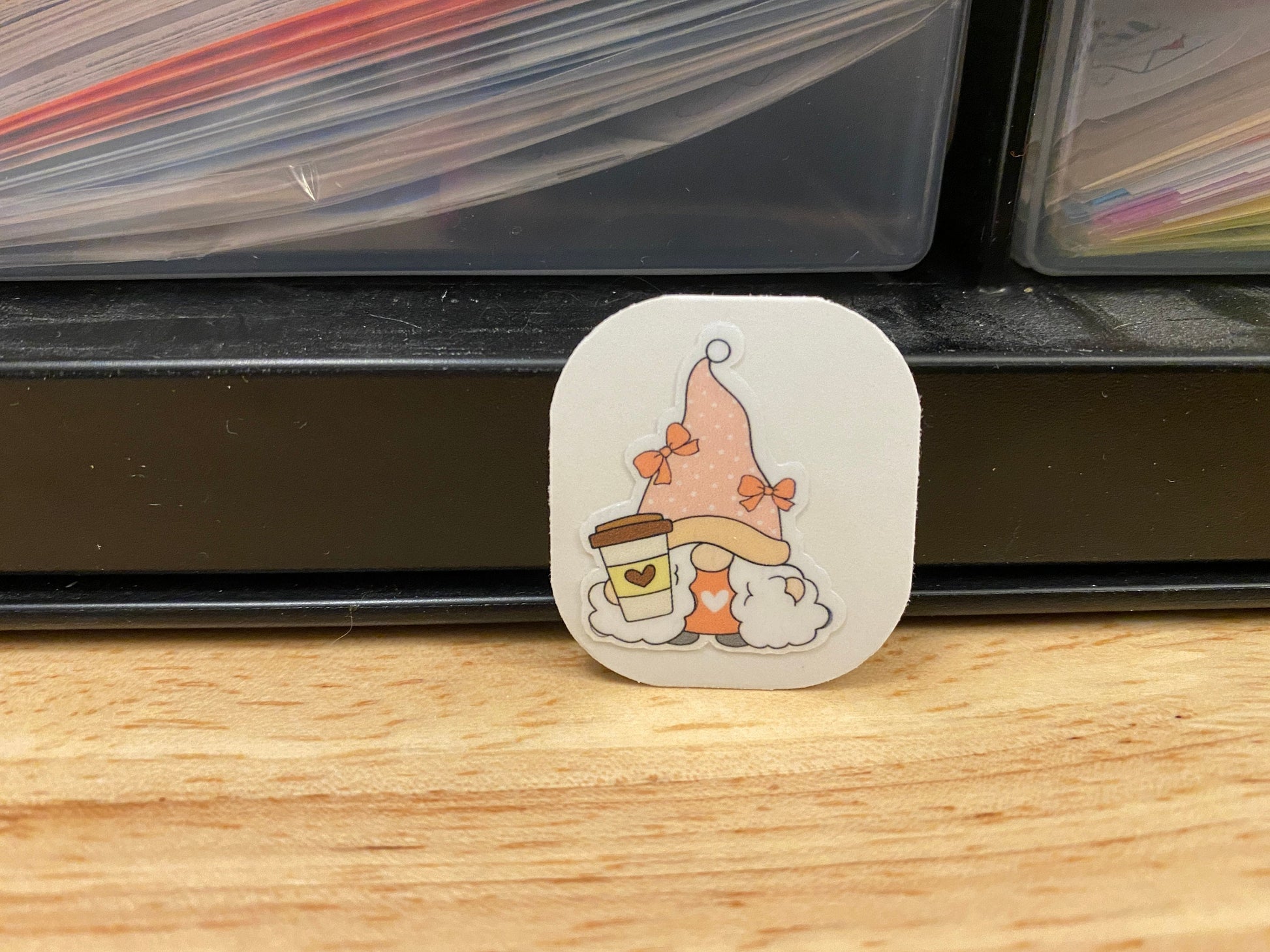 Gnome with Coffee Sticker. Stickers are printed on very strong White Vinyl type of Paper and then cut around each sticker leaving a small white out-lining. They can be added to almost any hard non-textured surface. Great to decorate your laptop.