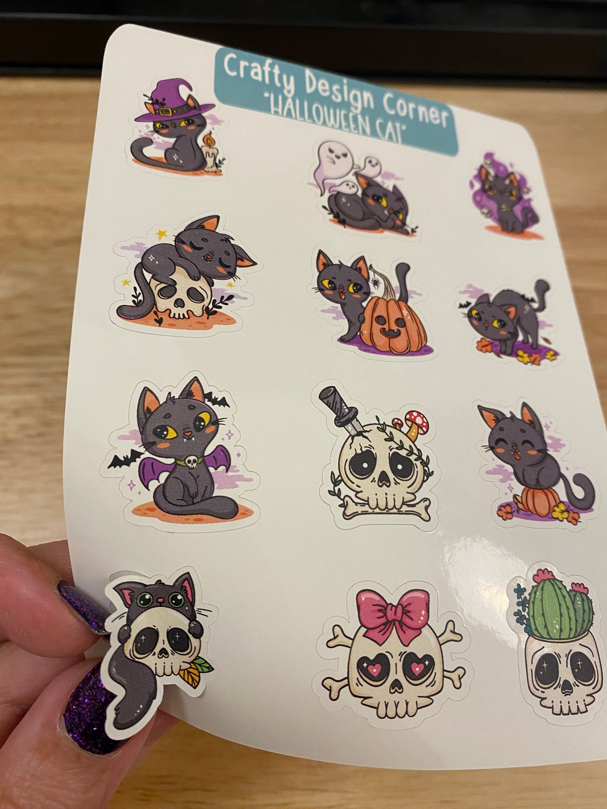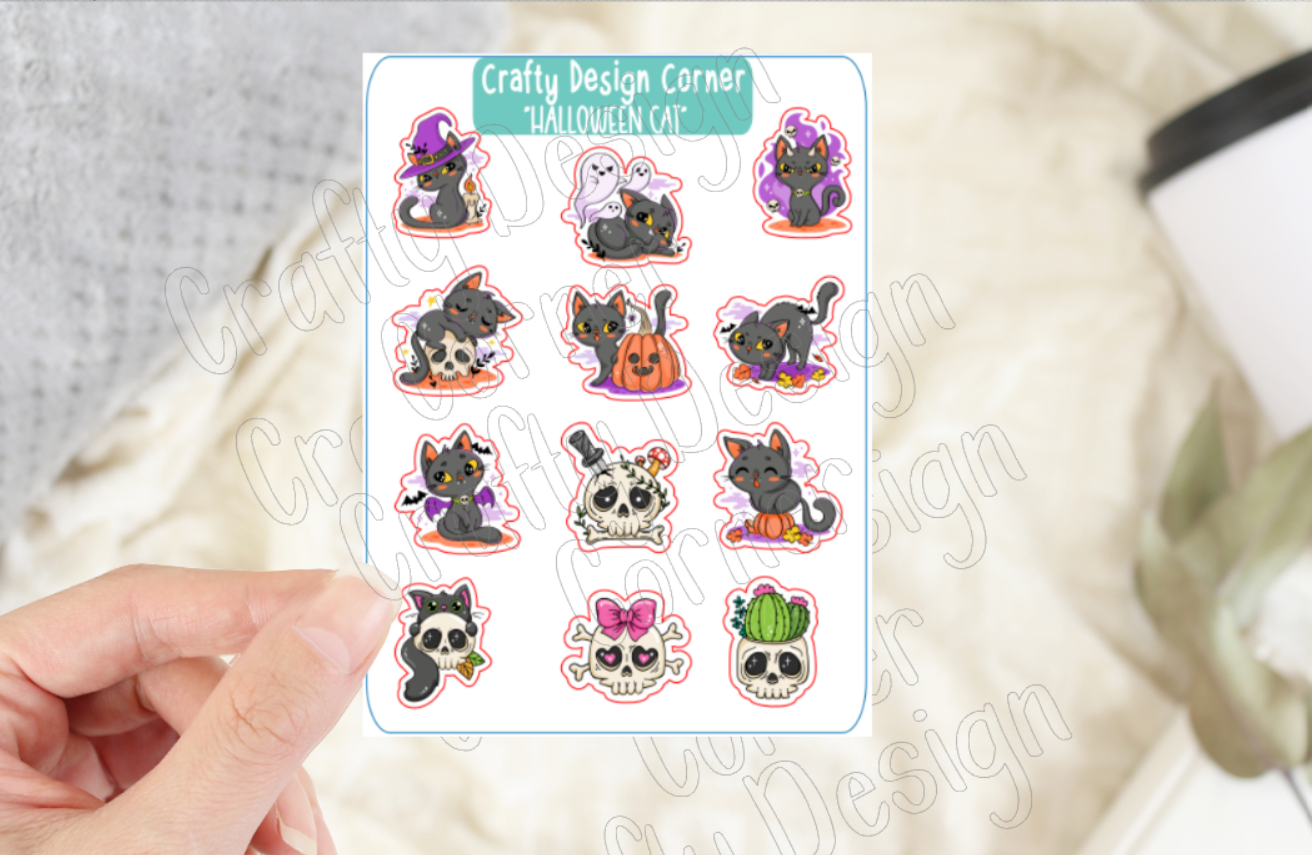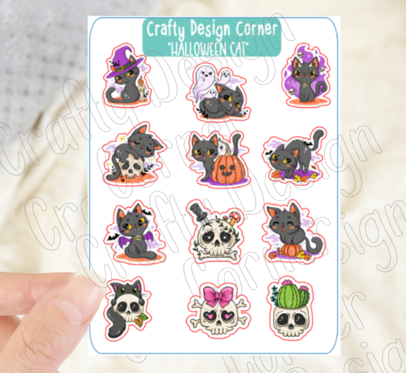 Halloween Cat Sticker sheet, this is printed on White sticker Paper and then cut around each sticker leaving a small white outline. Can add to any hard surface, idea for planners.