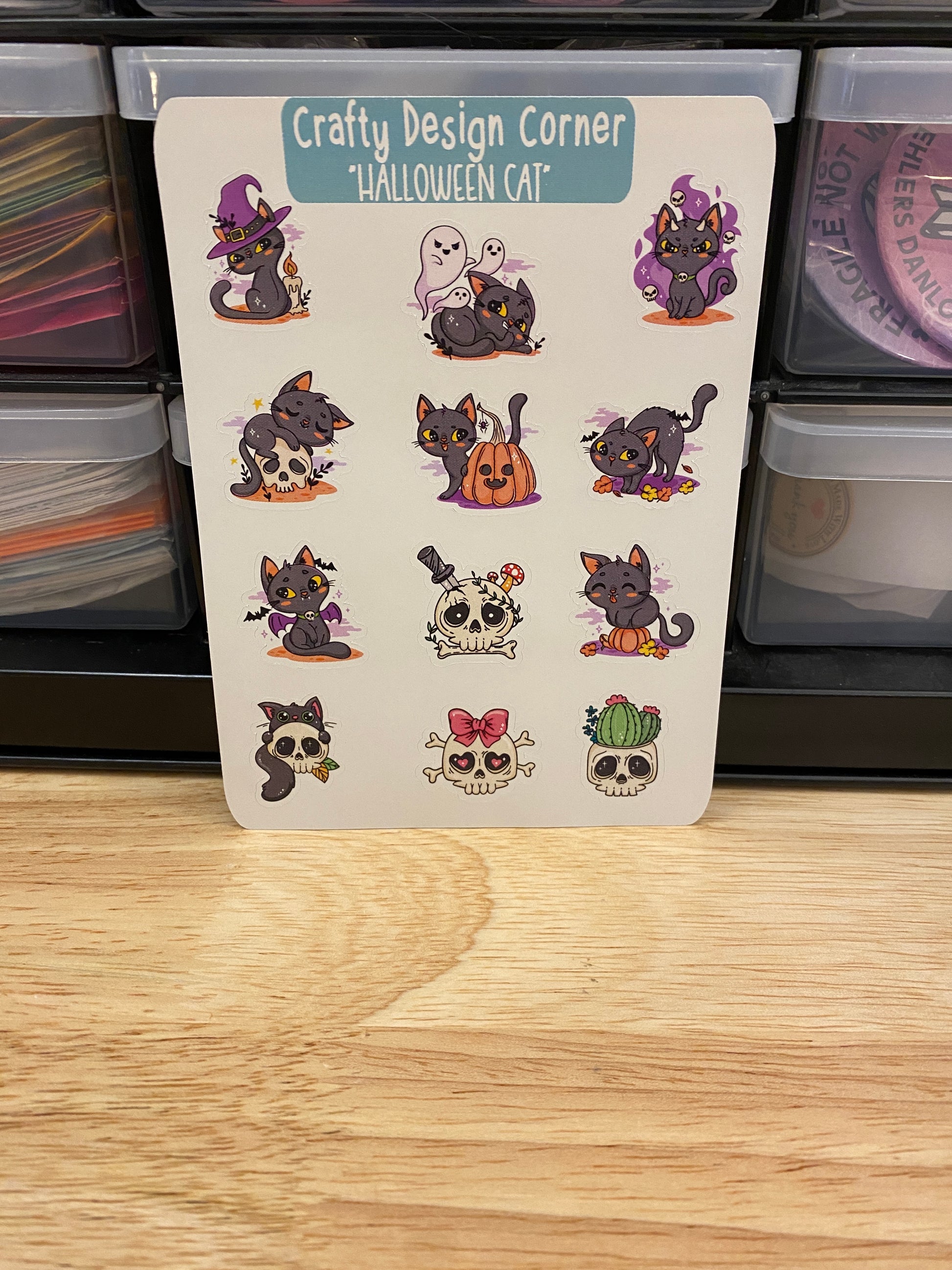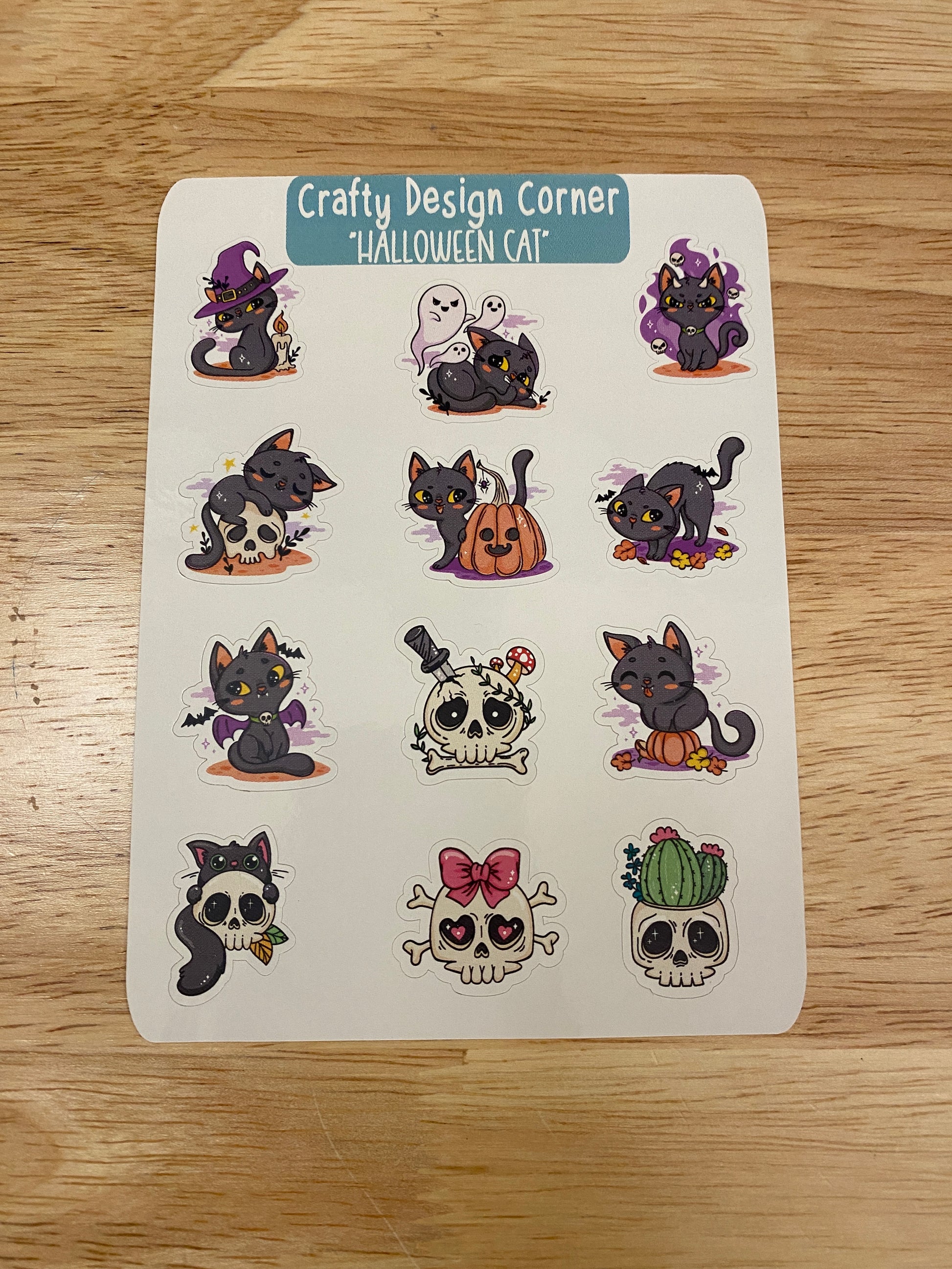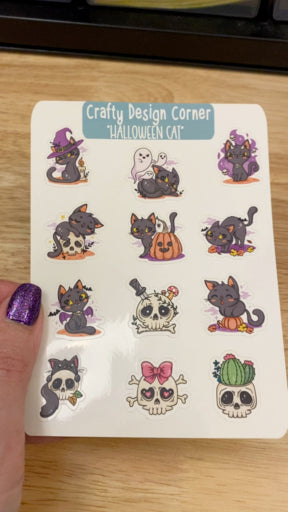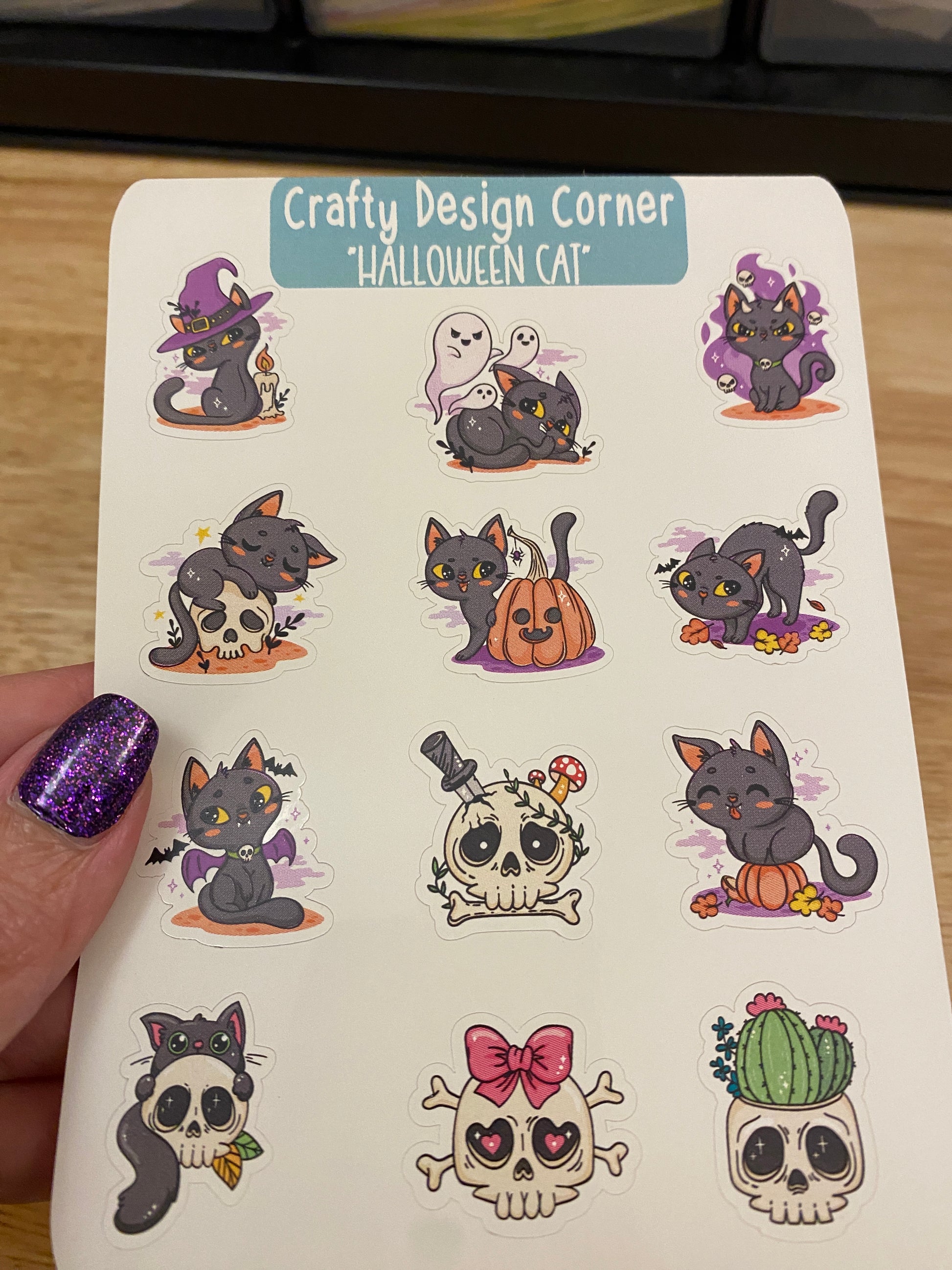 Halloween Cat Sticker sheet, this is printed on White sticker Paper and then cut around each sticker leaving a small white outline. Can add to any hard surface, idea for planners.