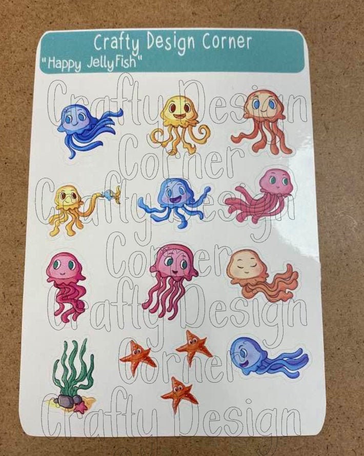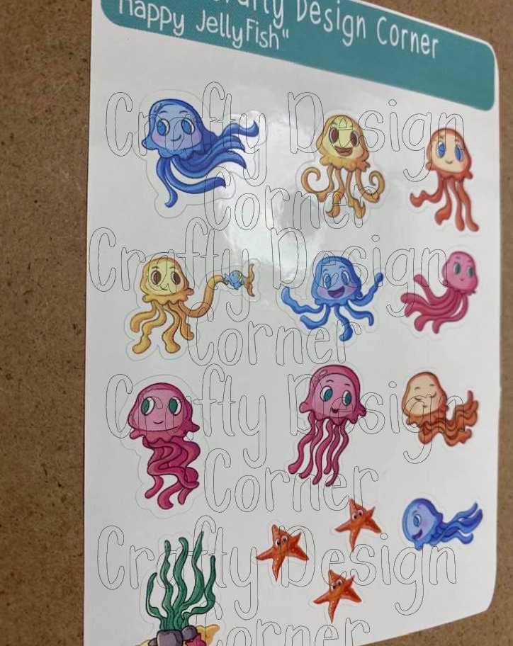 Happy JellyFish STICKER SHEET, this is printed on very strong White Vinyl type of BOPP Paper and then cut around each sticker leaving a small white outline. Can add to any hard surface, idea for planners.