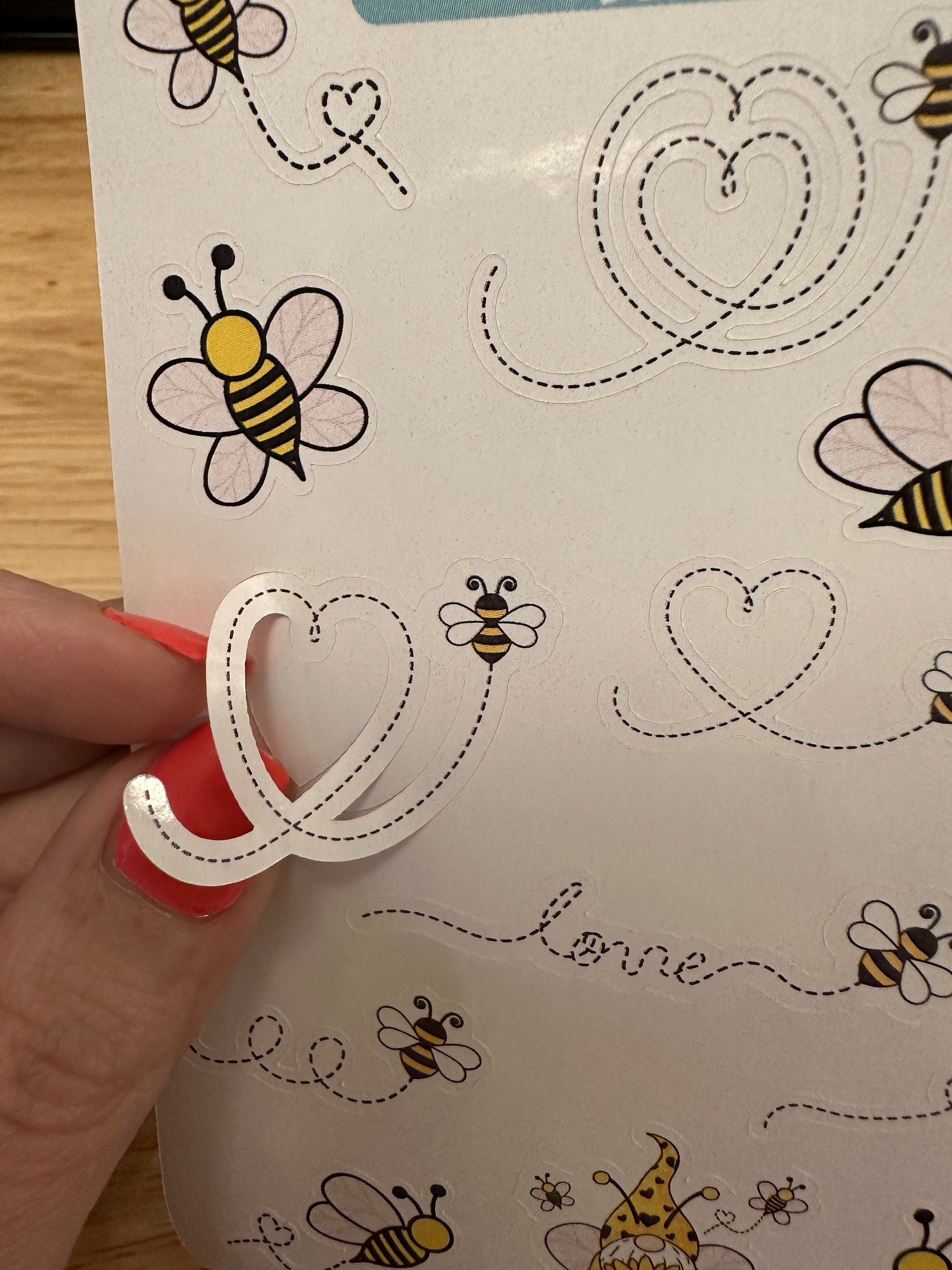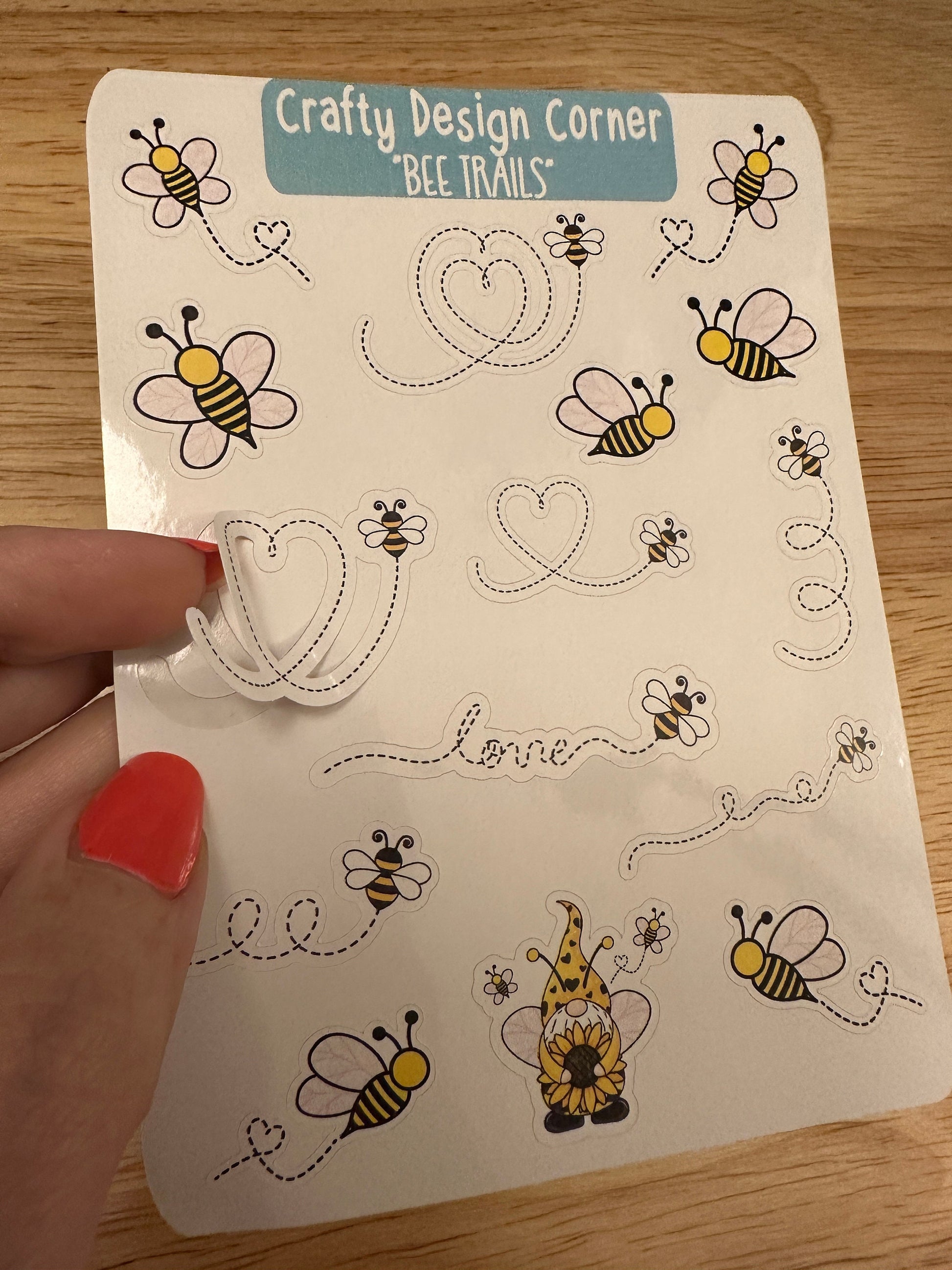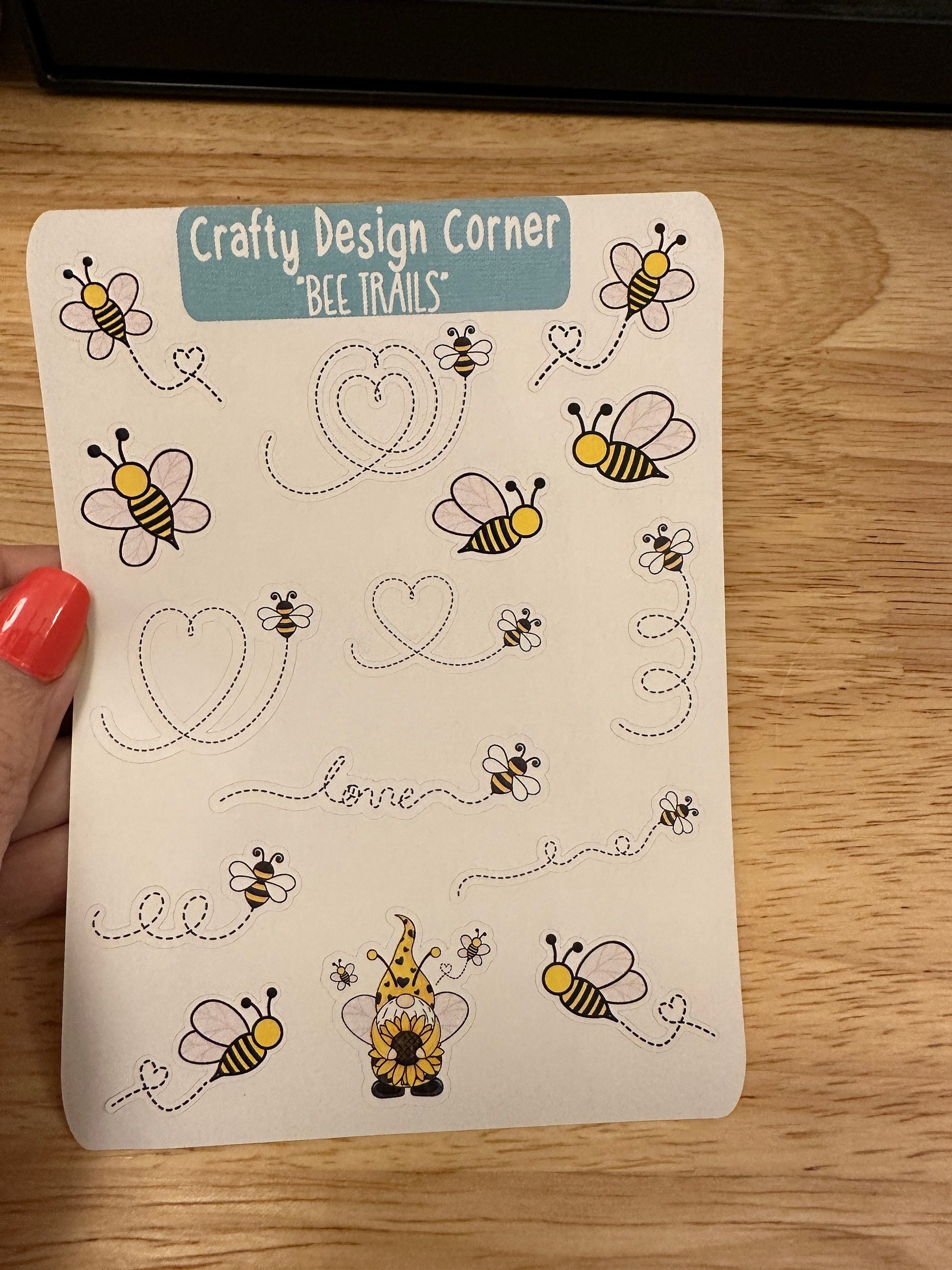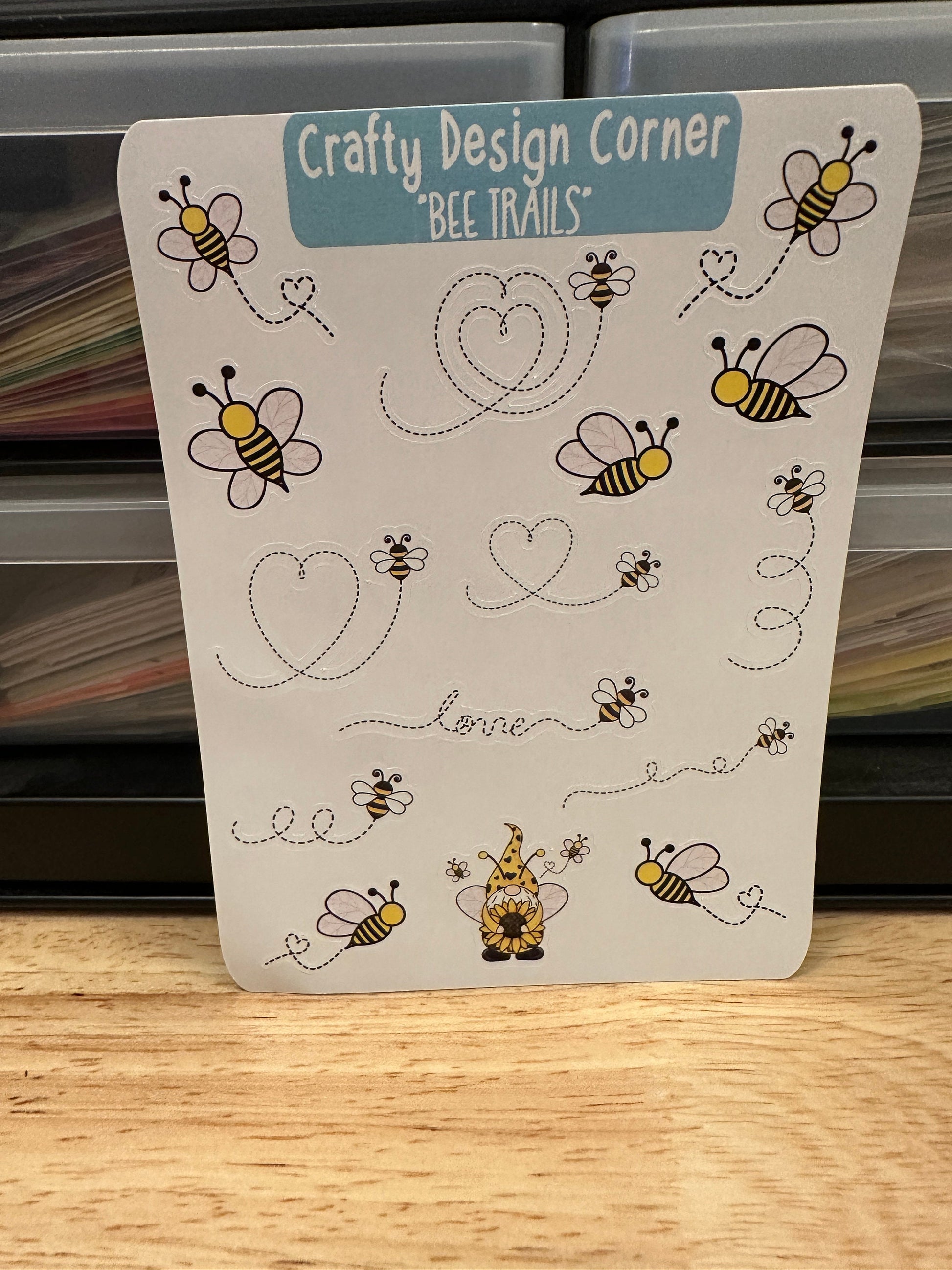 Bee with trail Planner STICKER SHEET, this is printed on White sticker Paper and then cut around each sticker leaving a small white outline. Can add to any hard surface, idea for planners.