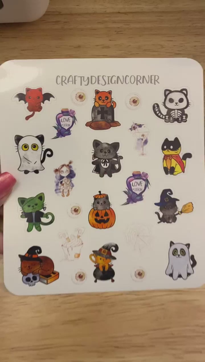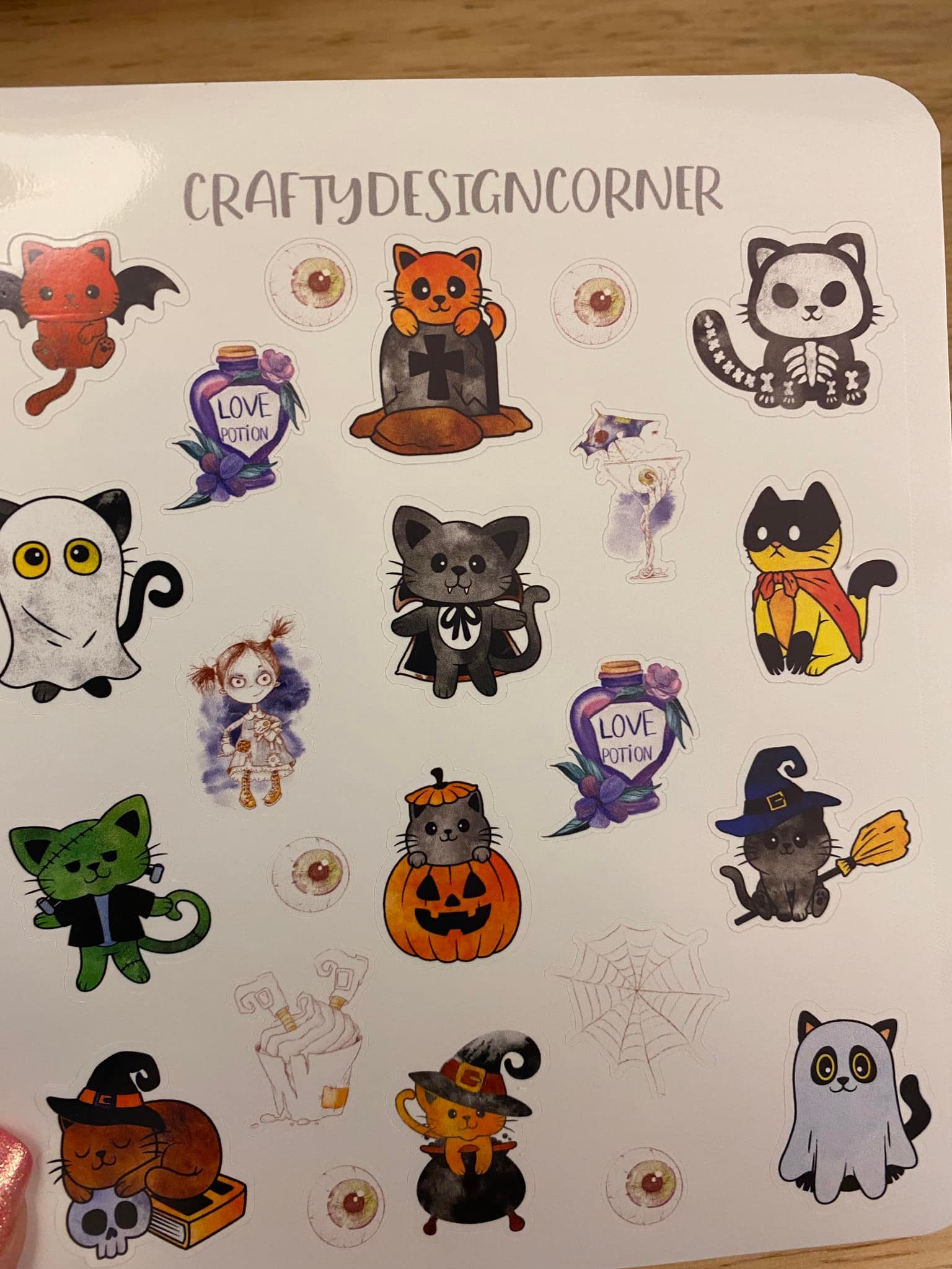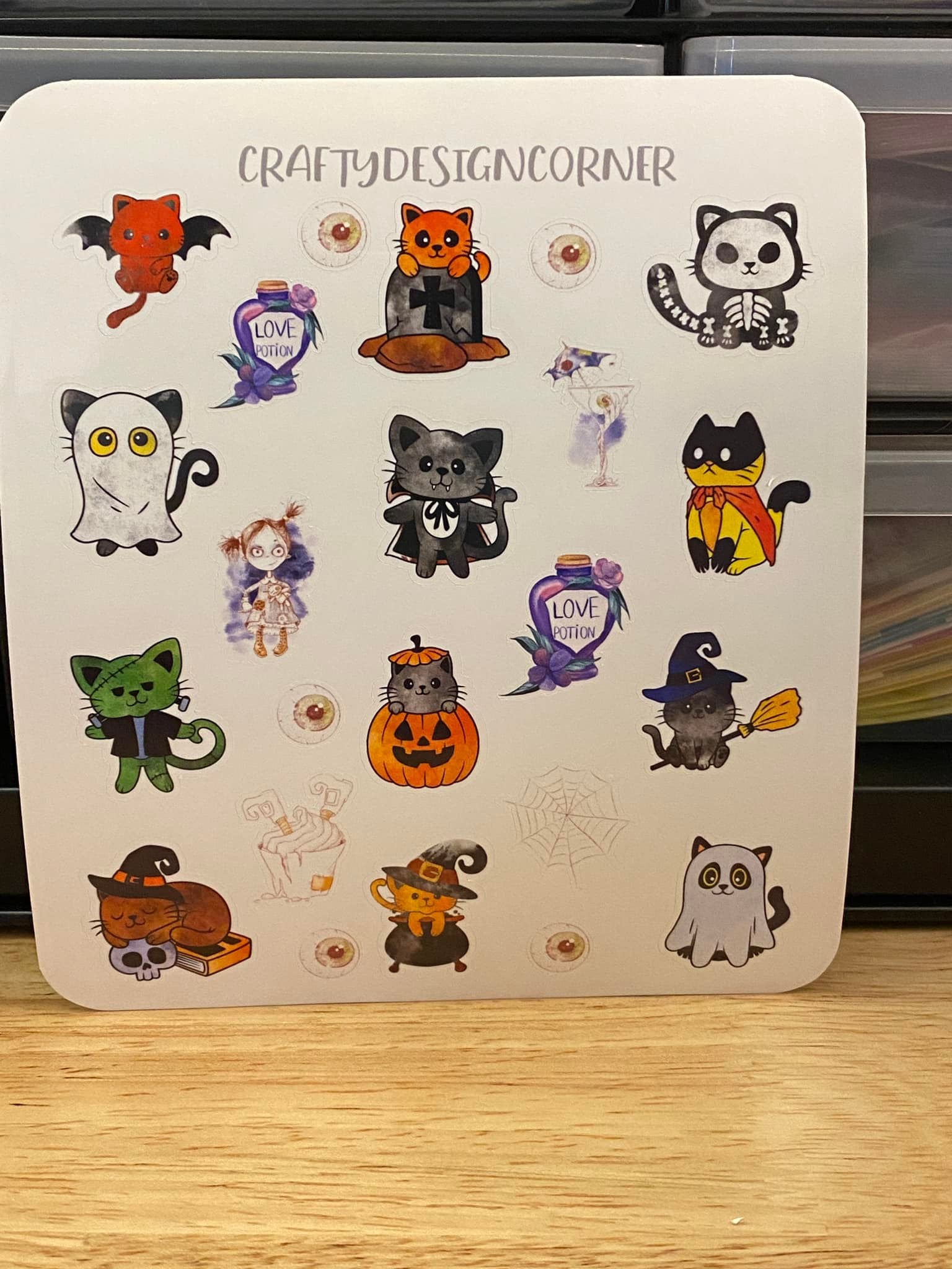 Kitty Cat Halloween Sticker Sheet, this is printed on very strong White Vinyl type of BOPP Paper and then cut around each sticker leaving a small white outline. Can add to any hard surface, idea for planners.