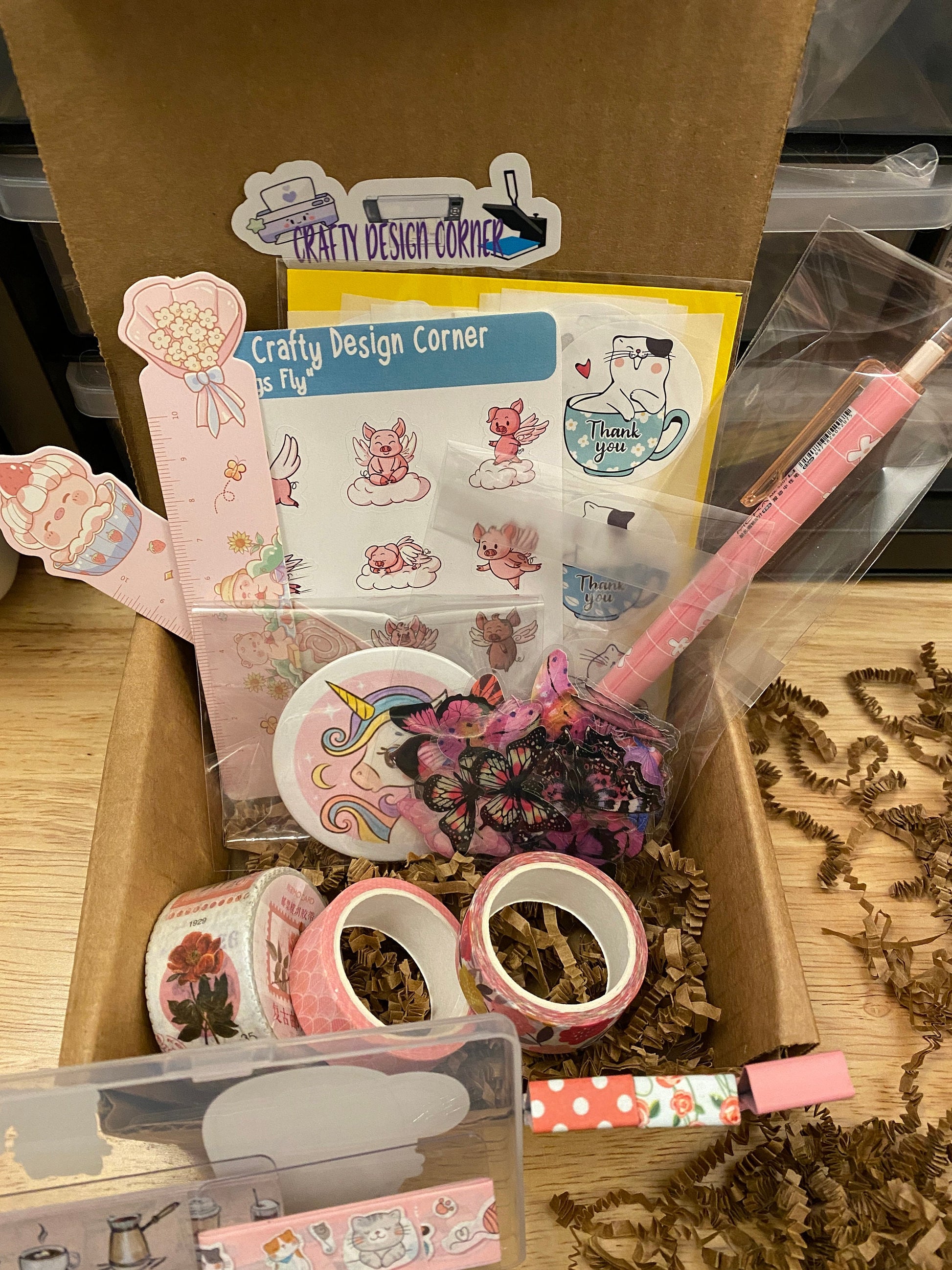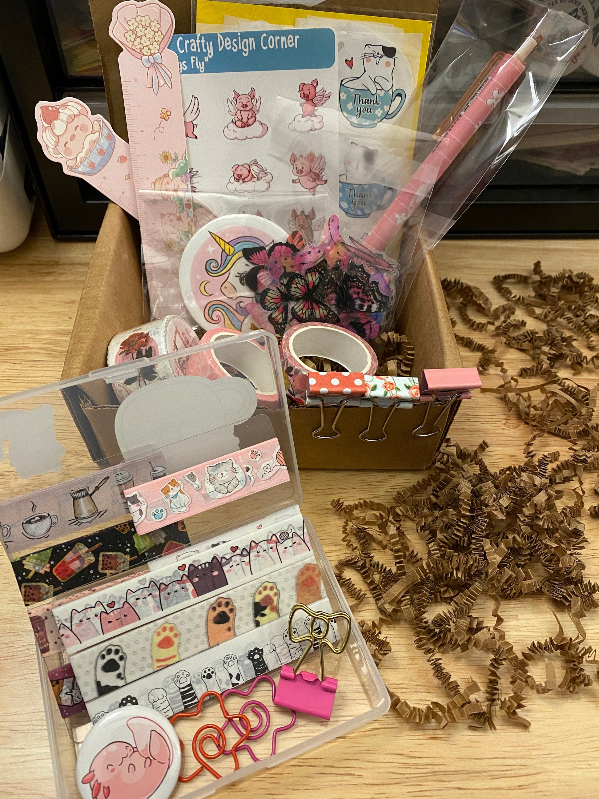 It will come with at least 34 random designed items, however the box will have at least: Washi Tapes, Stickers, Button Pins, Pen, Bookmarks, paper clips, and clamps, and one larger priced item, randomly chosen from our shop.