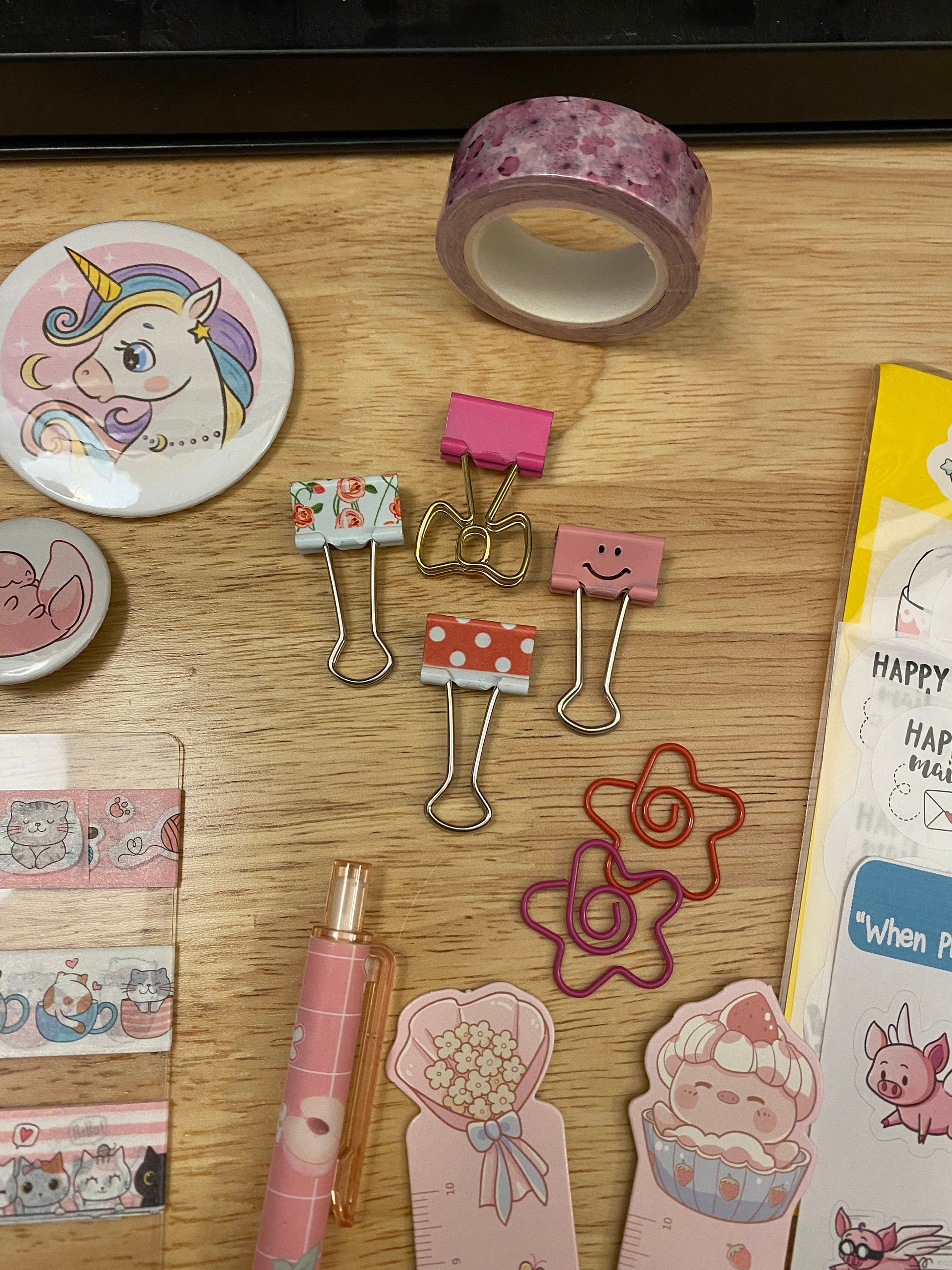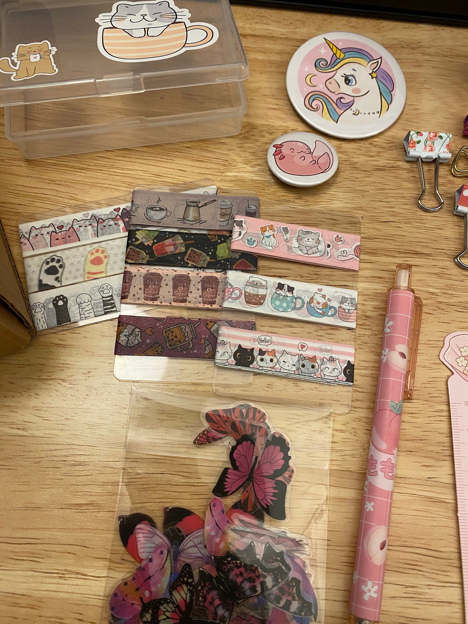 note not all of my items as seen in the picture have a listing yet, like the cute clear stickers, or the Kawaii design ink pens....