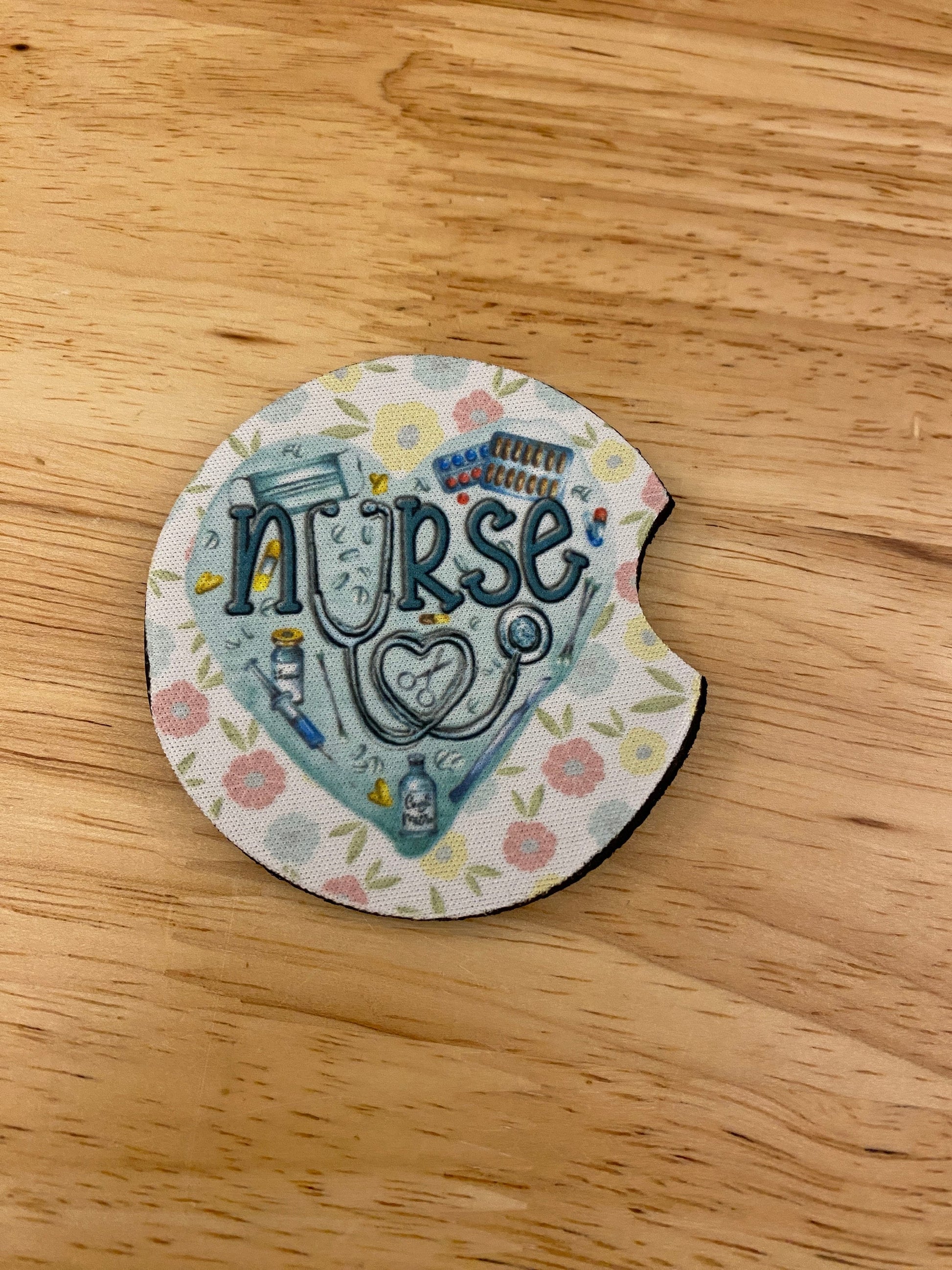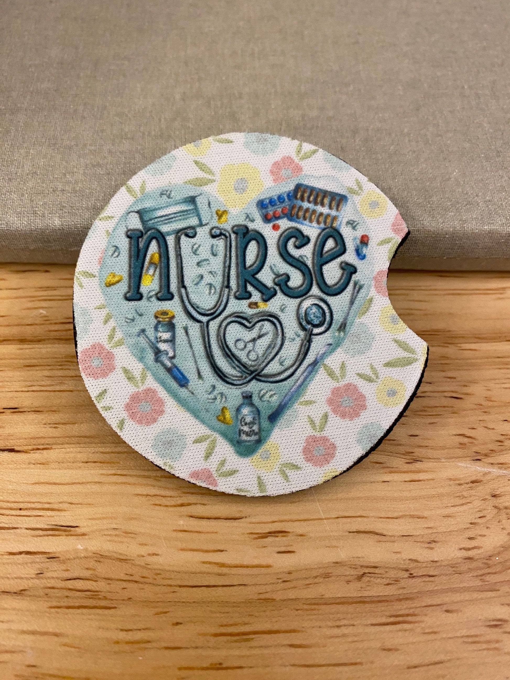 Nurse car coaster, made with a soft polyester top and rubber button, easy to pick up with the indent on side. Fits lost car cup holders. Please verify your cup holder before buying.