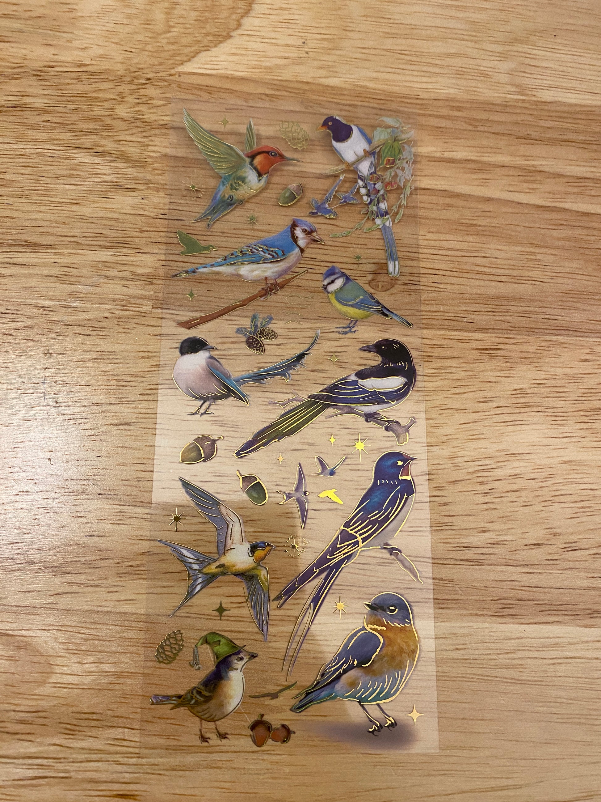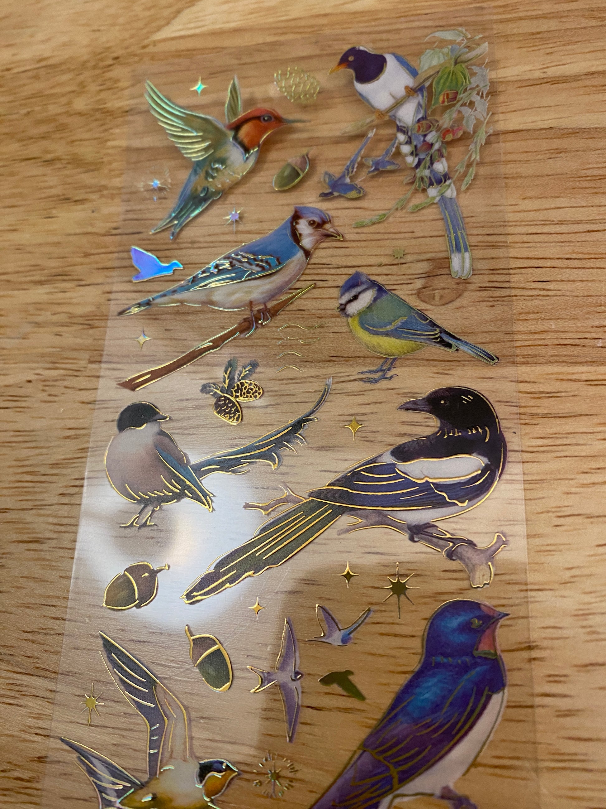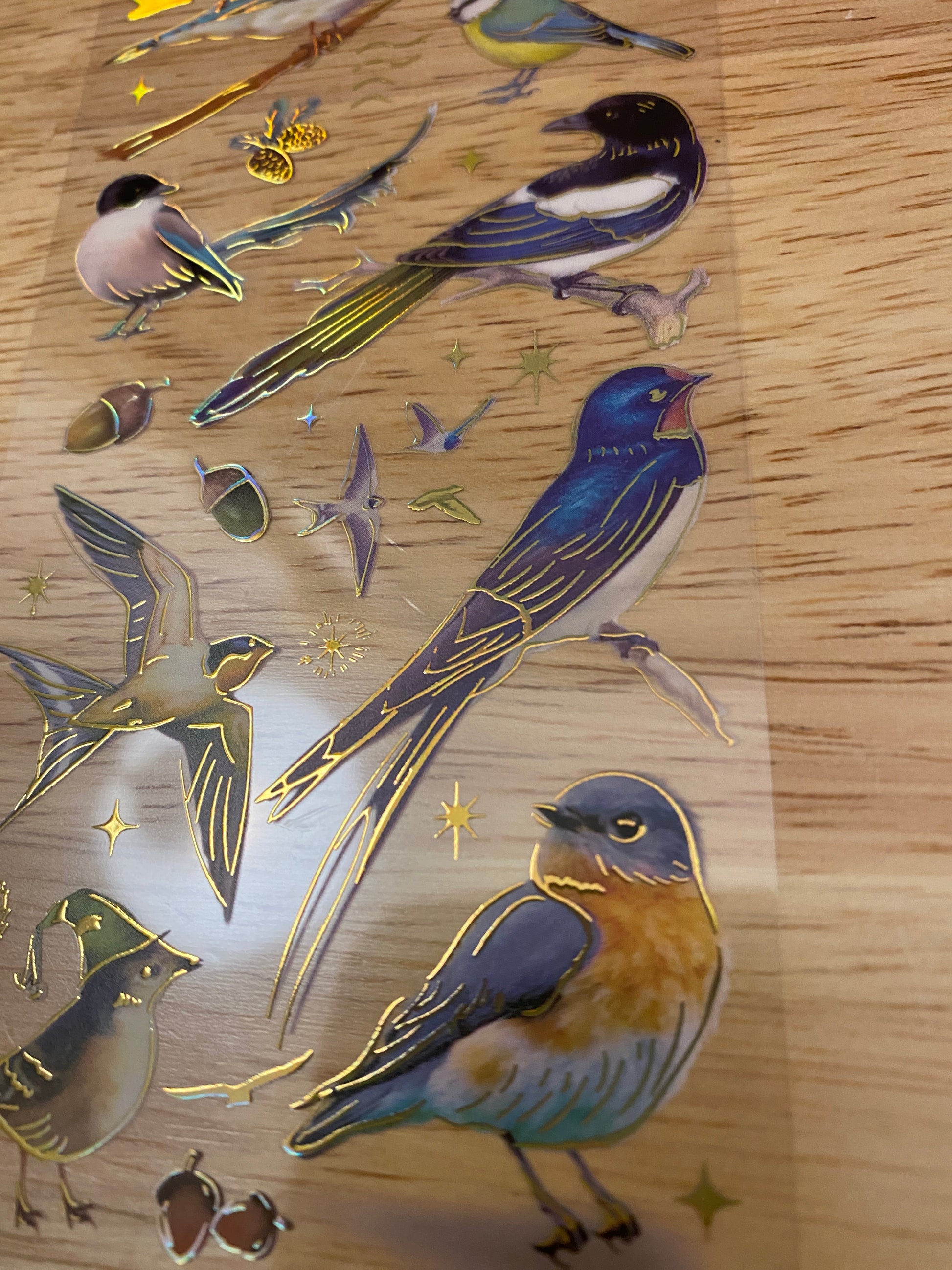 PET Clear Tape with Blue Bird some outlined with Gold Foil. Decorative Sticker Tape For Scrap booking planner, this is not individual stickers, these are all on the washi tape, it has a very pretty Gold Foil raised up look. Tape is easy to cut with and you can cut out each Feather.