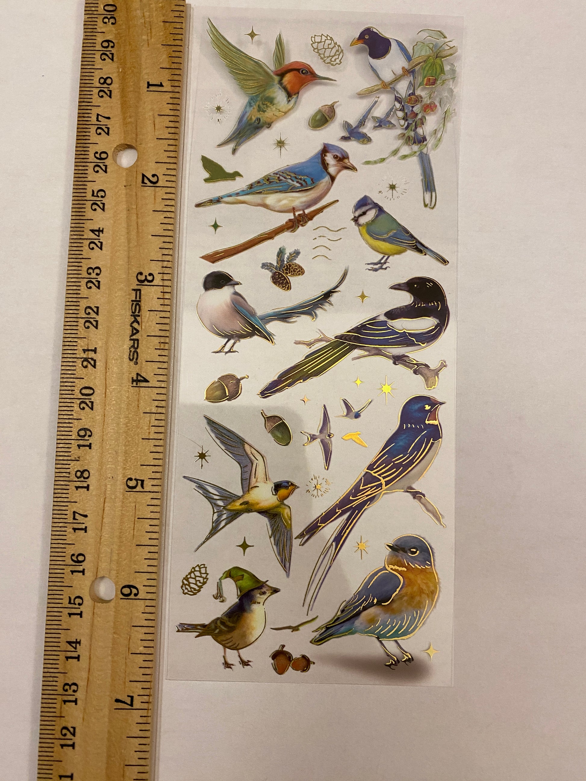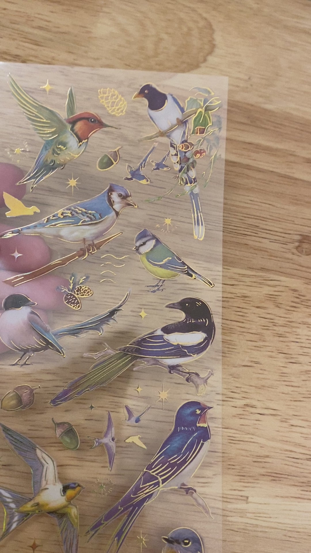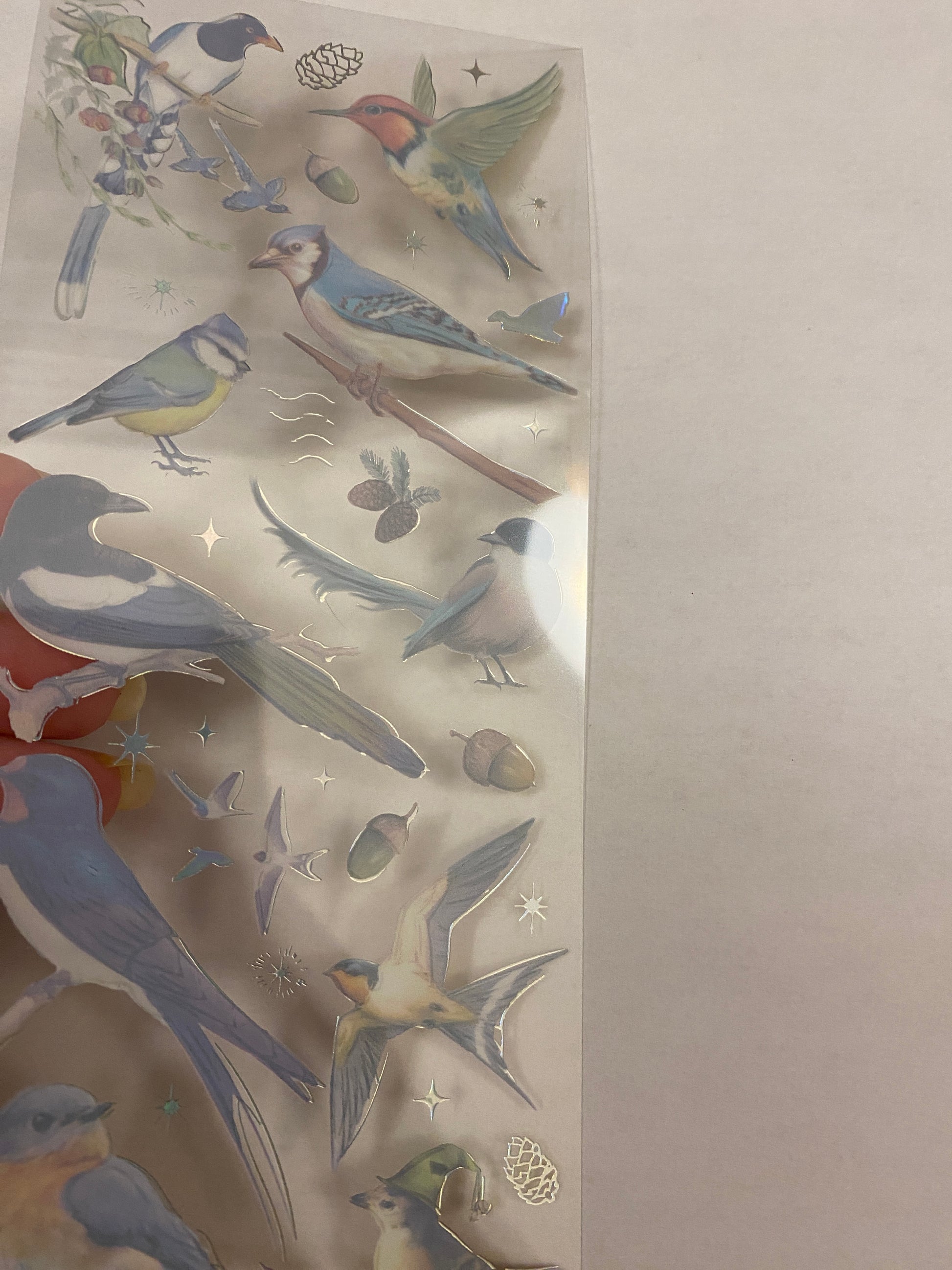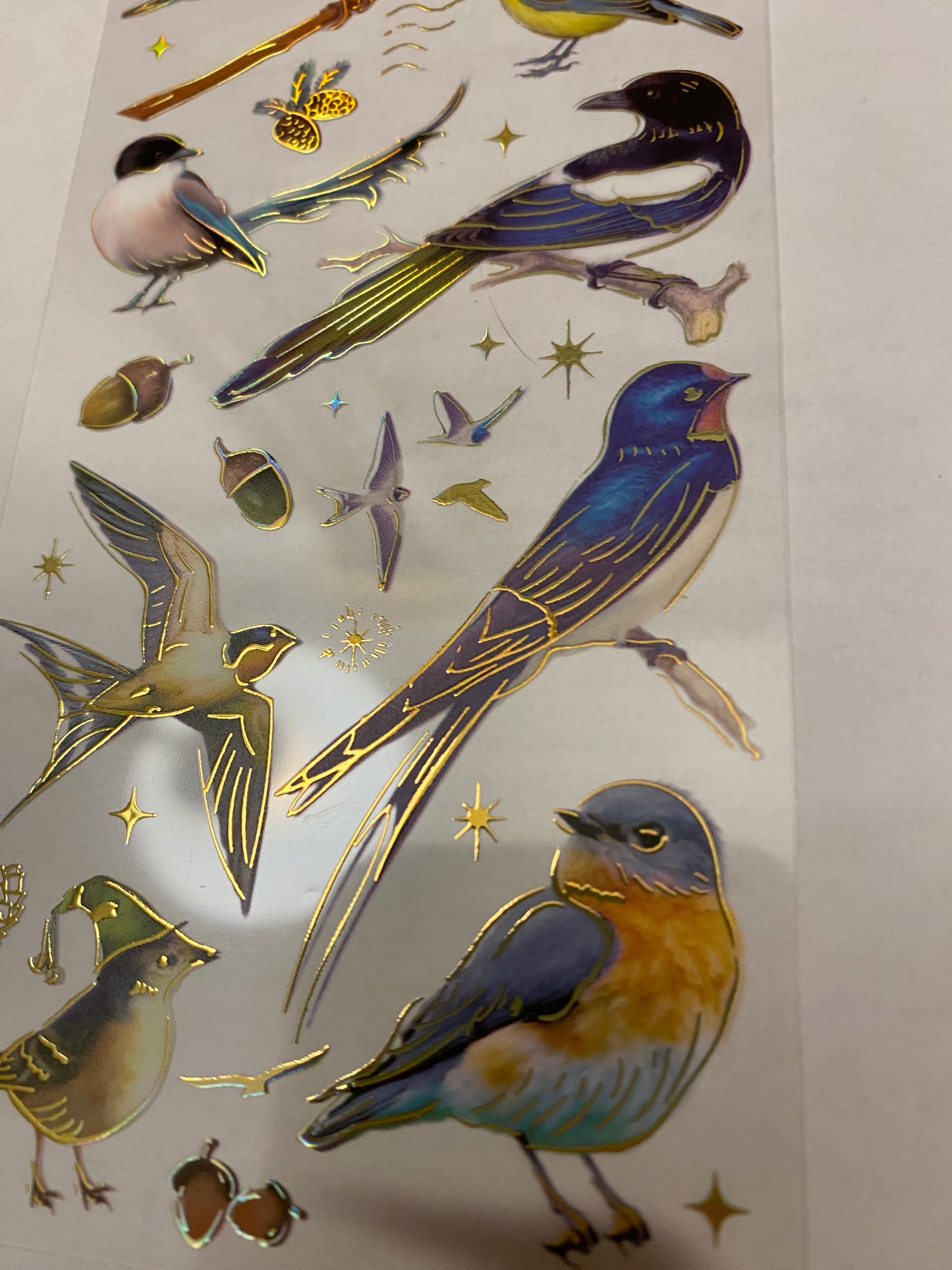 PET Clear Tape with Blue Bird some outlined with Gold Foil. Decorative Sticker Tape For Scrap booking planner, this is not individual stickers, these are all on the washi tape, it has a very pretty Gold Foil raised up look. Tape is easy to cut with and you can cut out each Feather.