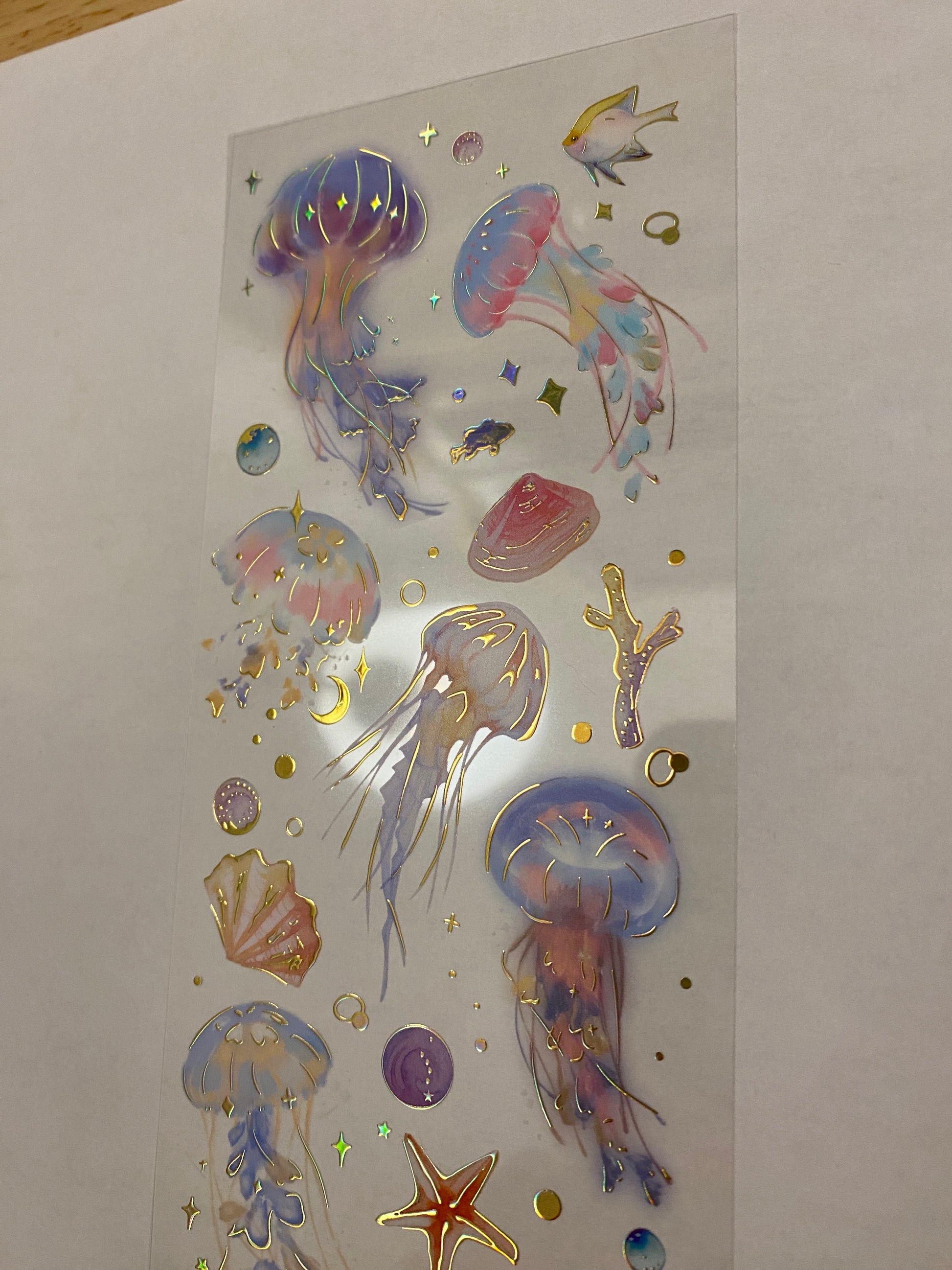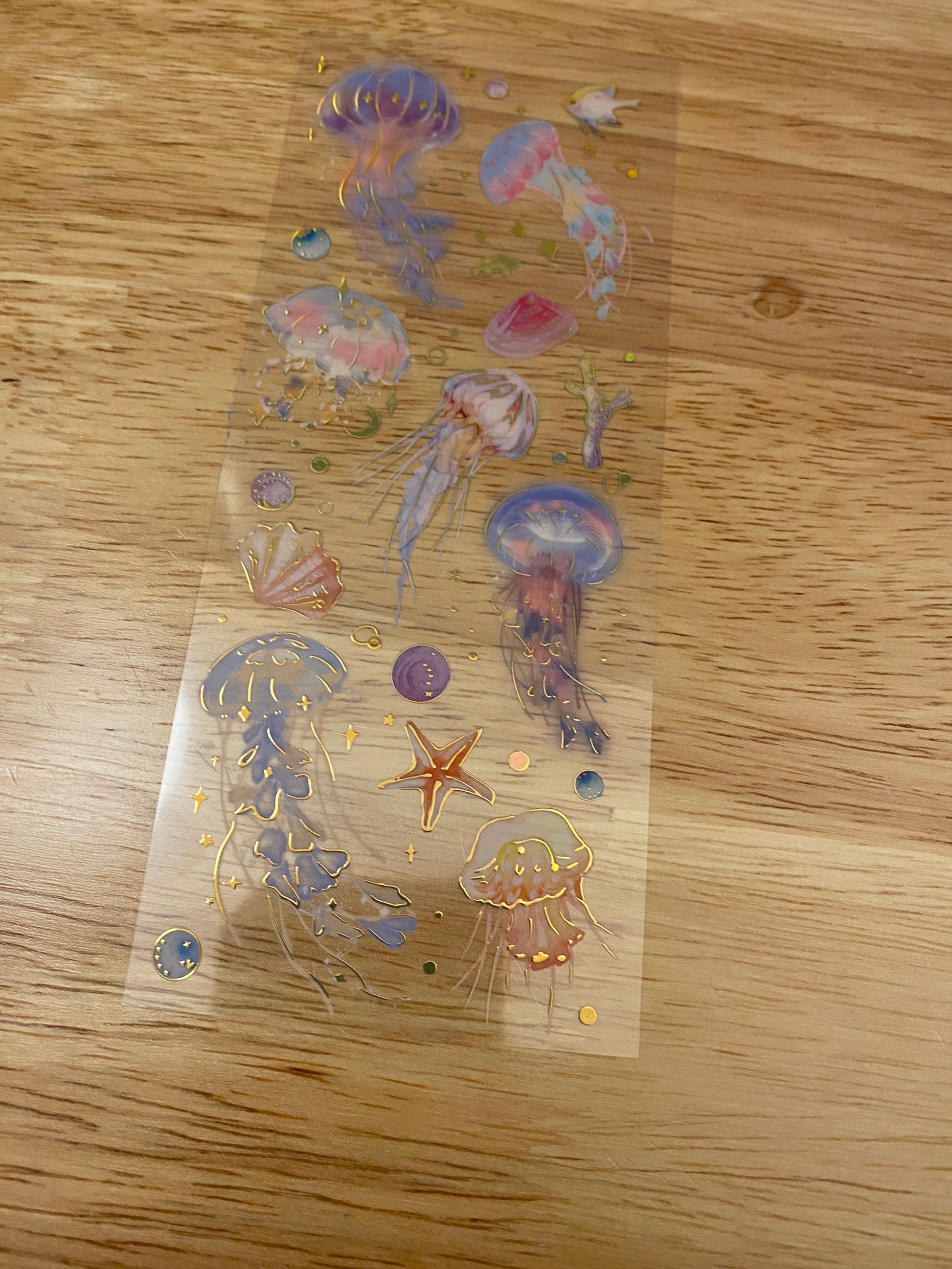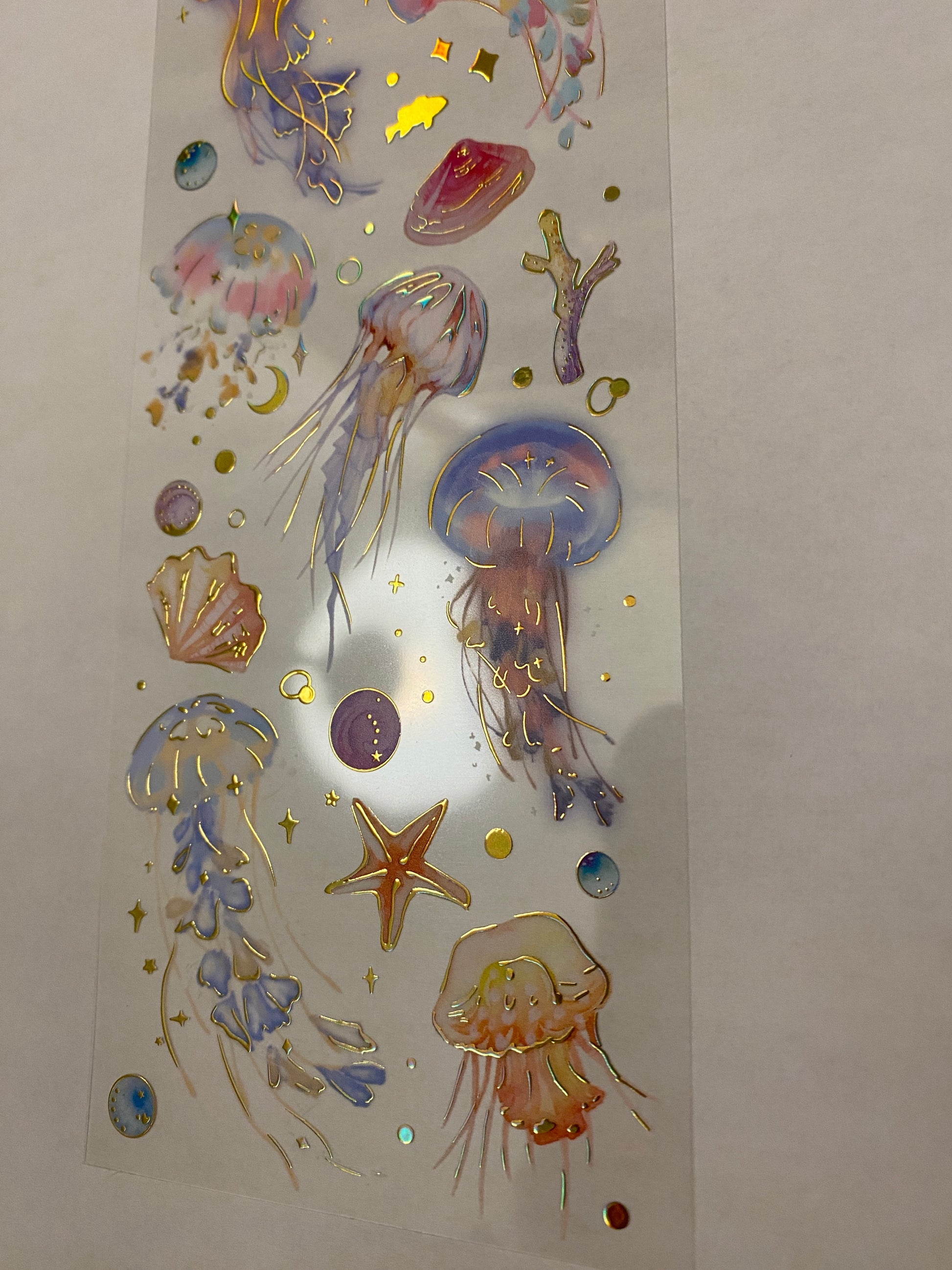 PET Clear Tape with Blue Ombre Ocean some outlined with Gold Foil. Decorative Sticker Tape For Scrap booking planner, this is not individual stickers, these are all on the washi tape, it has a very pretty Gold Foil raised up look. Tape is easy to cut with and you can cut out each Feather.