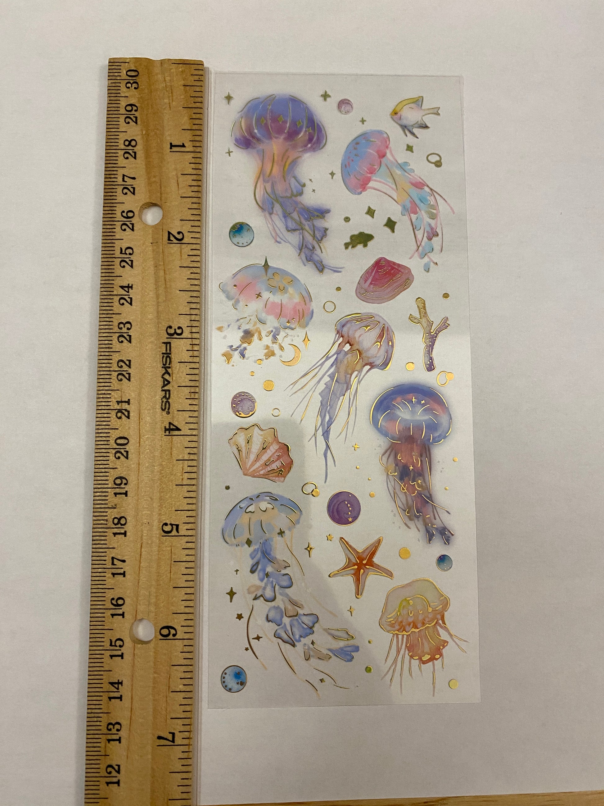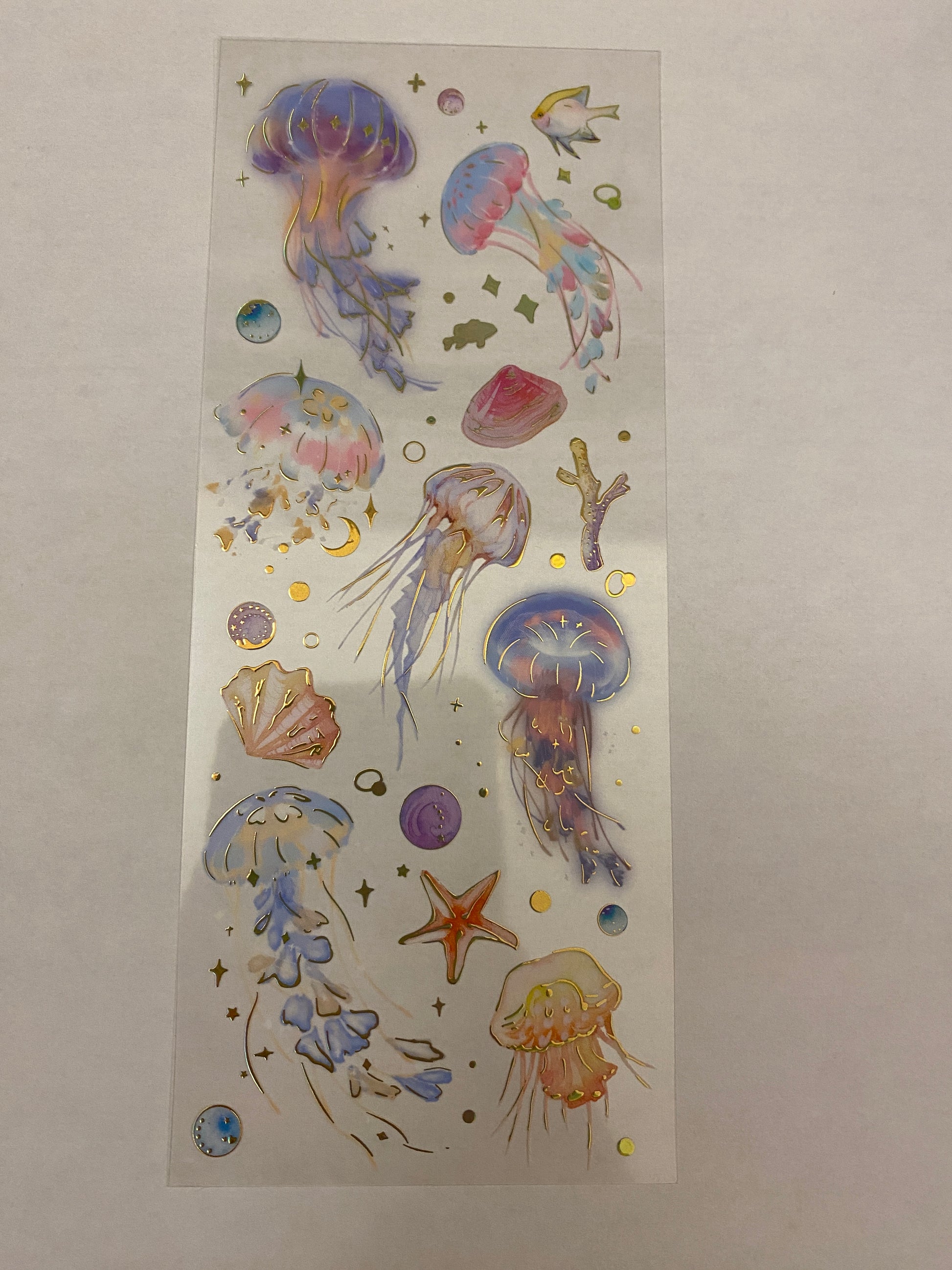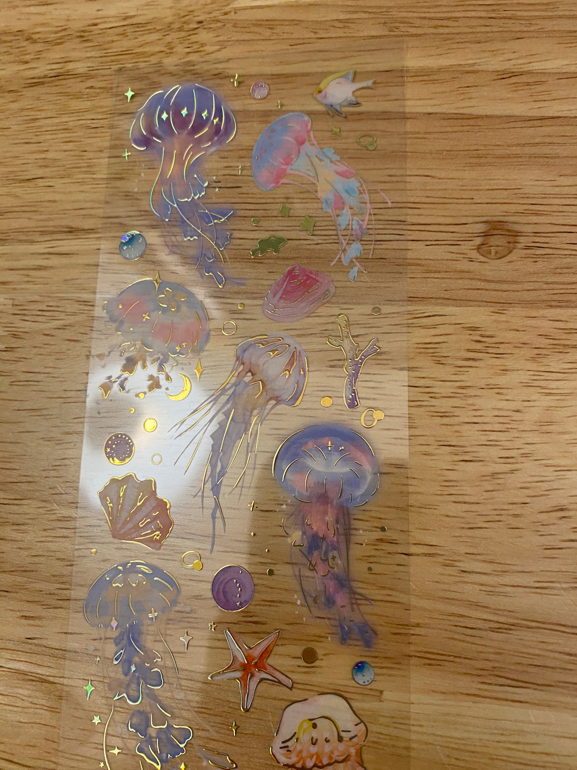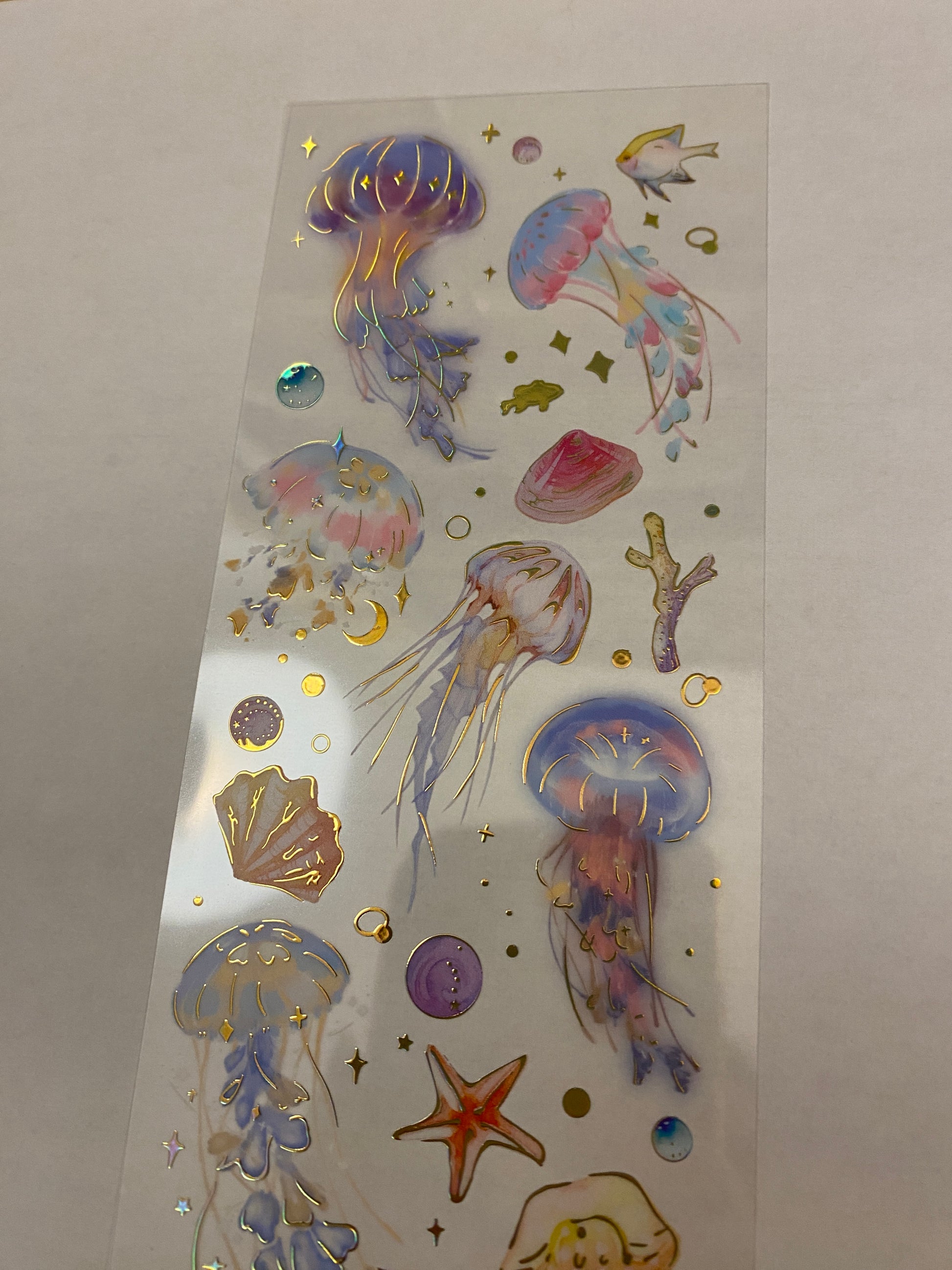 PET Clear Tape with Blue Ombre Ocean some outlined with Gold Foil. Decorative Sticker Tape For Scrap booking planner, this is not individual stickers, these are all on the washi tape, it has a very pretty Gold Foil raised up look. Tape is easy to cut with and you can cut out each Feather.