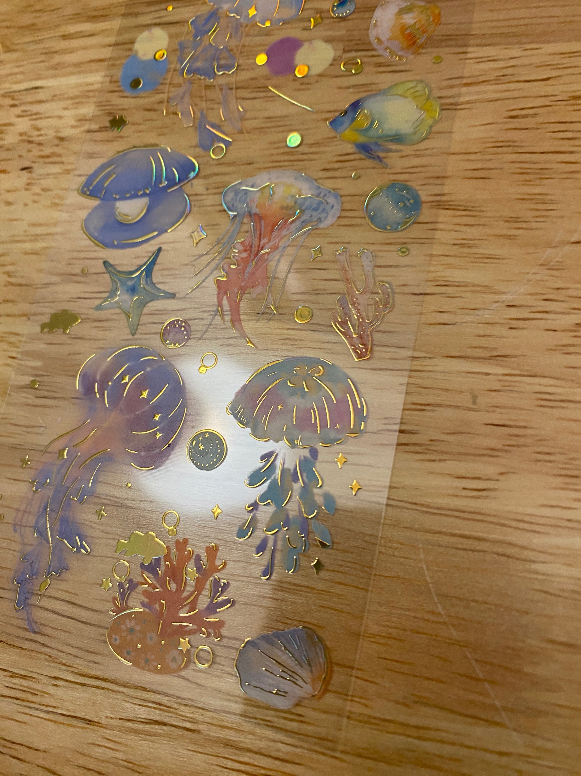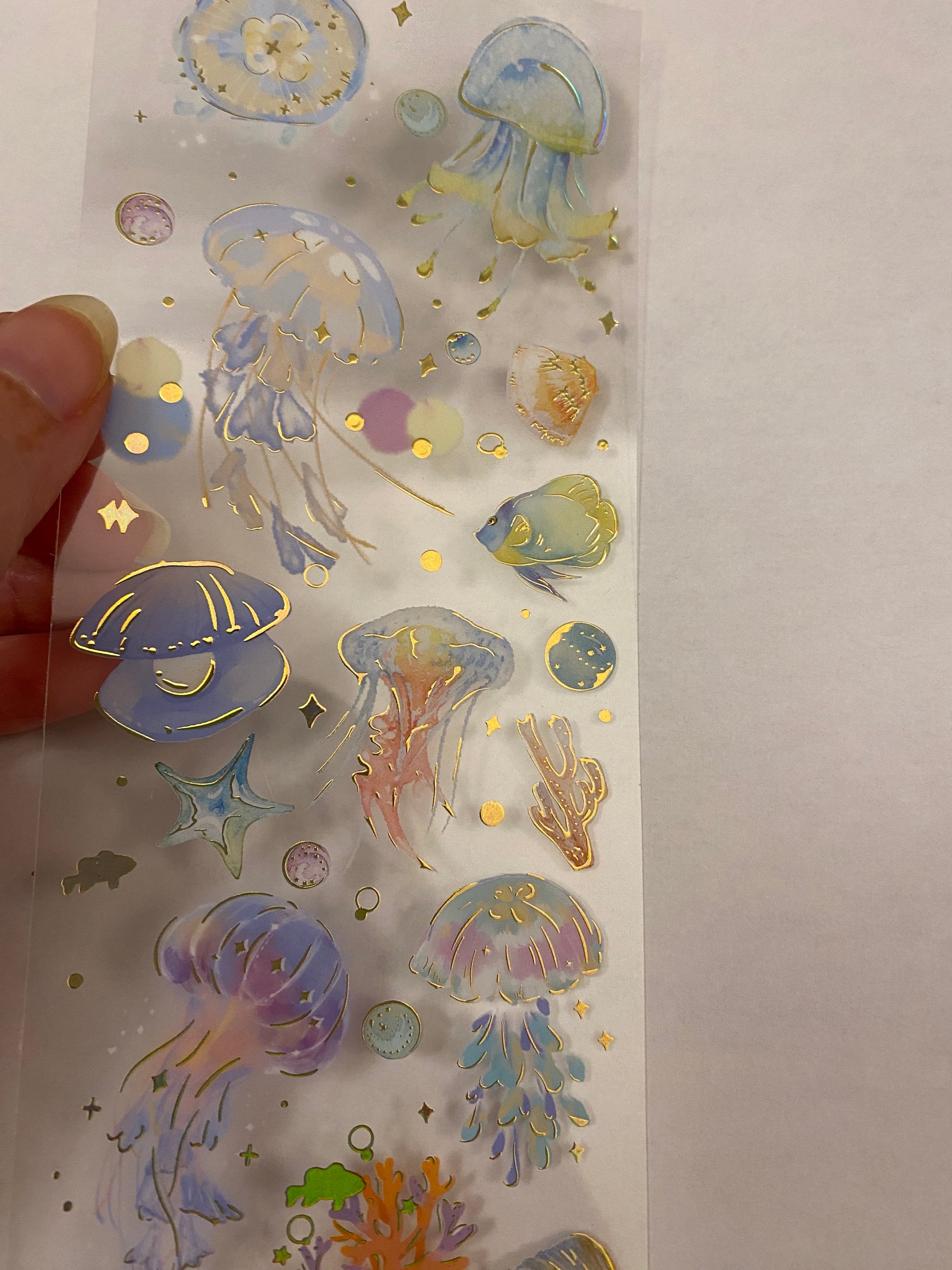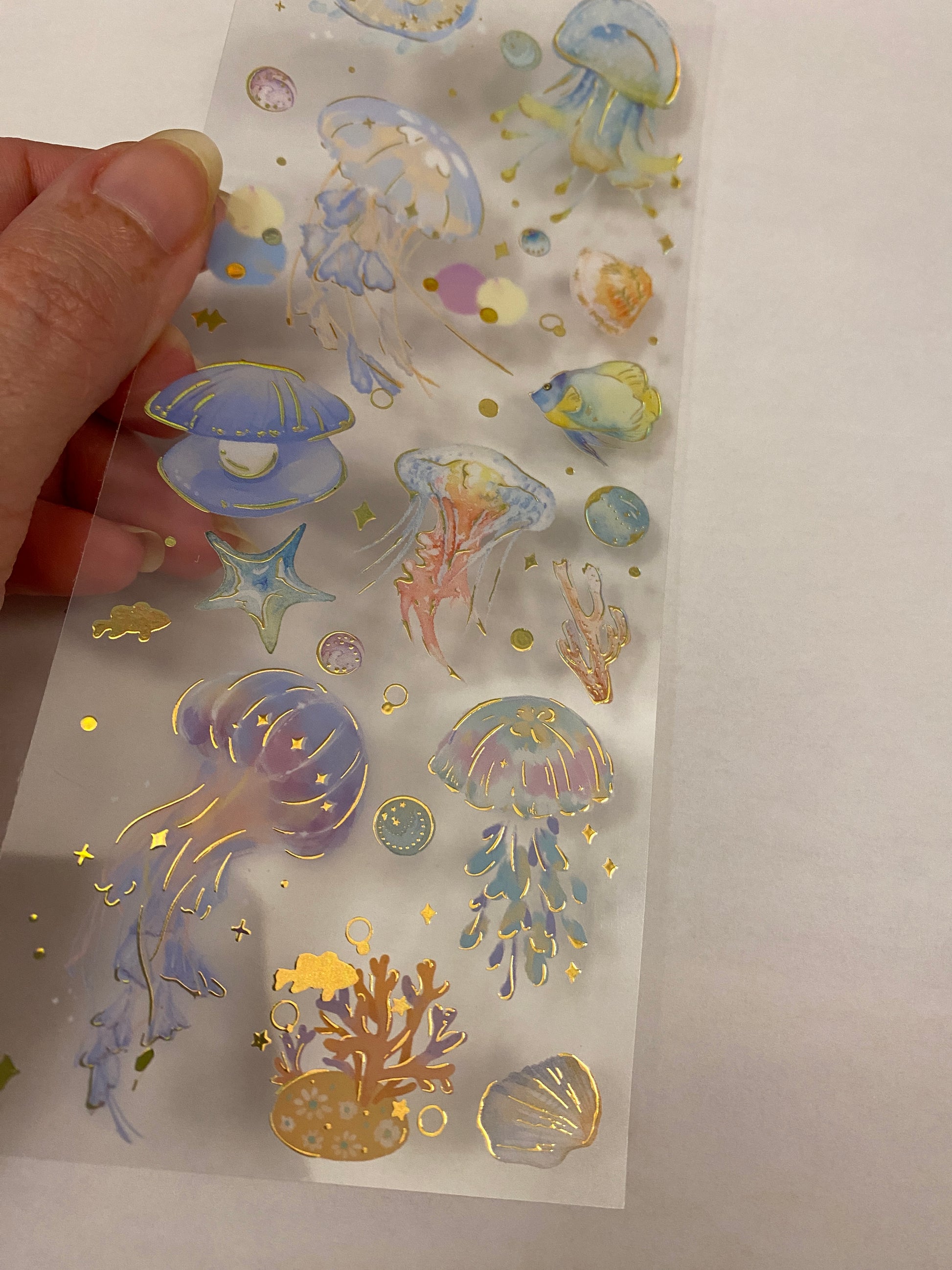 PET Clear Tape with Blue Ombre Ocean some outlined with Gold Foil. Decorative Sticker Tape For Scrap booking planner, this is not individual stickers, these are all on the washi tape, it has a very pretty Gold Foil raised up look. Tape is easy to cut with and you can cut out each Feather.